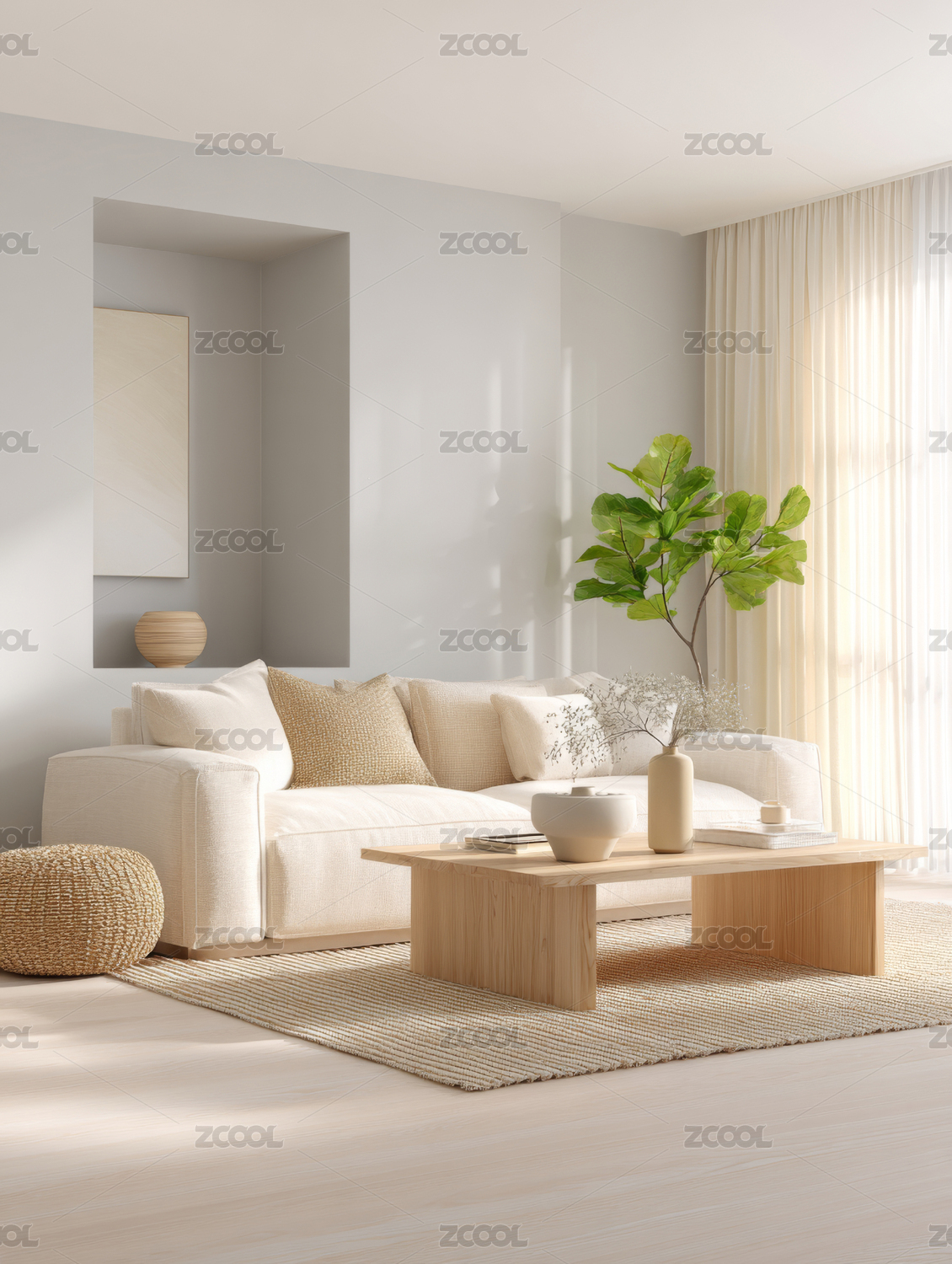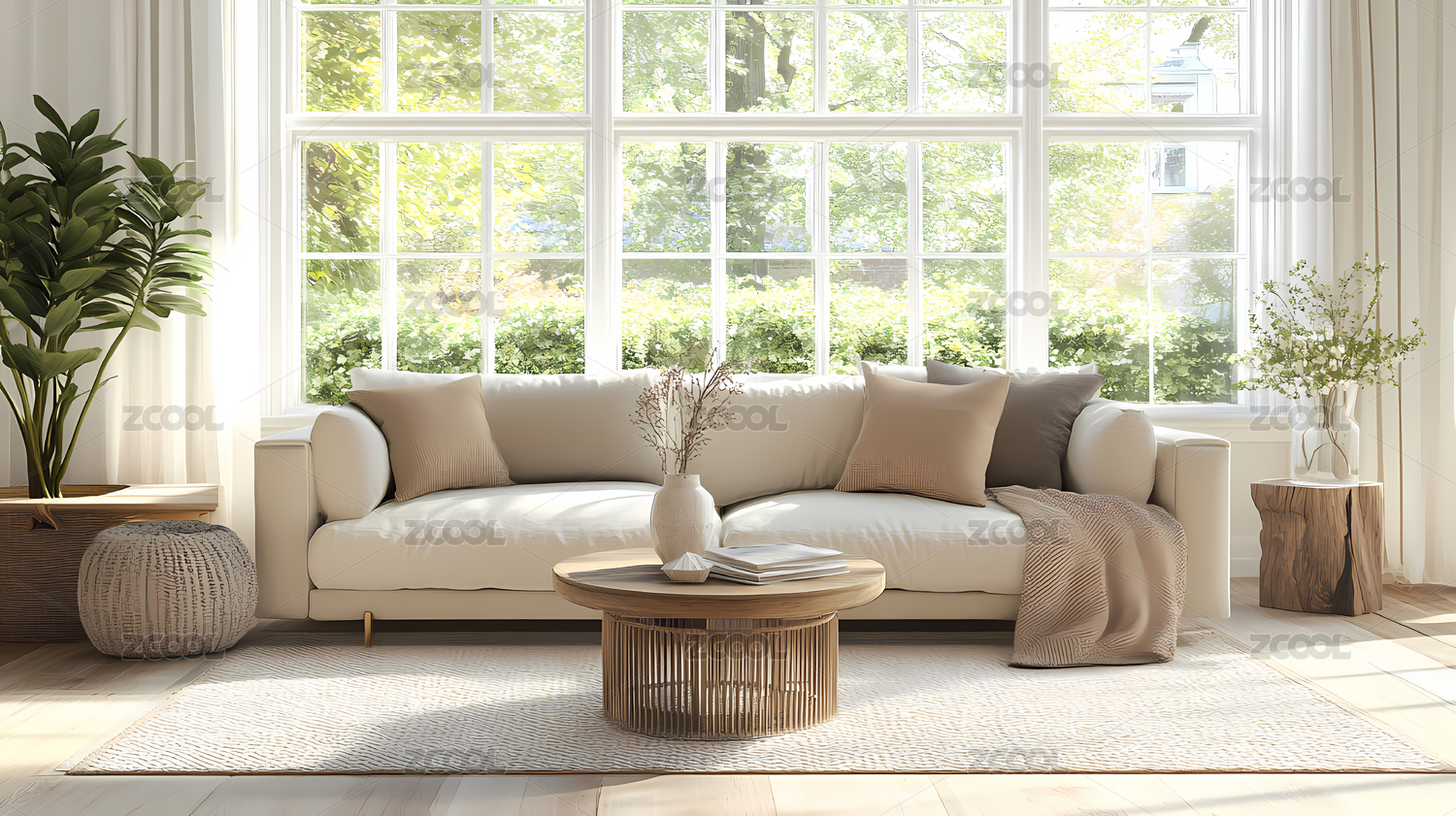 客厅,沙发,窗帘,绿植,花瓶,地毯,灯罩,窗户,阳光,现代
