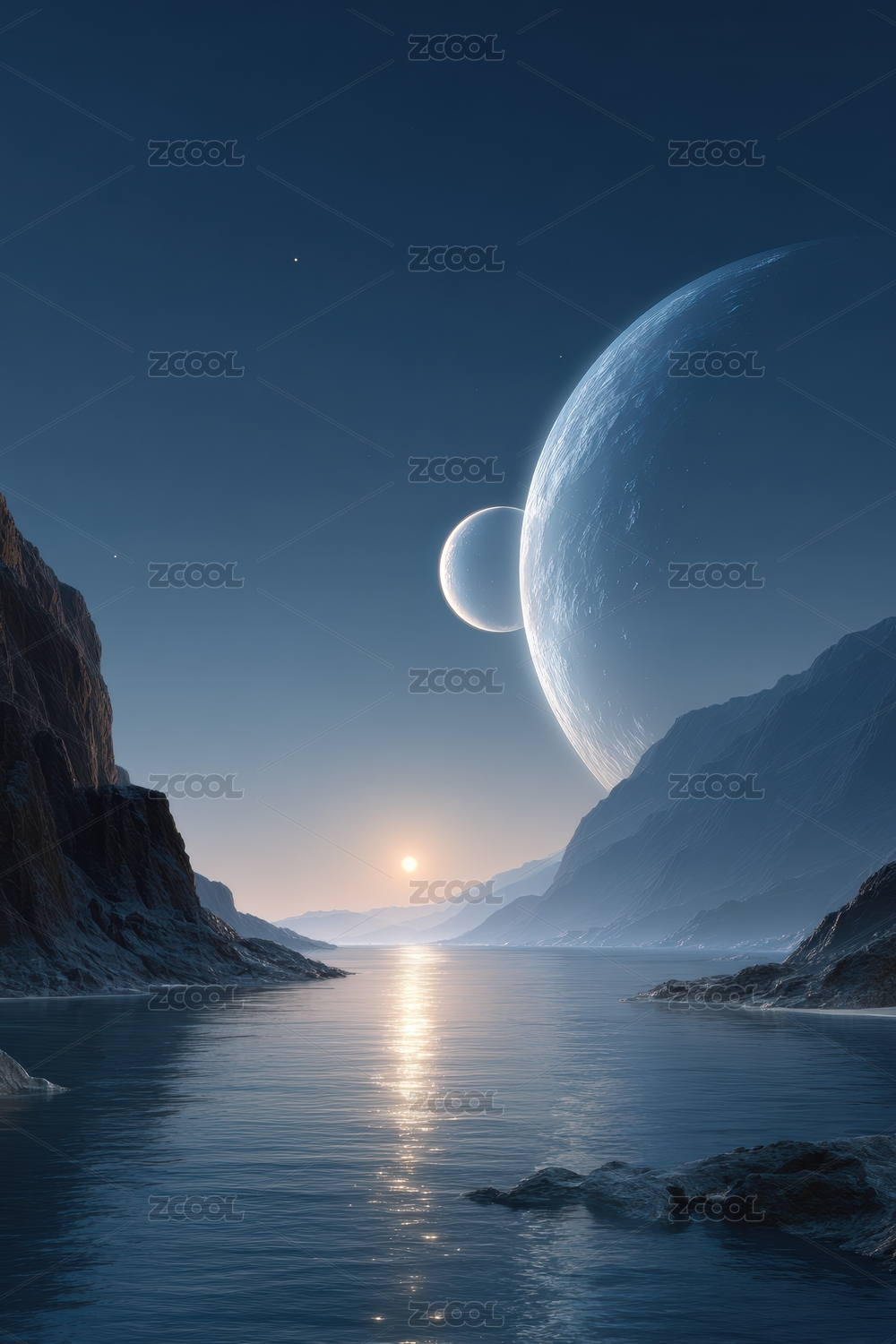 蓝月映照静谧湖面的外星景观