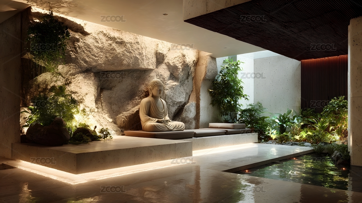 室内禅意佛像水景设计