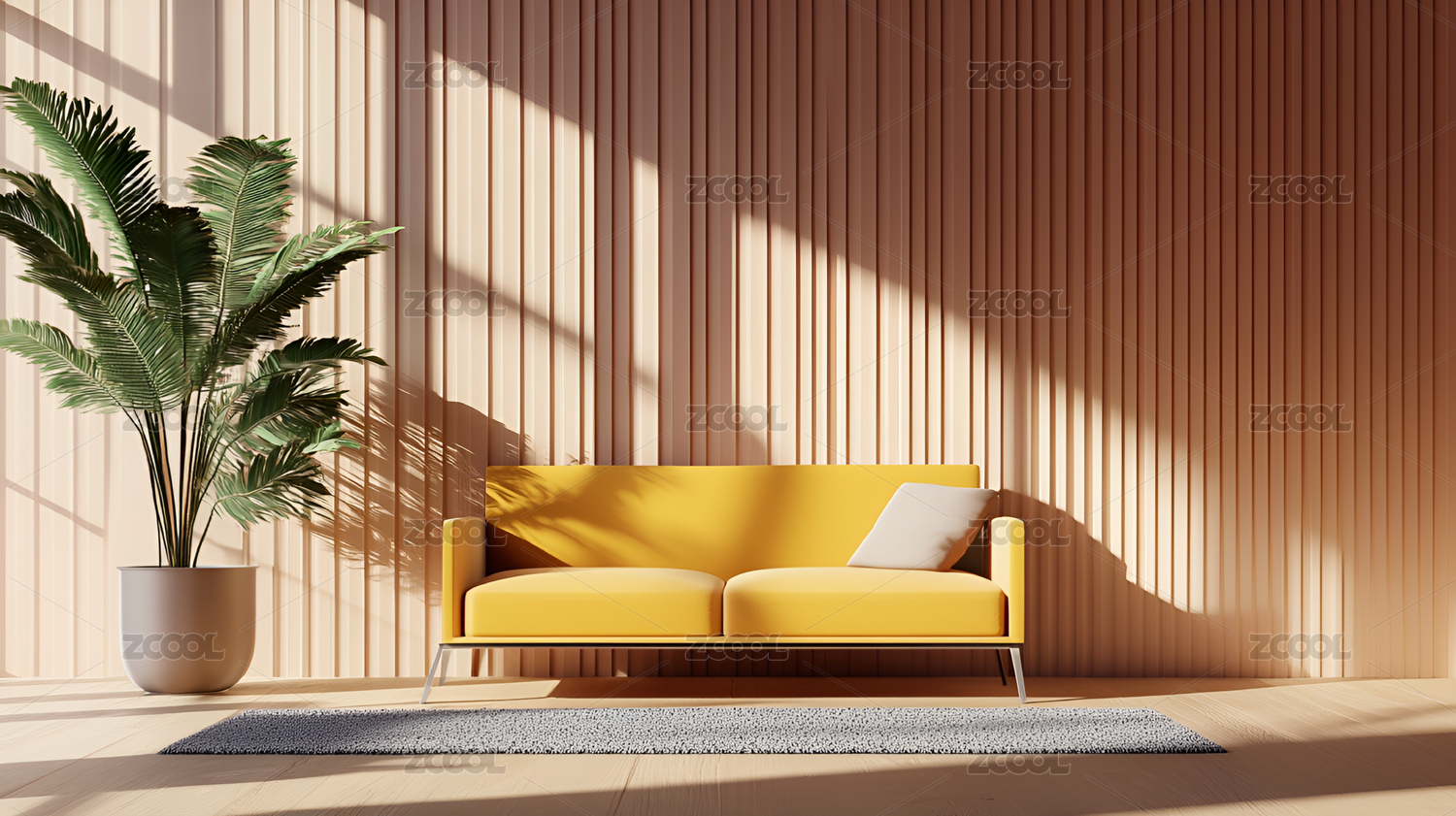 现代简约室内粉色沙发与绿植点缀