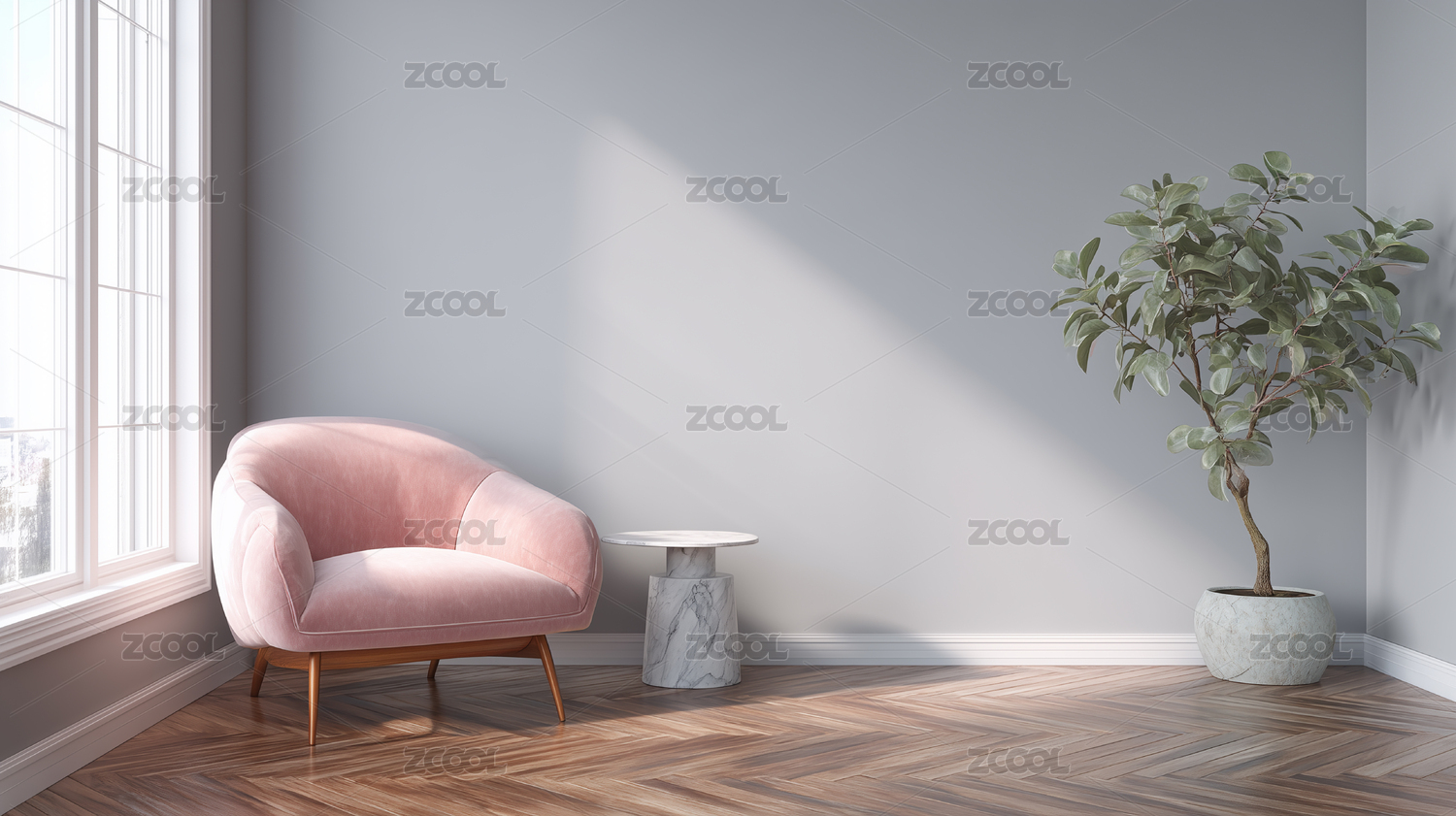 粉色沙发,绿植装饰,木质背景,现代简约,室内设计,小茶几,自然光线,墙面纹理,家居布置,清新风格
