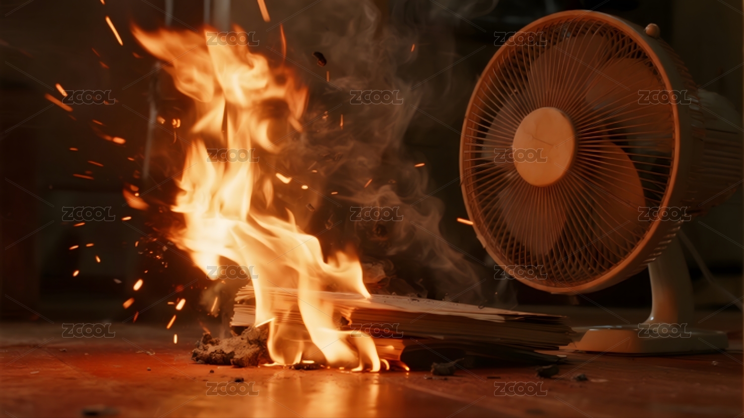电扇,火焰,扇叶,支架,燃烧,橙黄,高温,危险,背景,黑暗