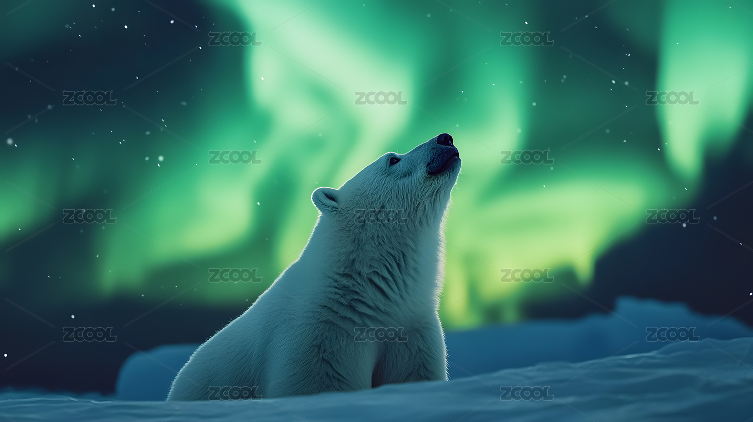 绿色,背景,白色,深蓝,北极熊,极光,夜空,冰川,雪,寒冷