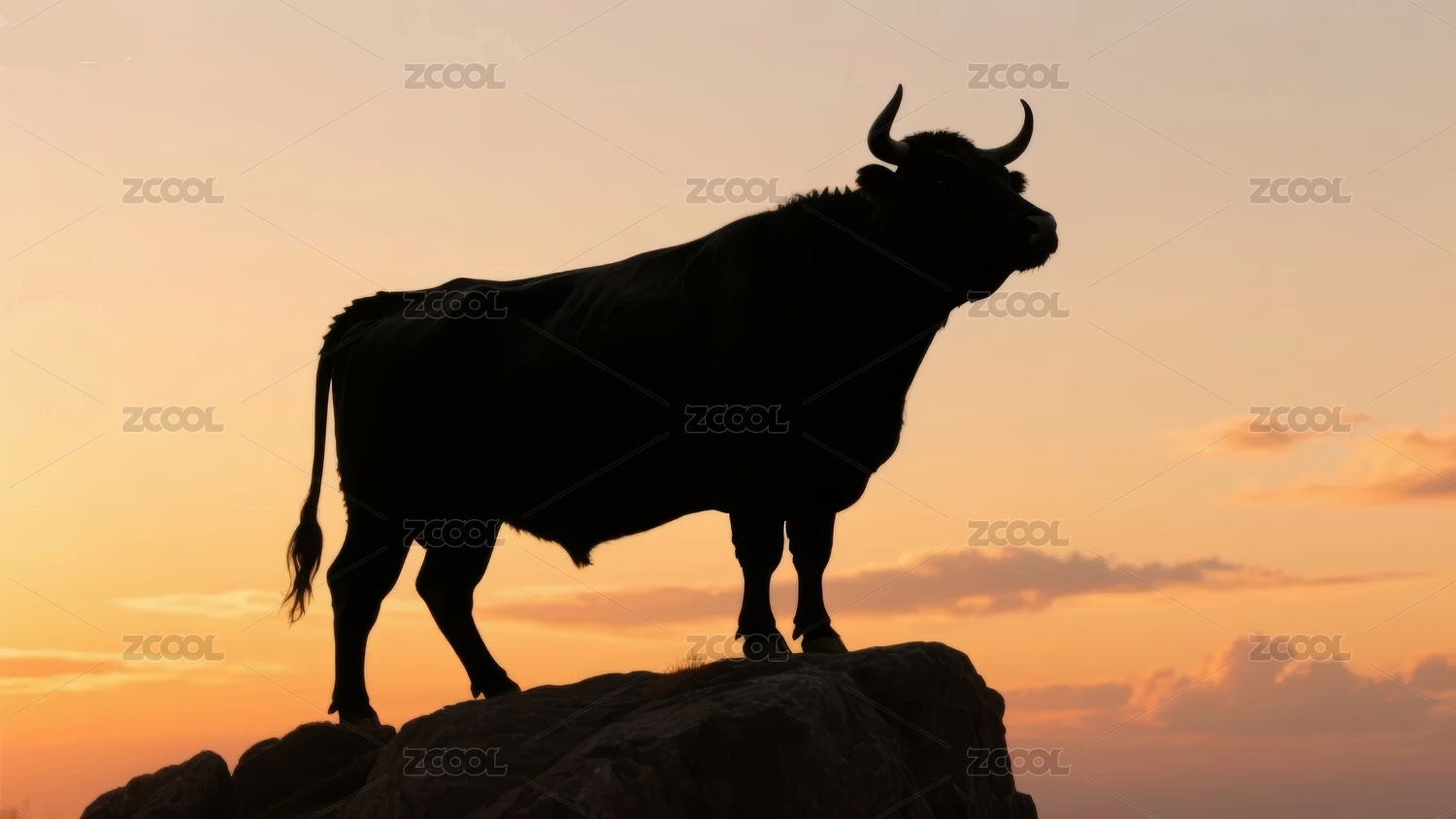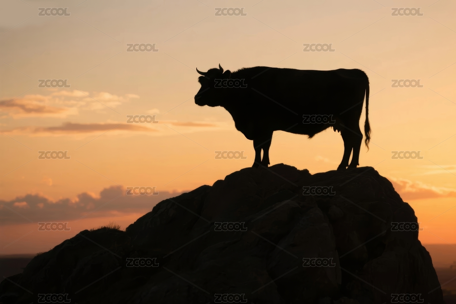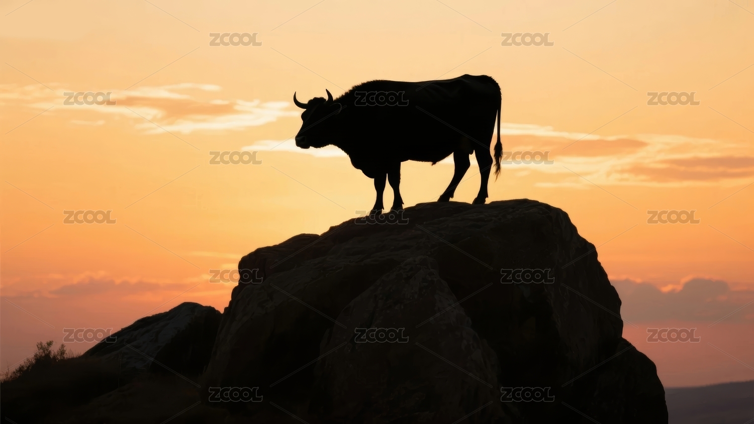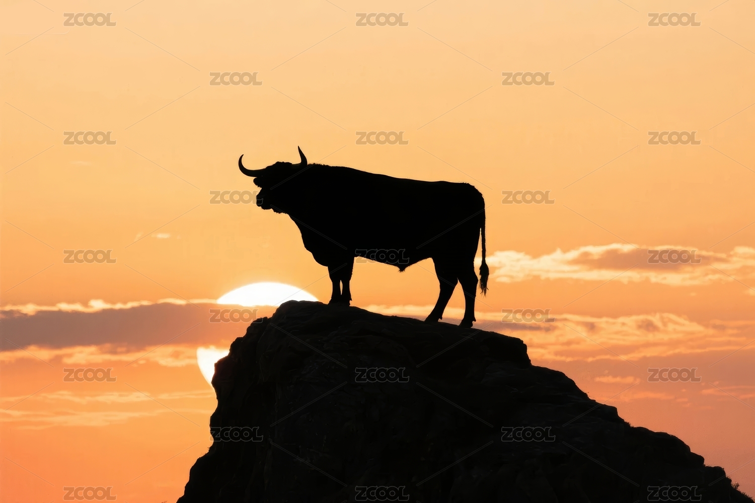 夕阳岩石上的公牛