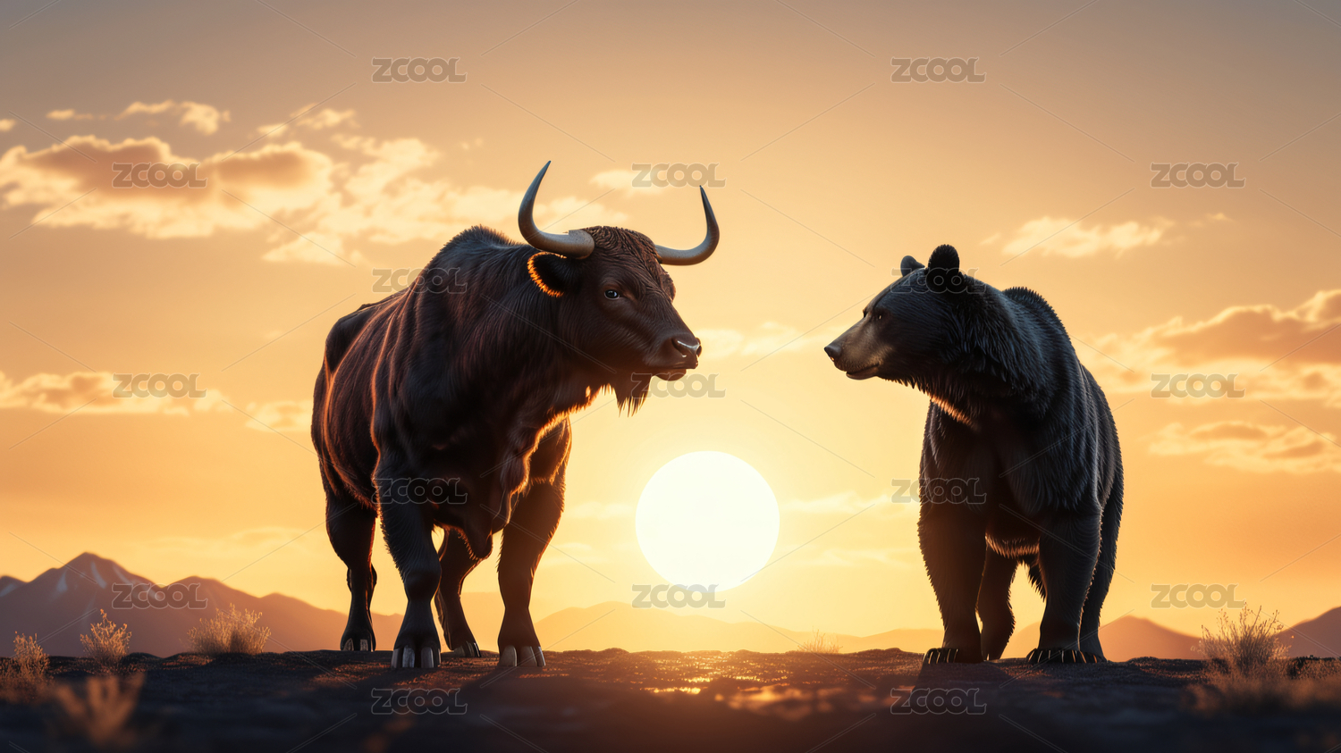 夕阳下的城市与公牛