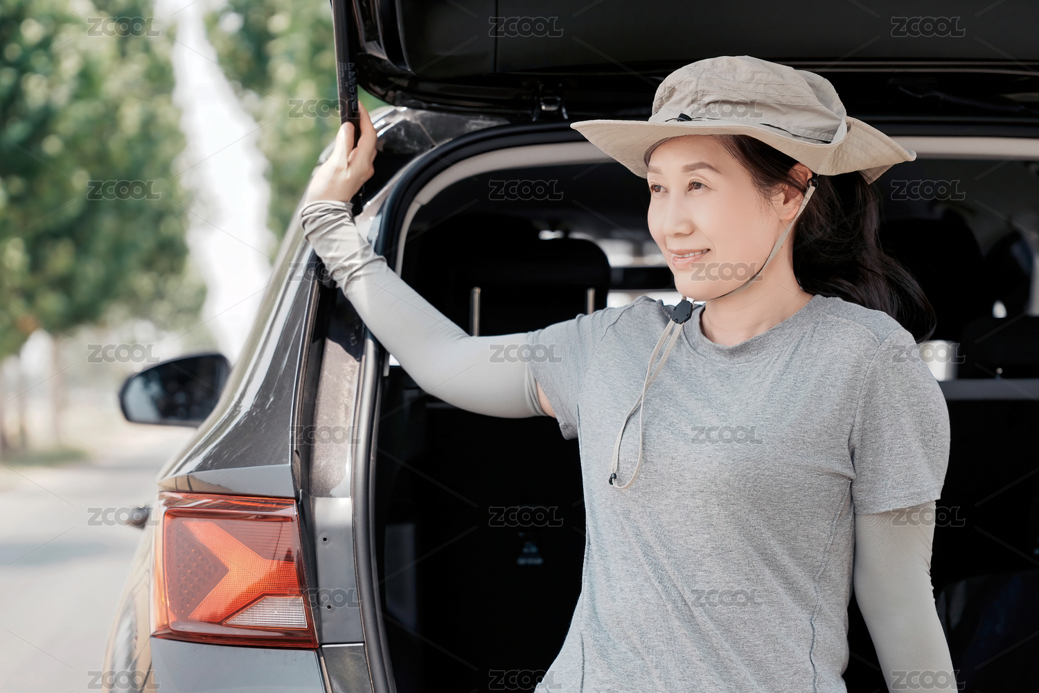 女子户外惬意开启车尾箱