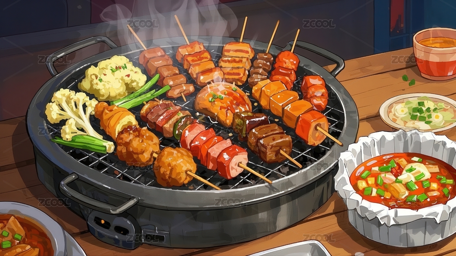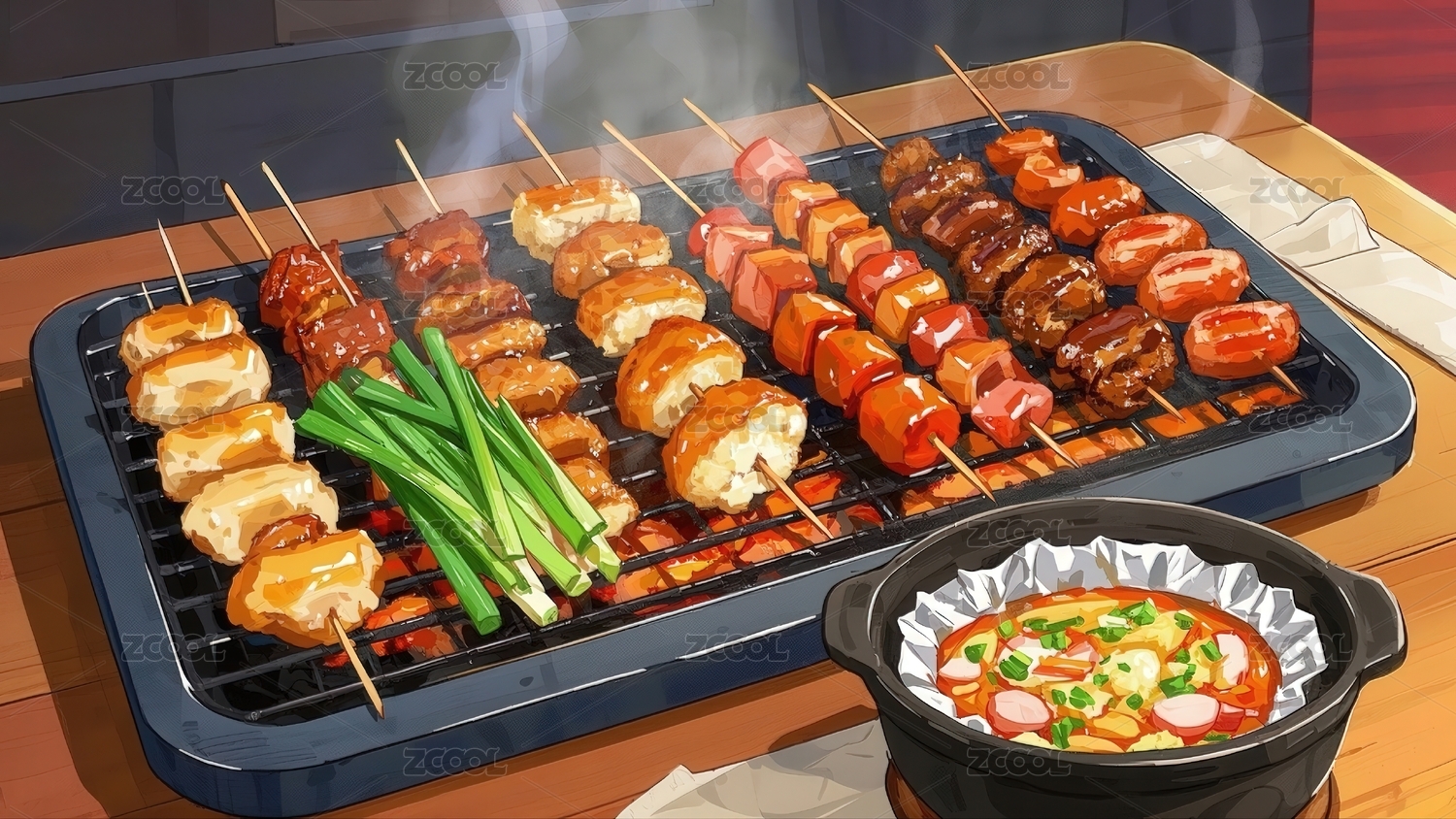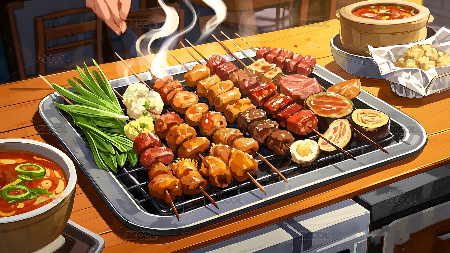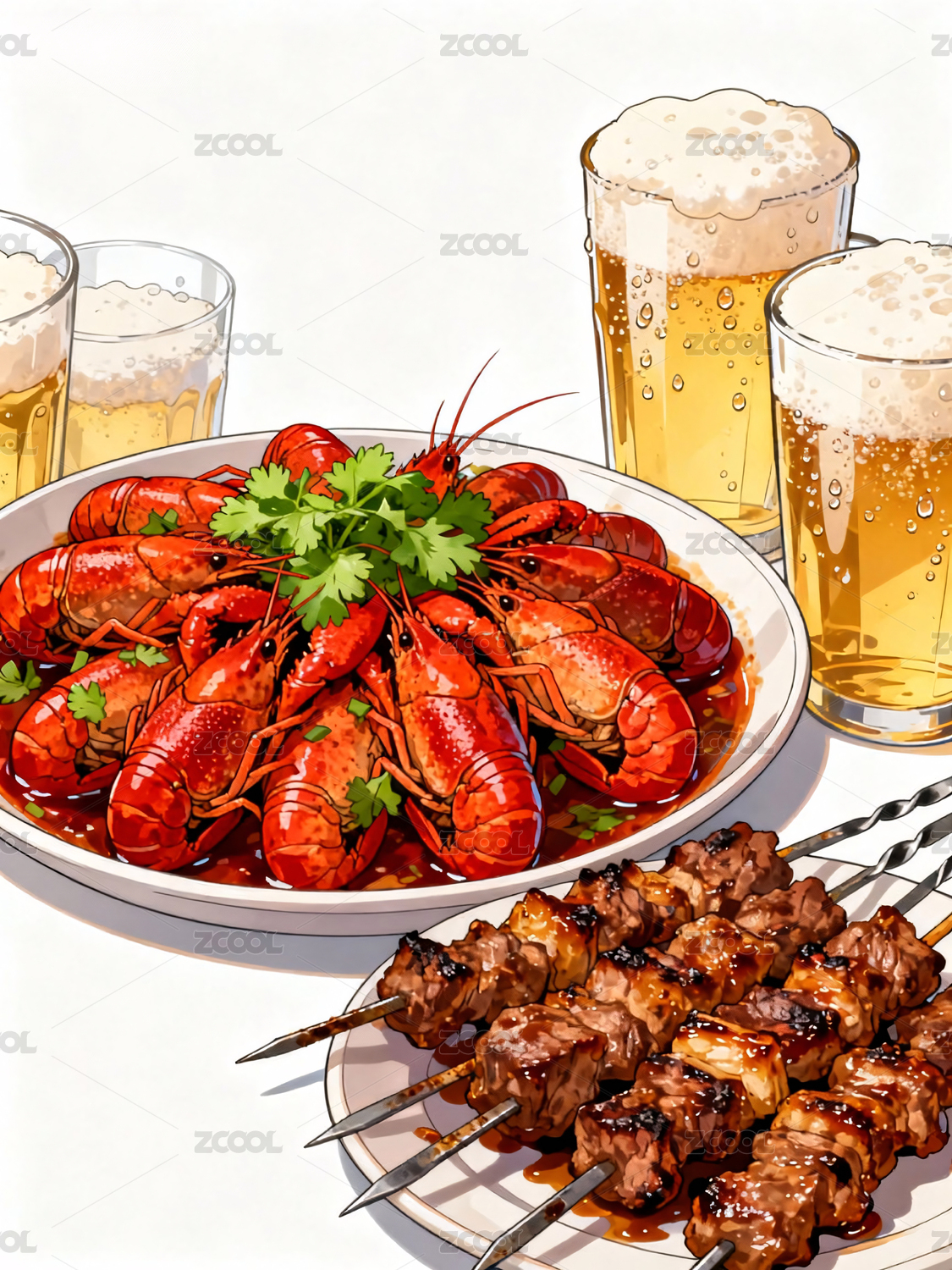 烧烤,啤酒,烤肉串,烤生蚝,烤鸡翅,餐饮,夜宵,美味,美食,插画