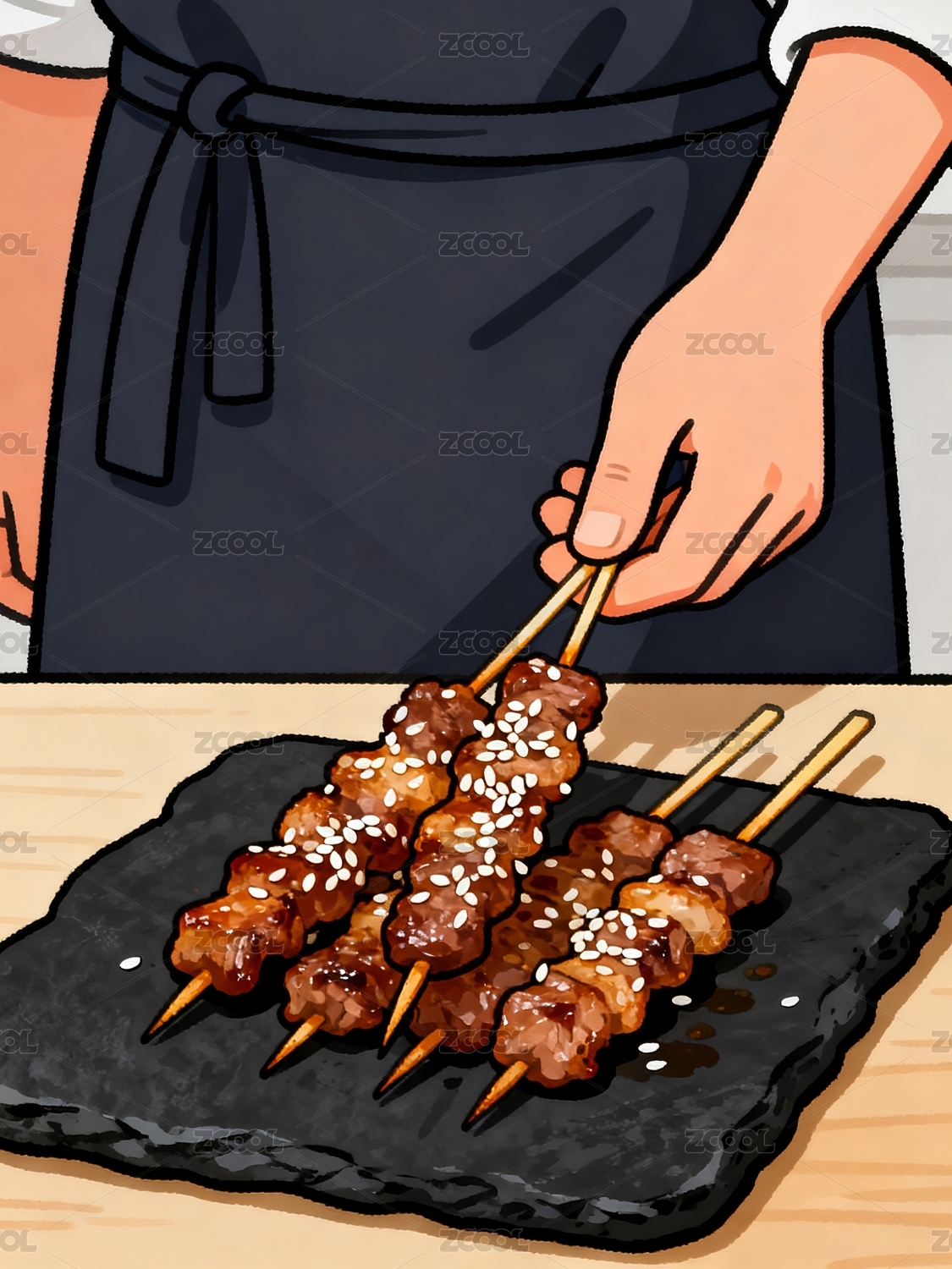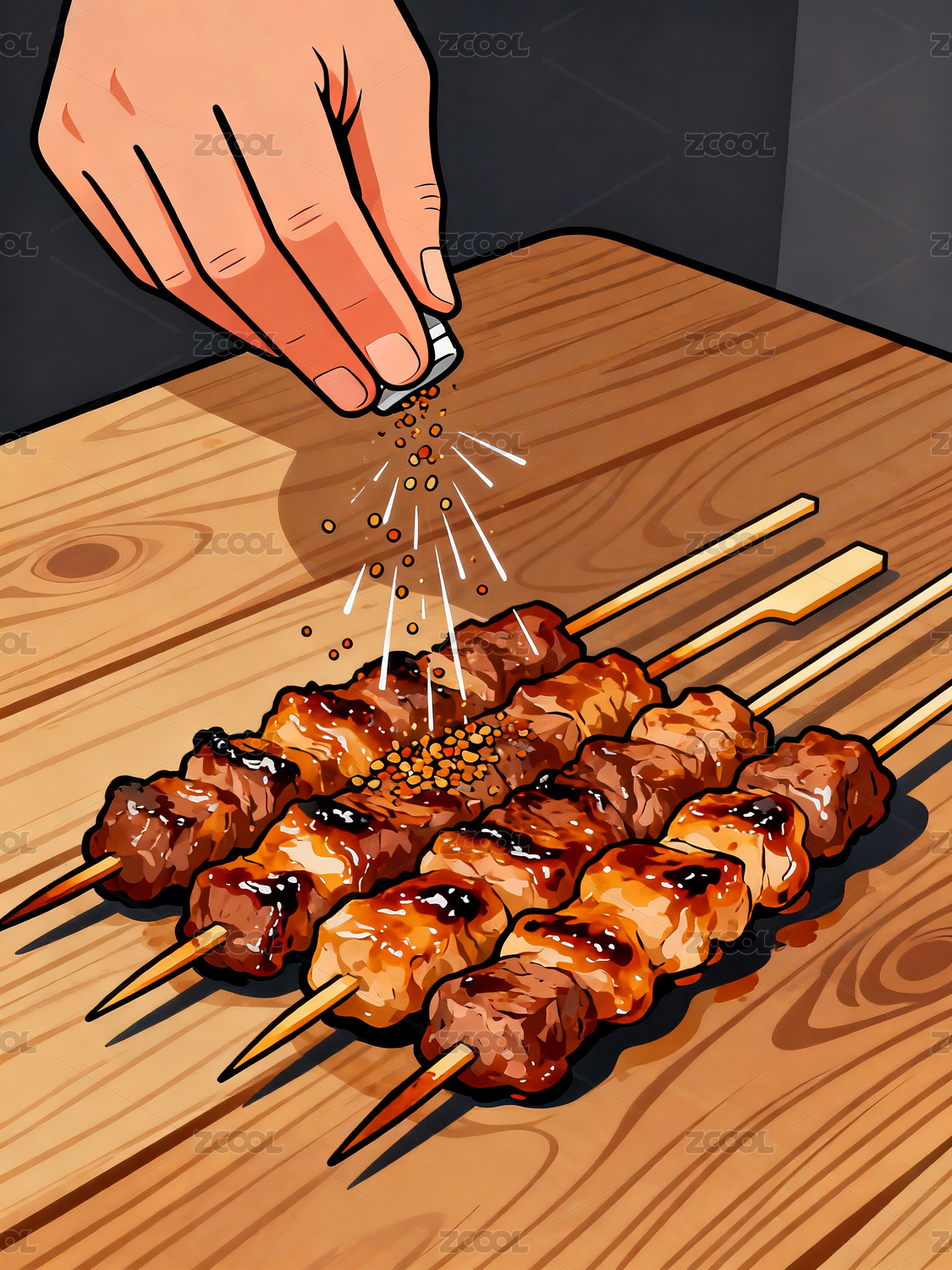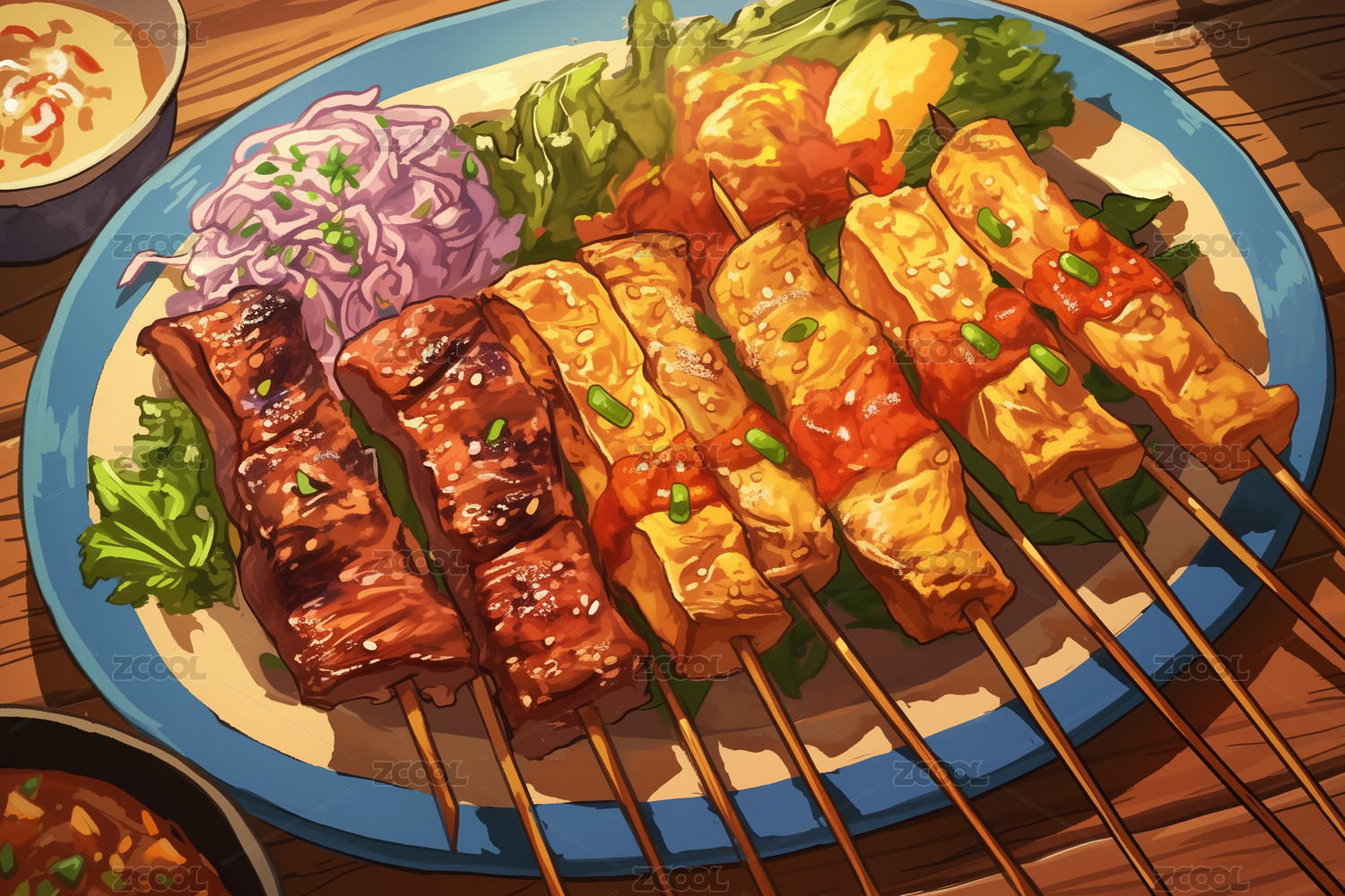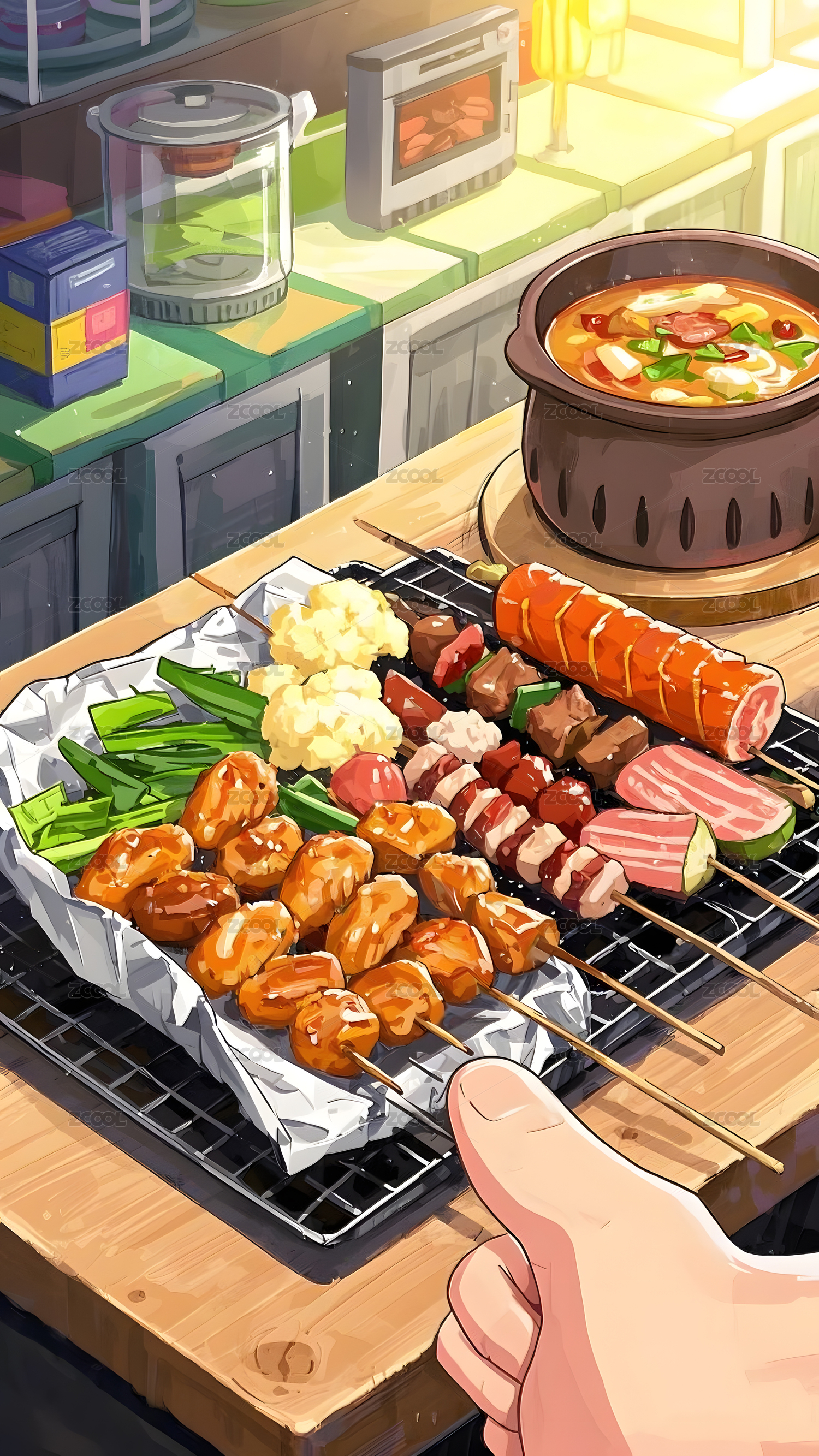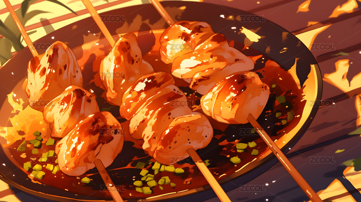 烧烤,啤酒,烤肉串,烤生蚝,烤鸡翅,餐饮,夜宵,美味,美食,插画