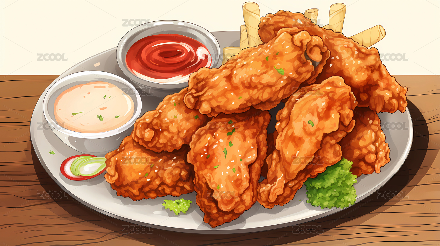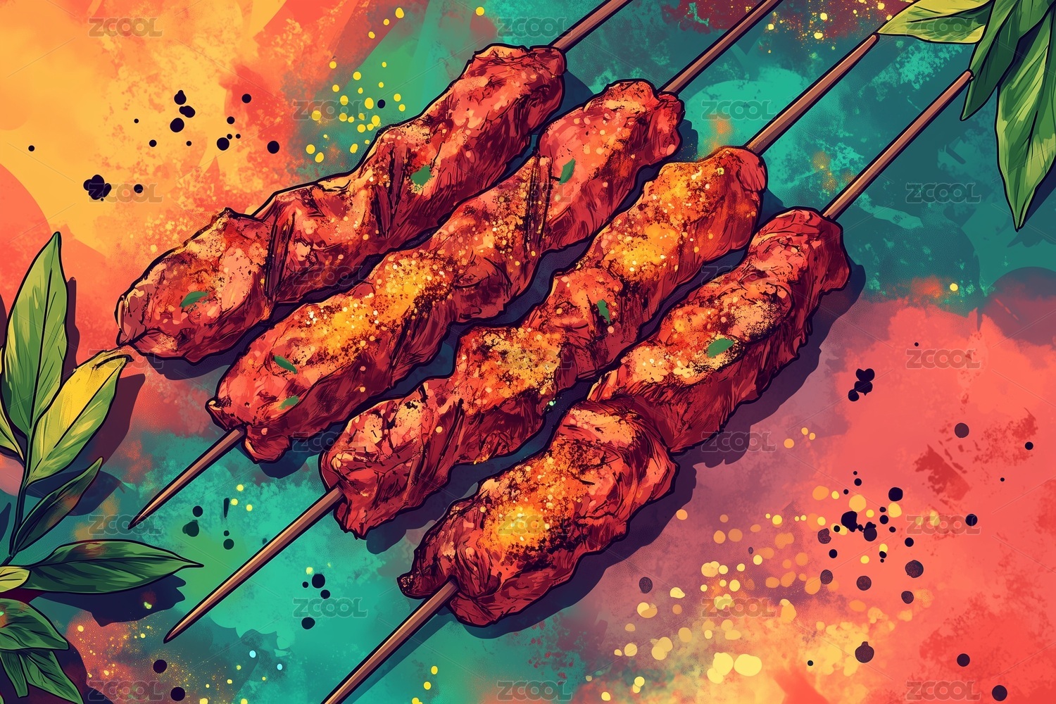 美食插画 一盘美味的烧烤肉串配米饭西兰花