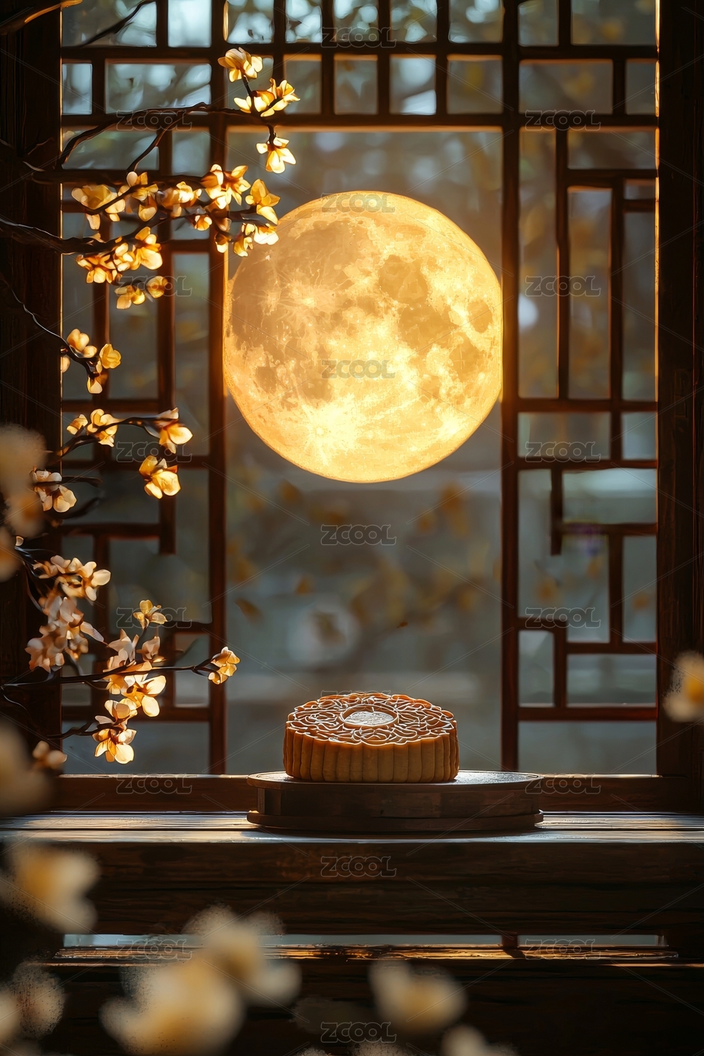 中秋节,中式,传统,插画,背景,壁纸,月亮,月饼,阁窗