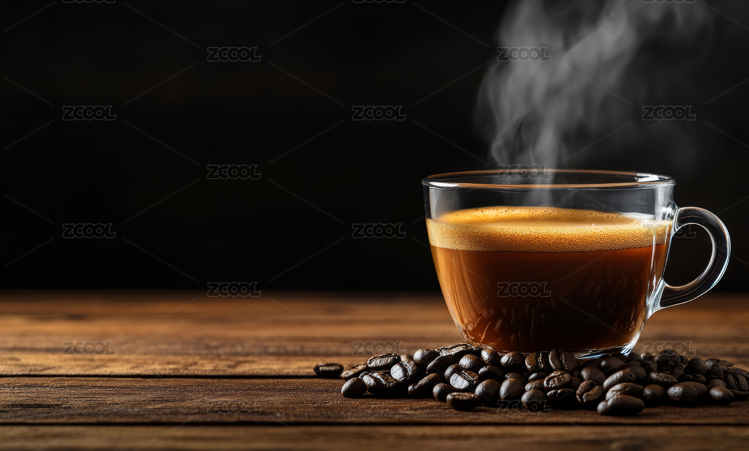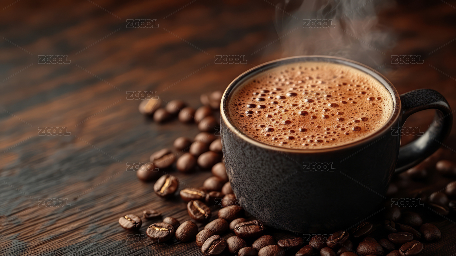 桌上一杯香浓黑咖啡和散落的咖啡豆