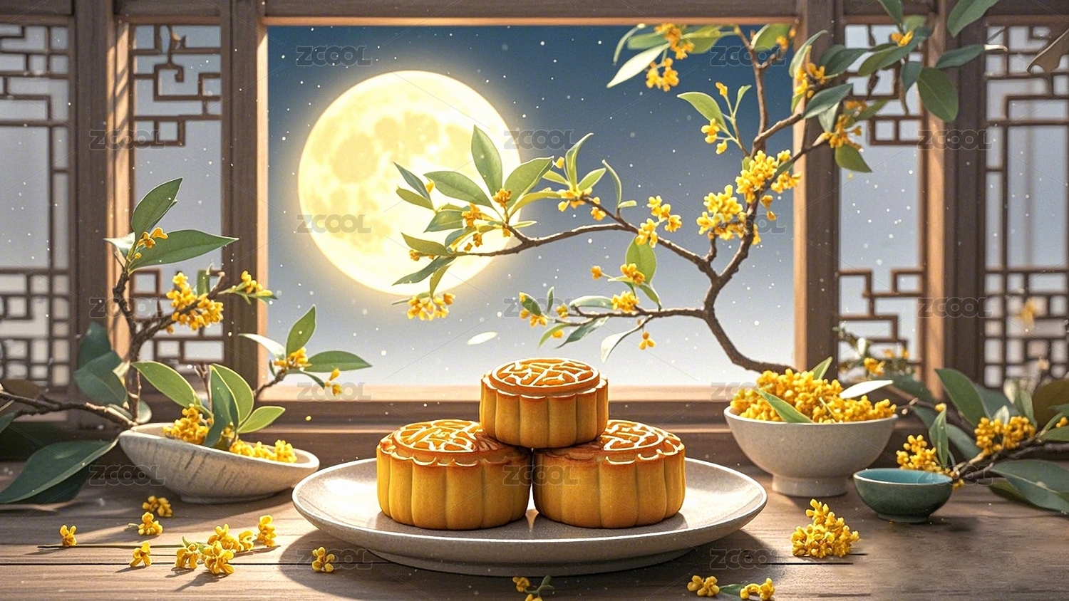 中秋节,背景,壁纸,插画,月亮,月饼,桂花,建筑,桂花酒
