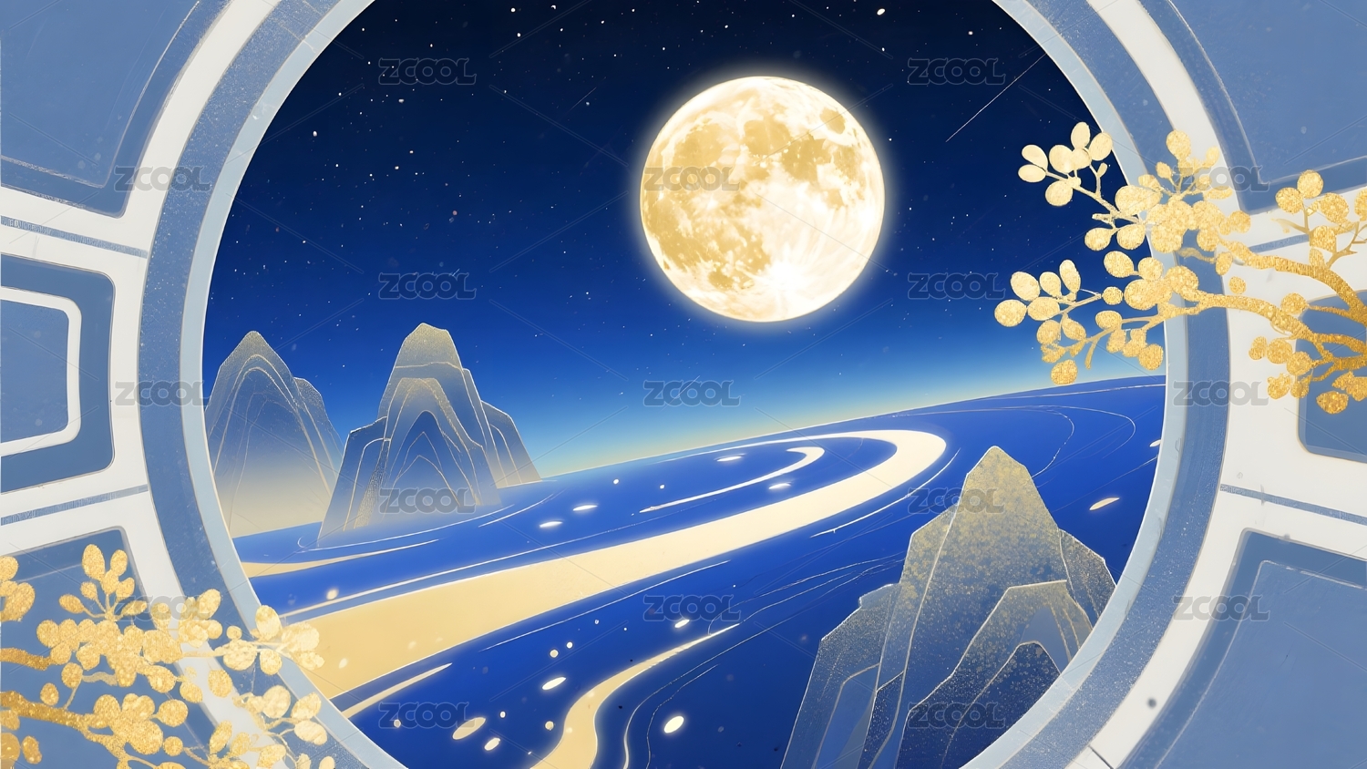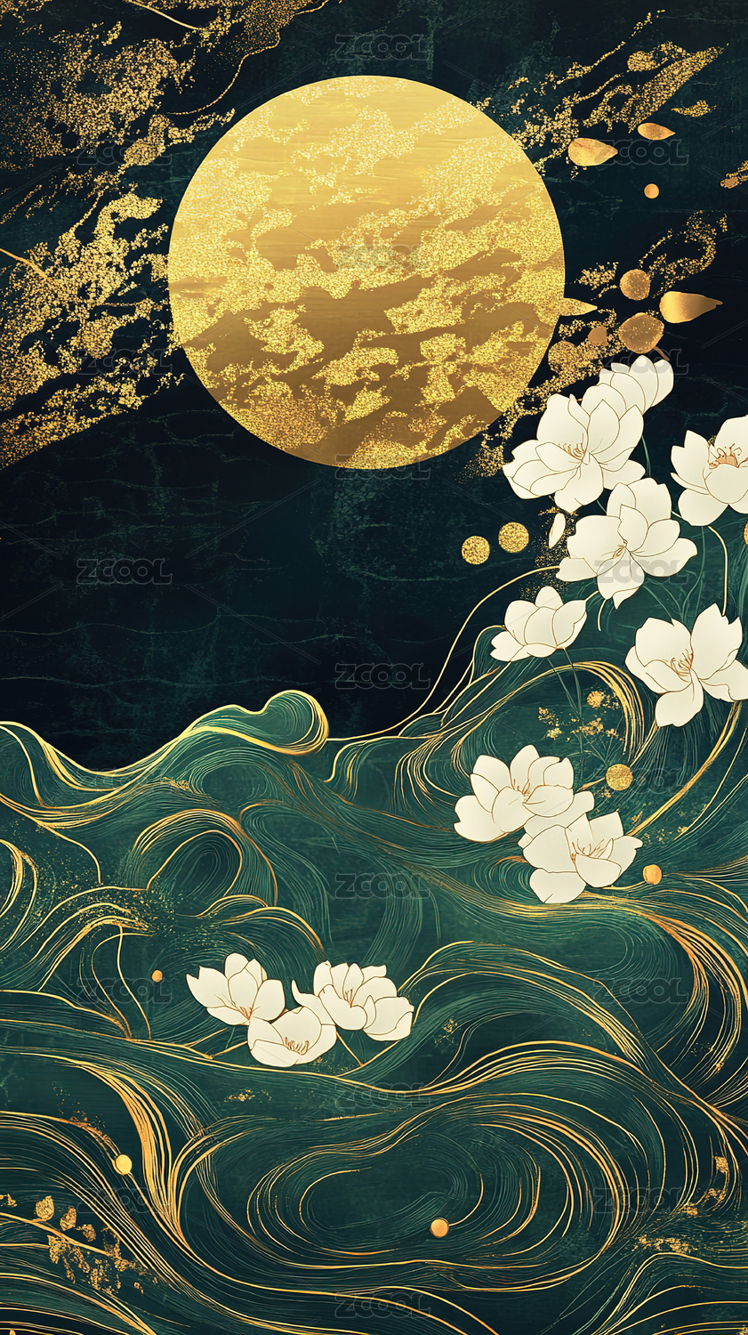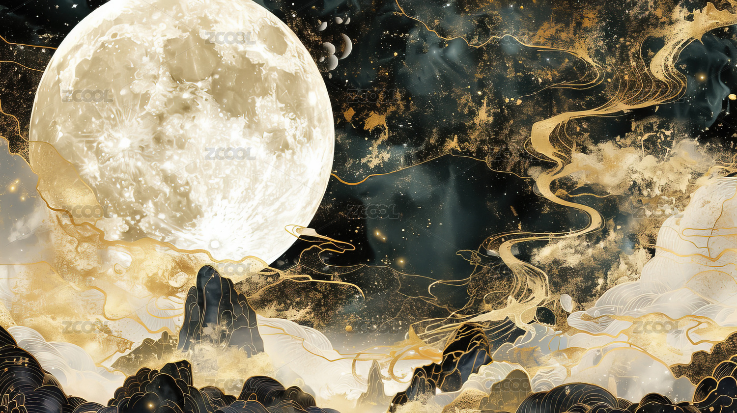 中国风太阳月亮黑金山水云雾背景壁纸新国风