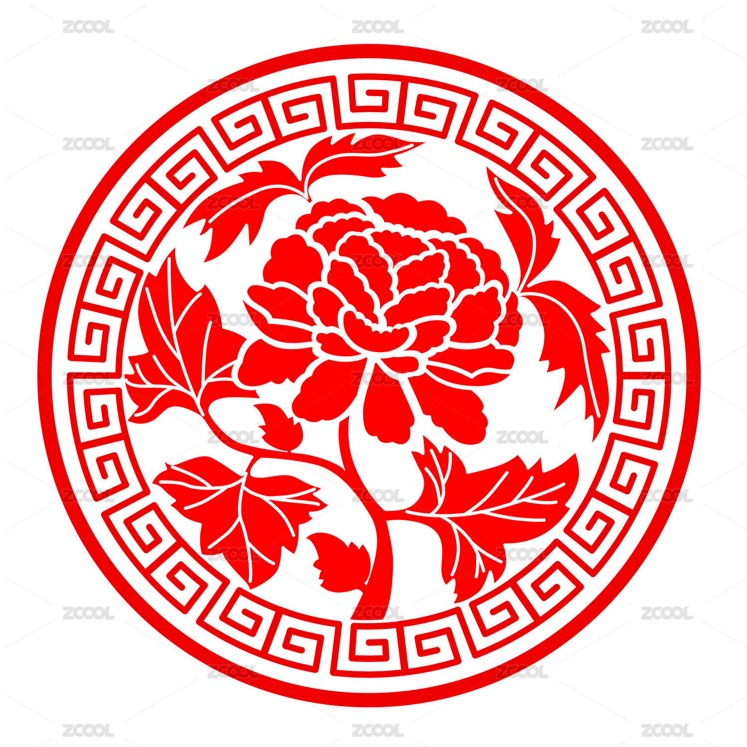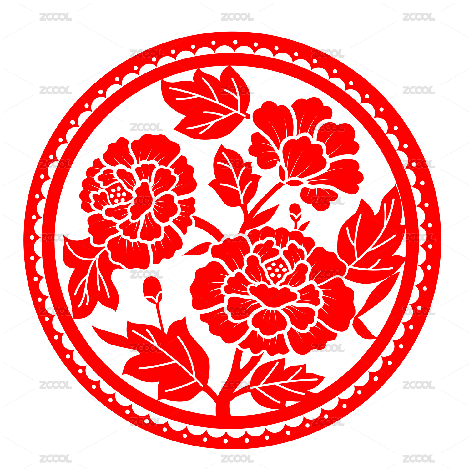 牡丹花剪纸窗花年画圆形中国风春节印刷打印