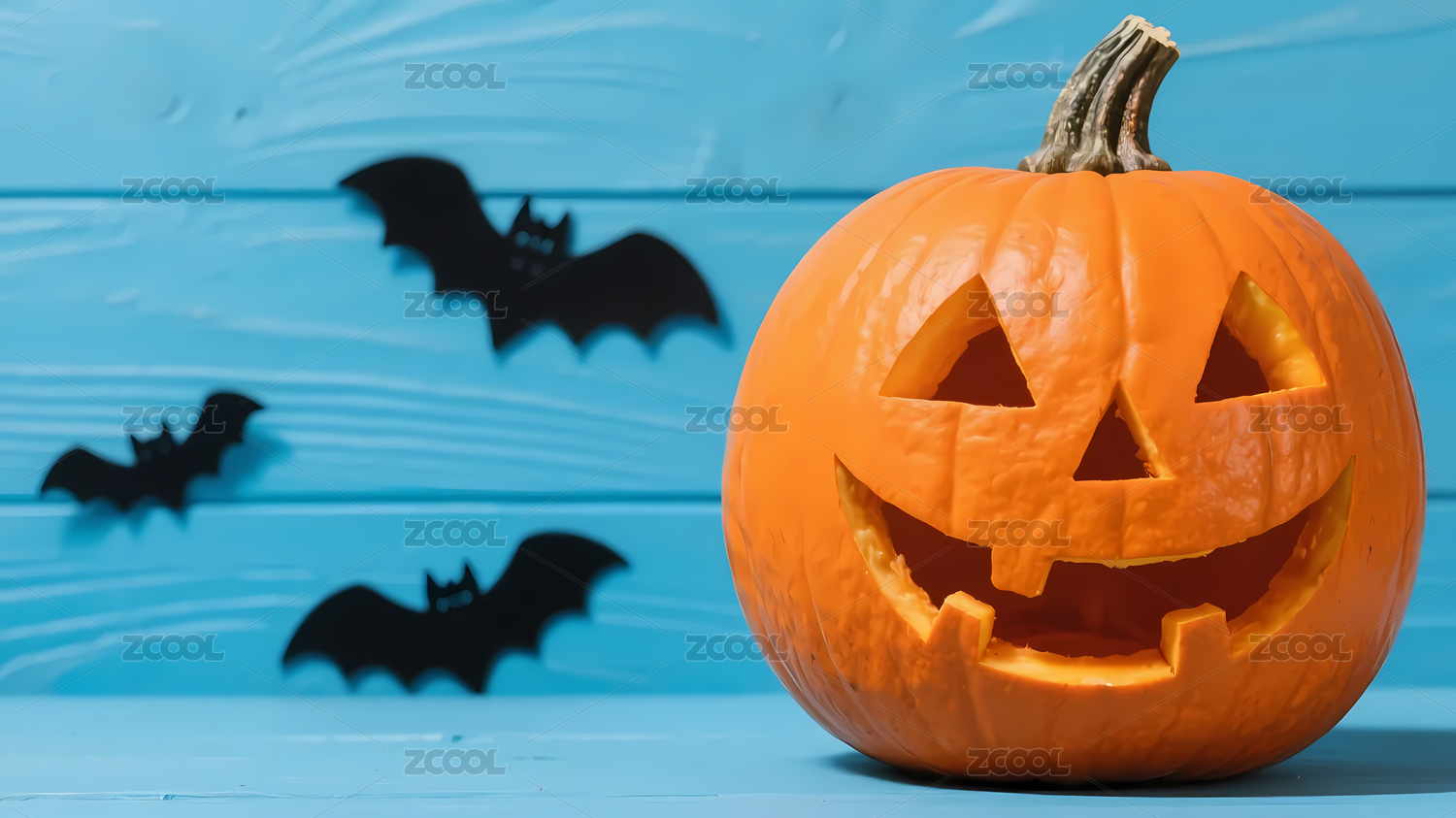 橙色,蓝色,装饰,木质,南瓜,万圣节,笑脸,墙面,蝙蝠,剪影