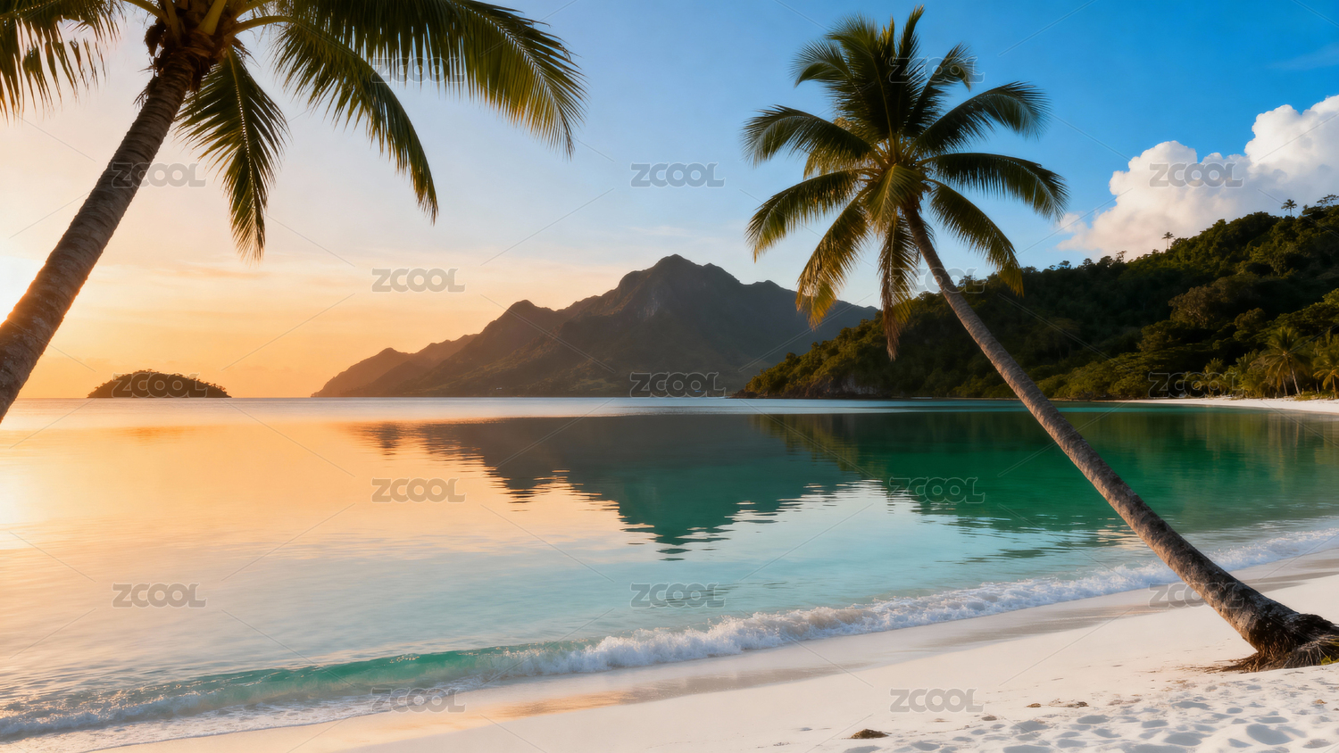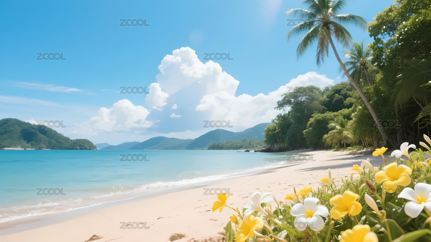 海滩椰树蓝天白云花朵