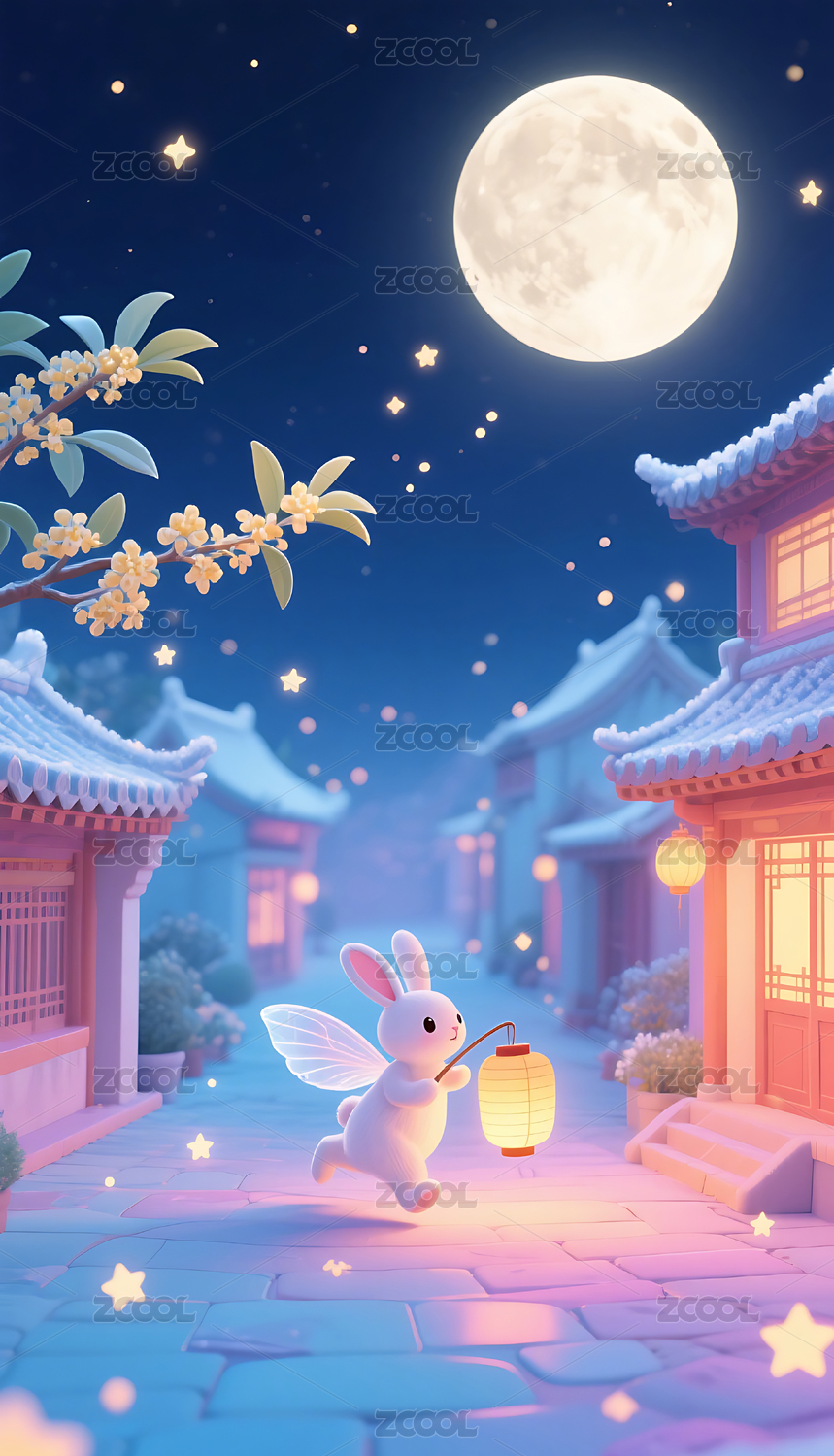 可爱,中秋节,玉兔,插画,背景,壁纸,月亮,桂花,夜晚,天空