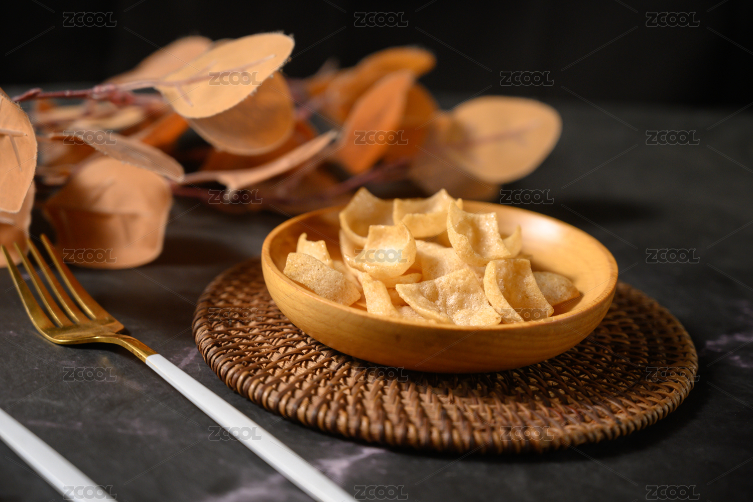 桌面上的盘子里的美味可口的虾片