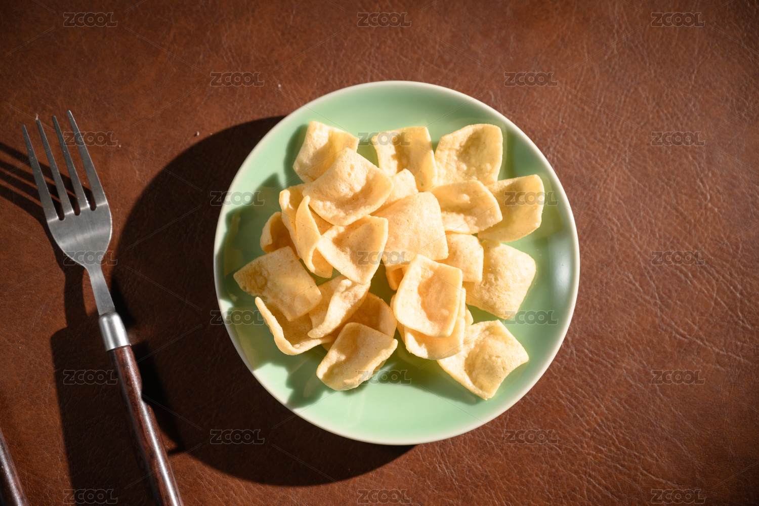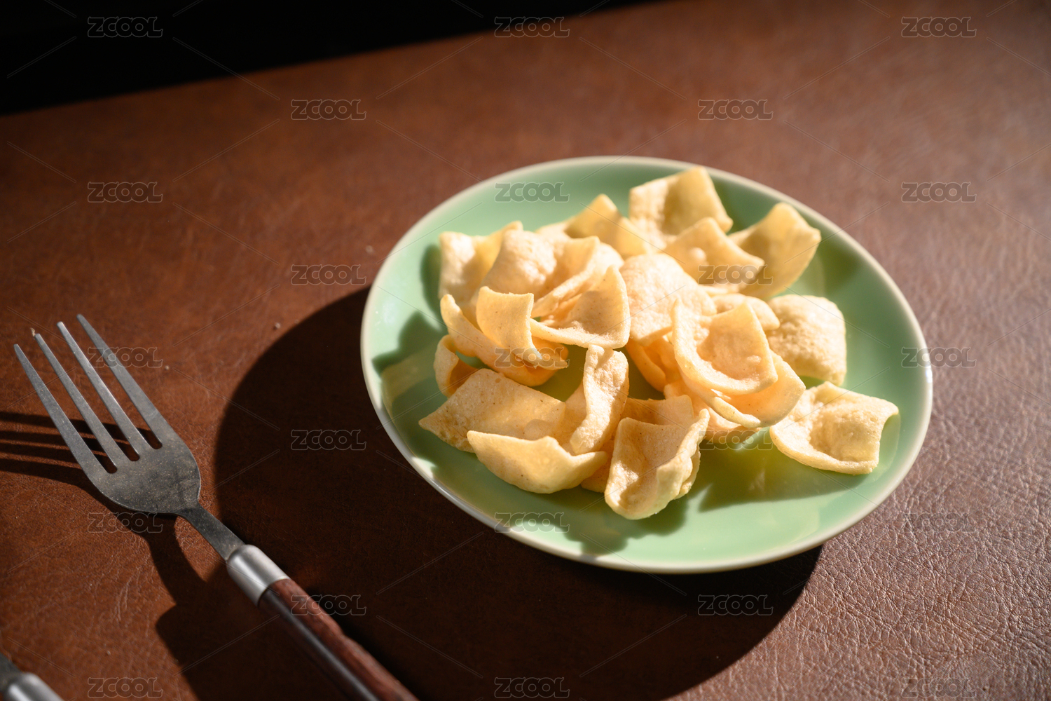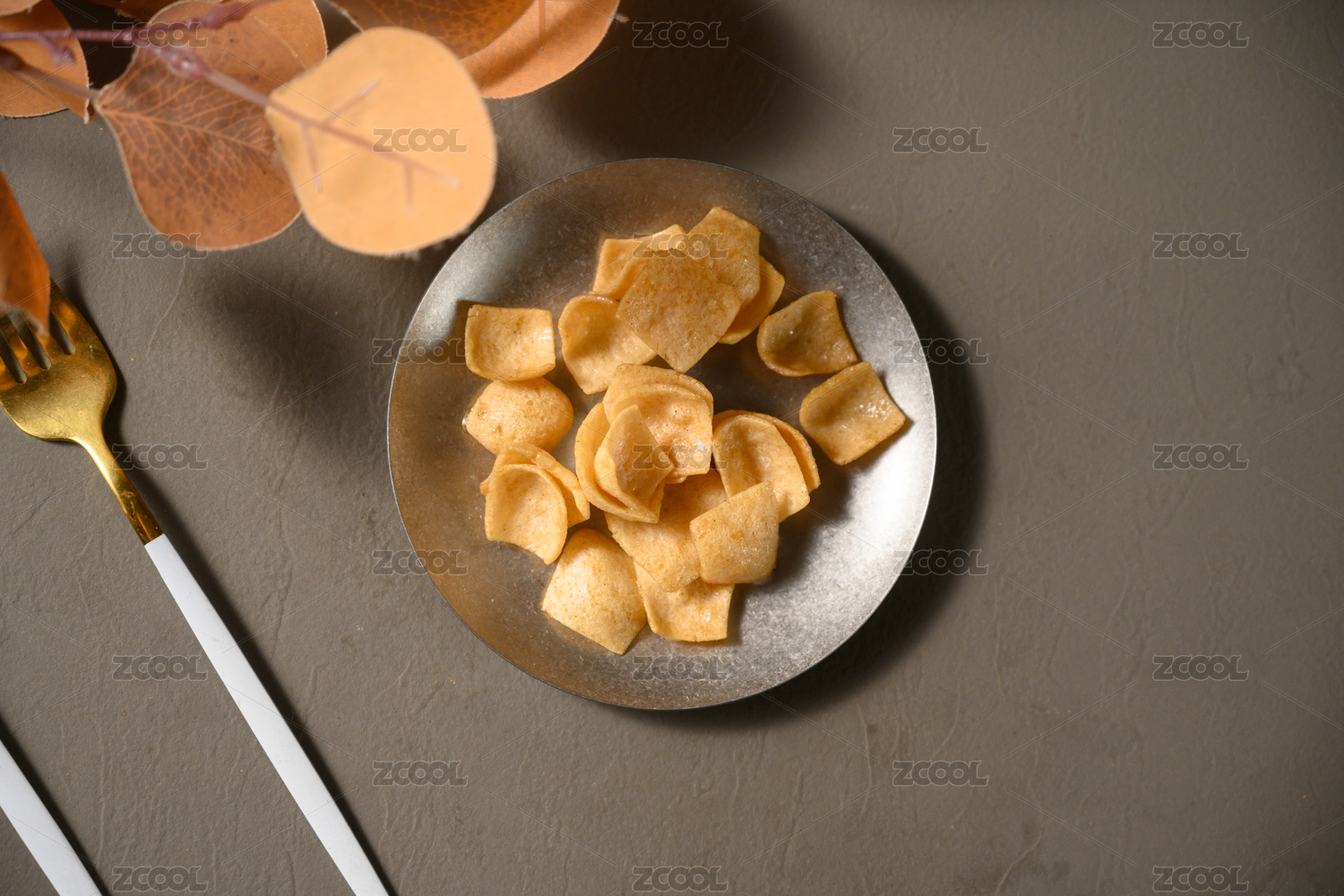 桌面上的盘子里的美味可口的虾片