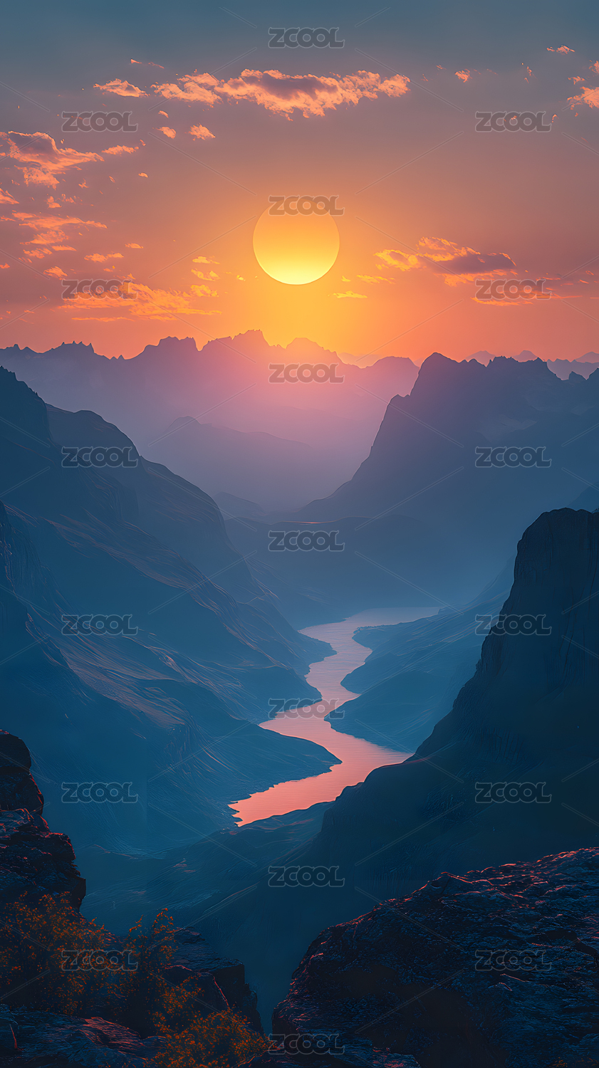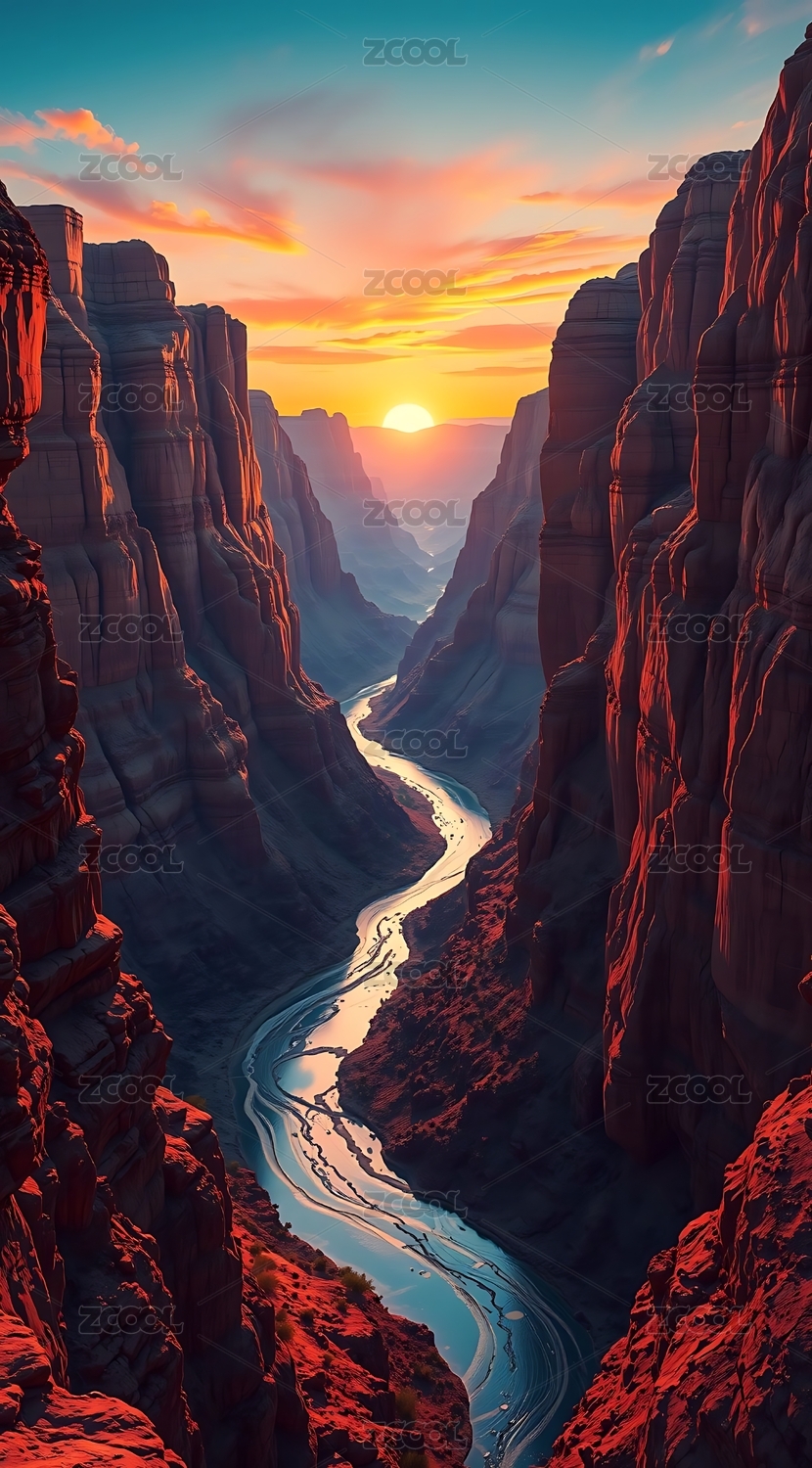 日落, 山谷, 河流, 火焰般的云彩, 倒影