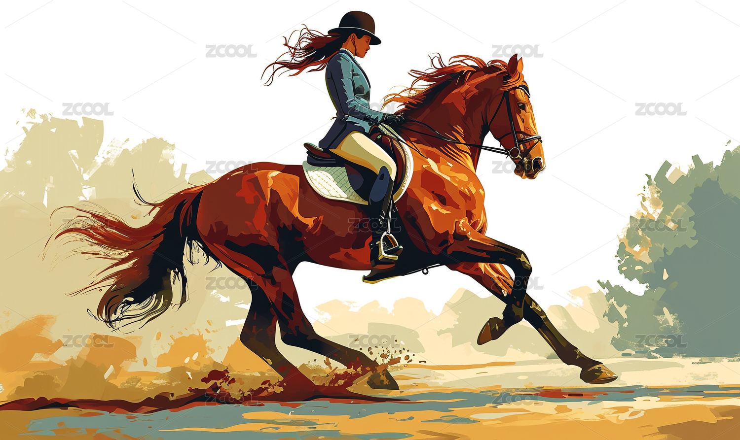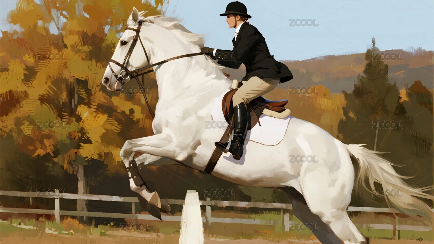骑手,草地,树木,栅栏,运动,插画,绘画,风景,户外,奔跑
