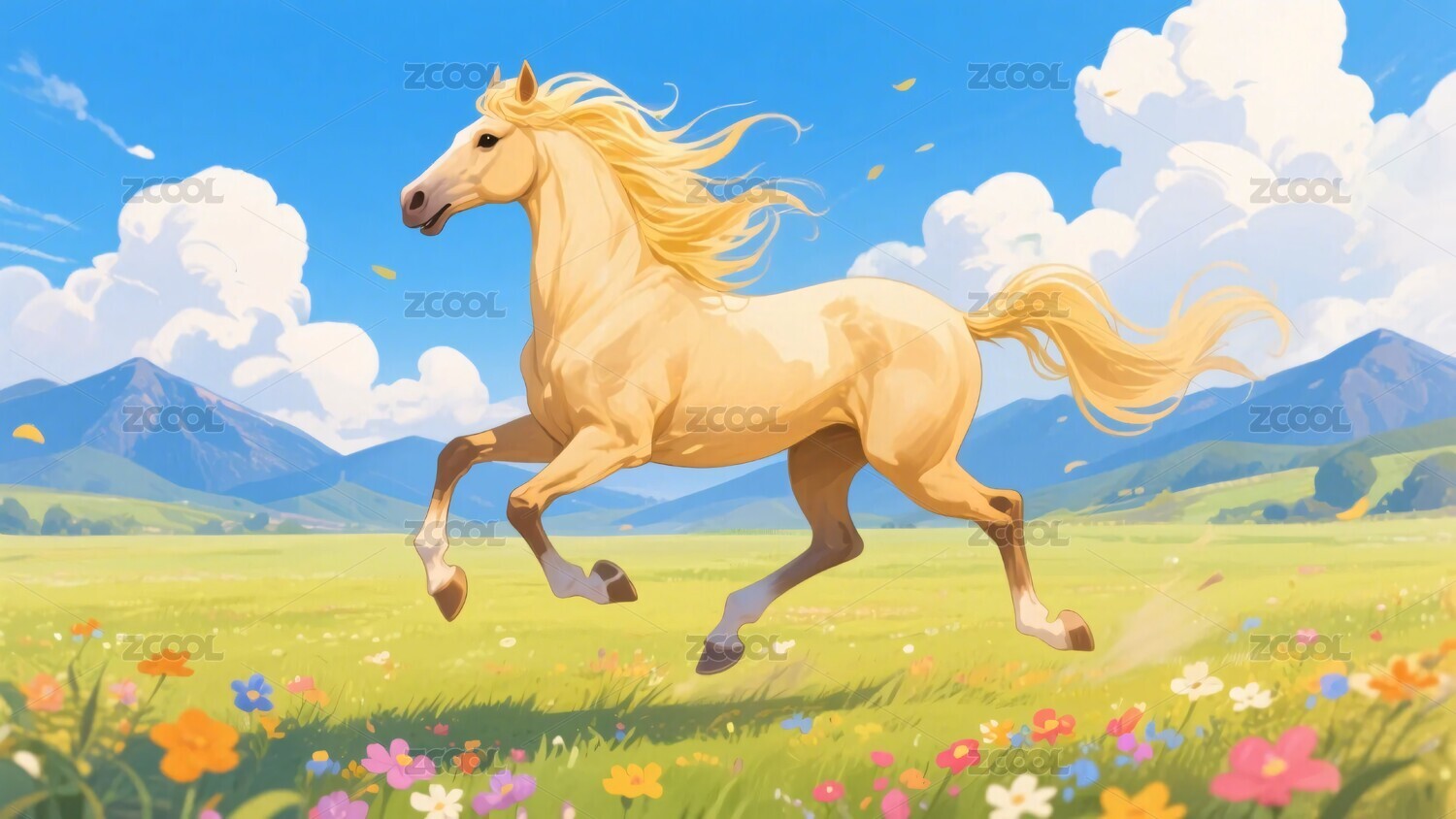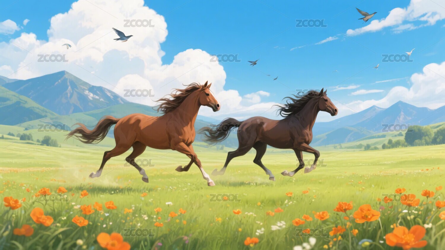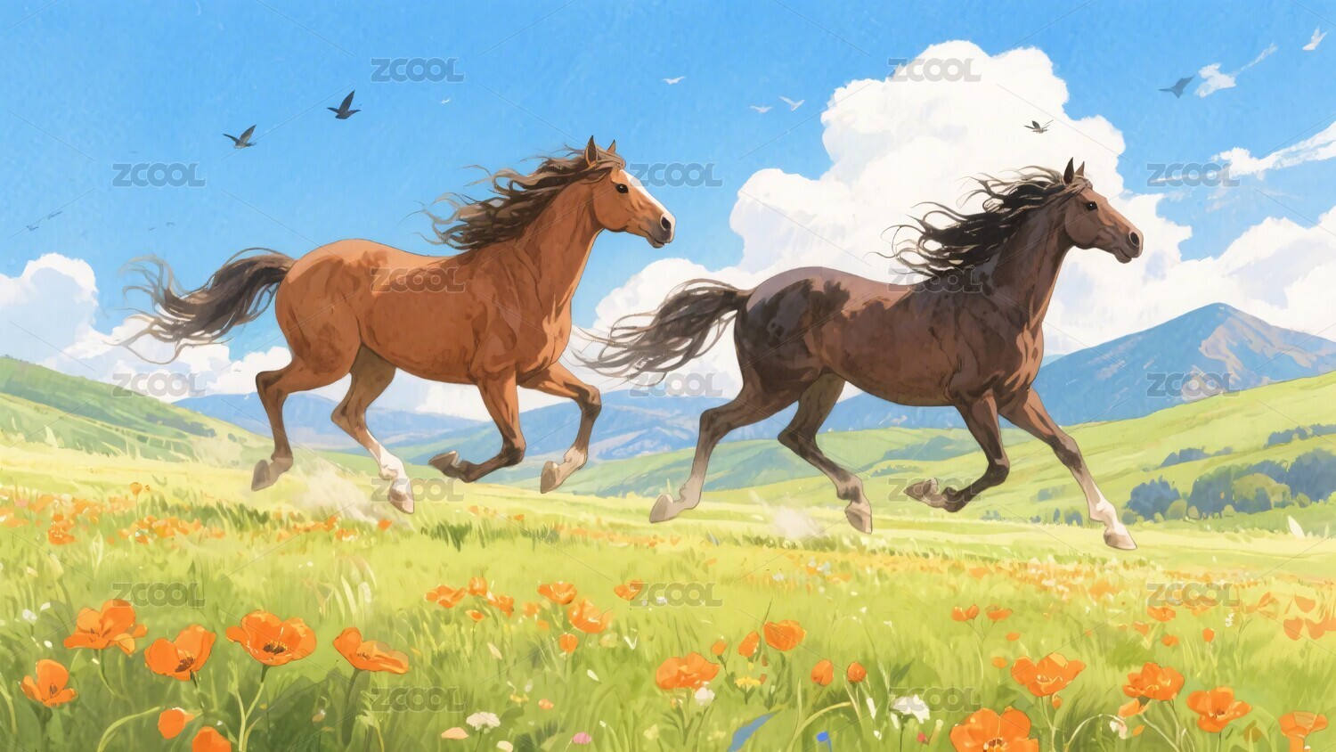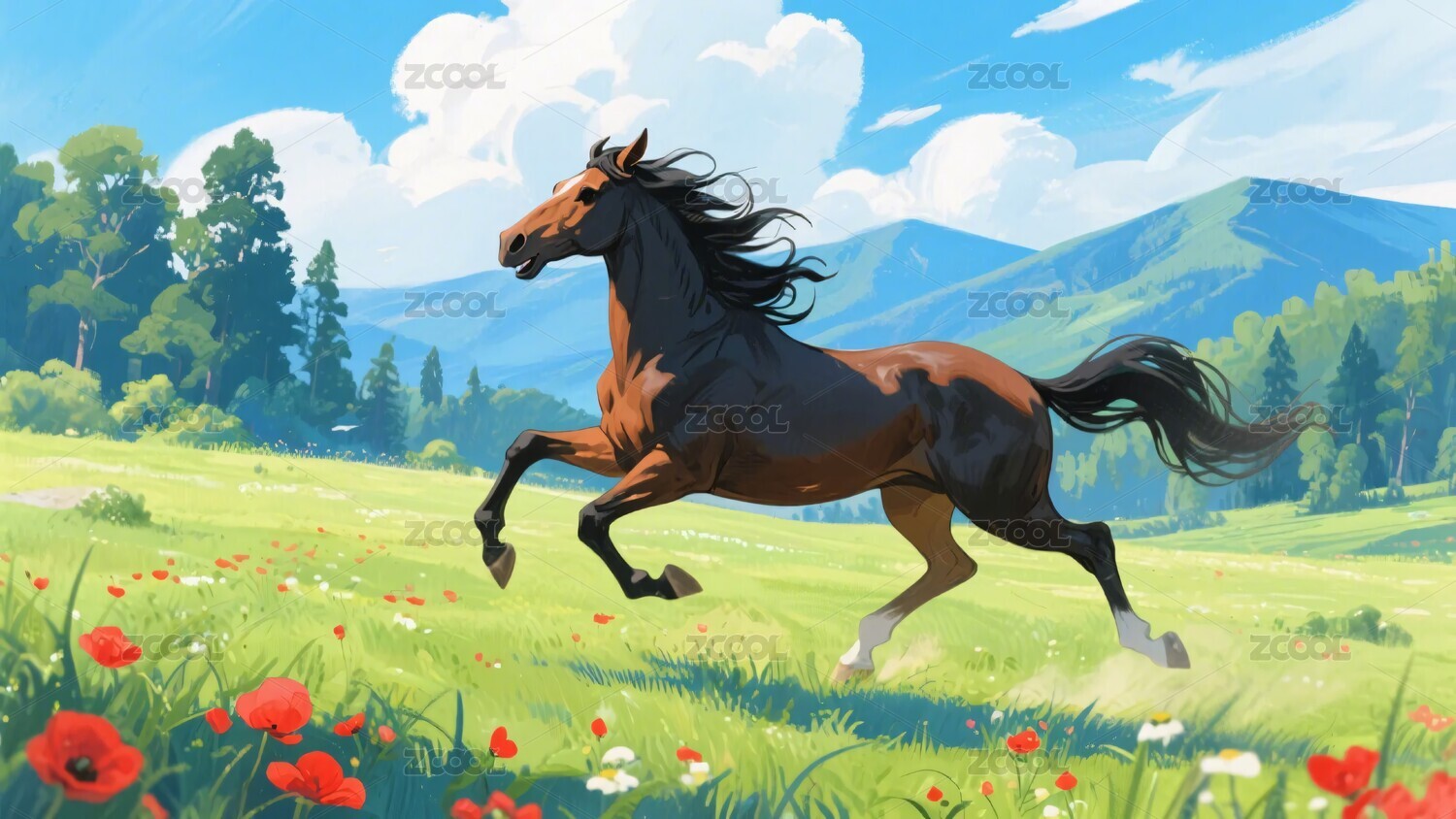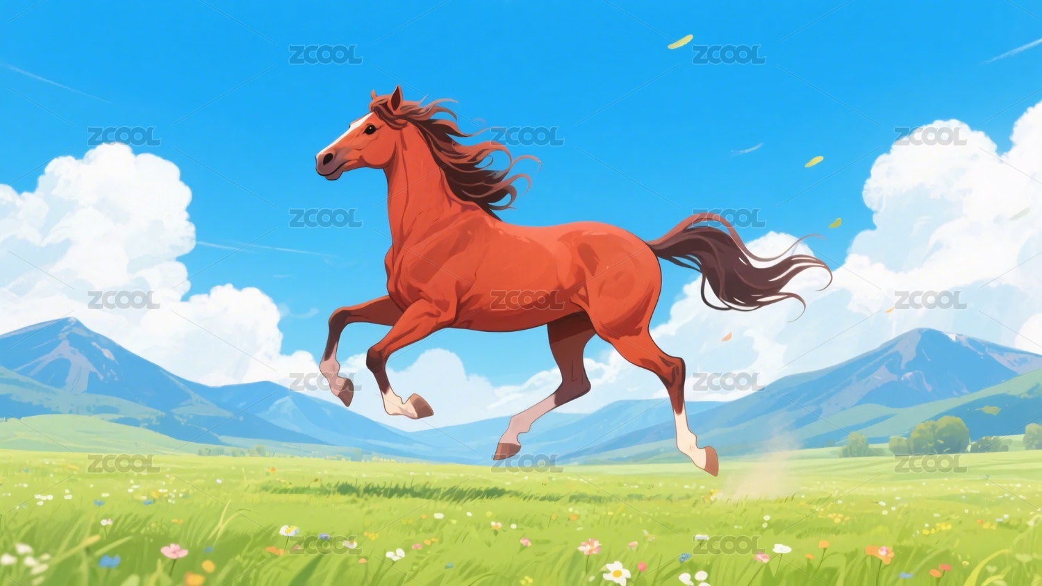 骏马,草原,蓝天,白云,远山,奔跑,插画,自然,风景,动物