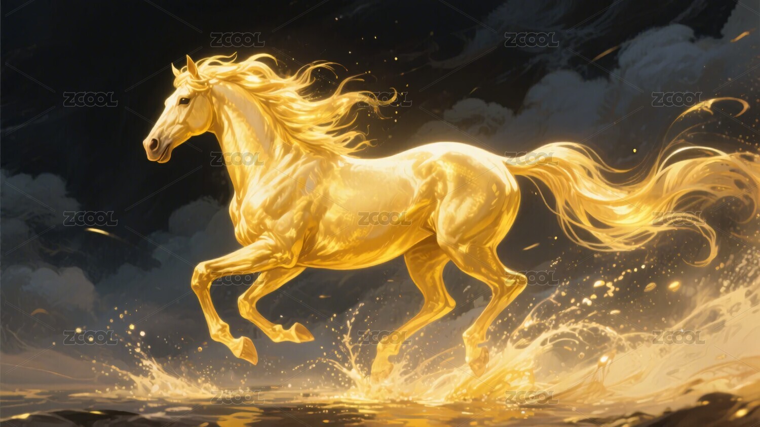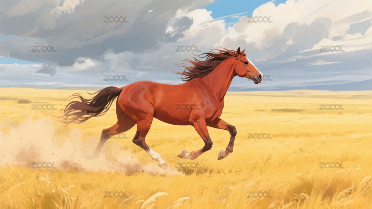 骏马,蓝天,白云,奔跑,插画,金色,动物,自然,元素,画面