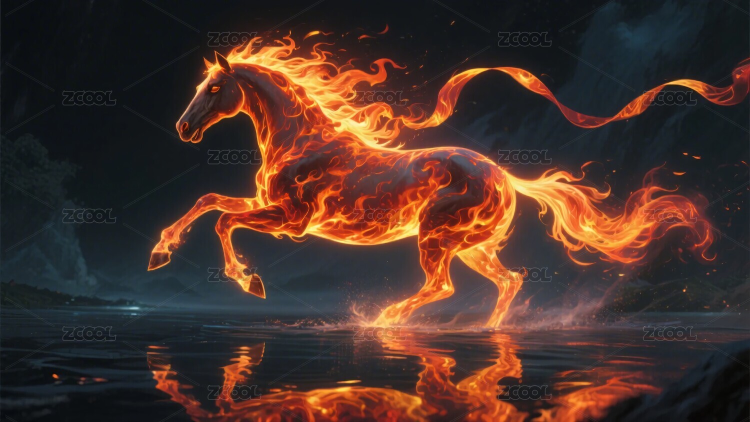 火焰骏马奔腾于水花间