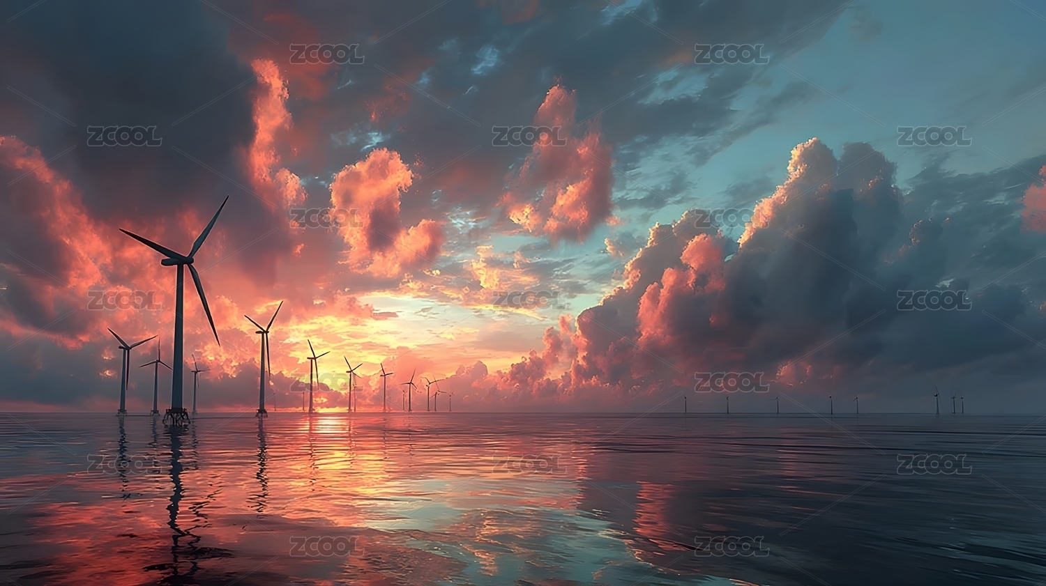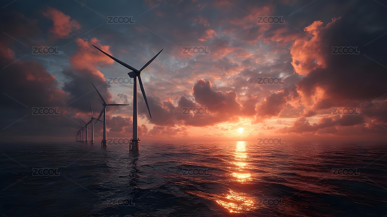 海上风力发电场日落美景