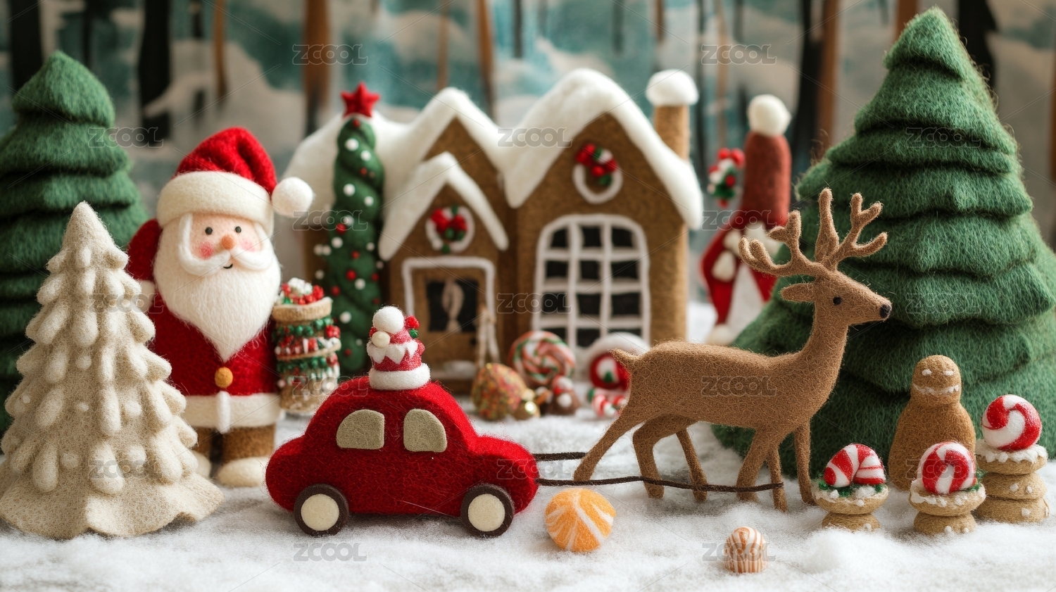 圣诞场景:雪地中的小屋、汽车与圣诞老人