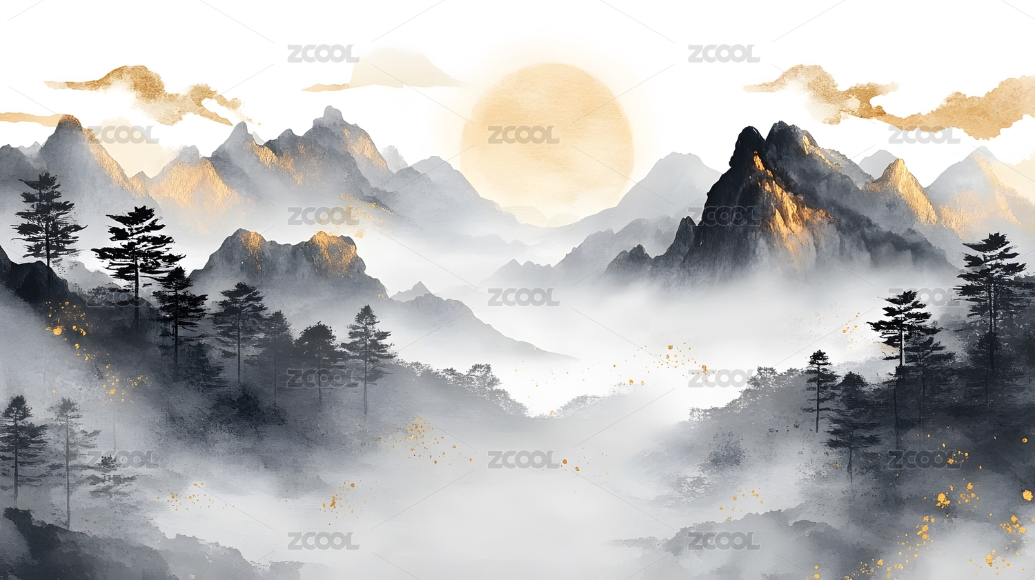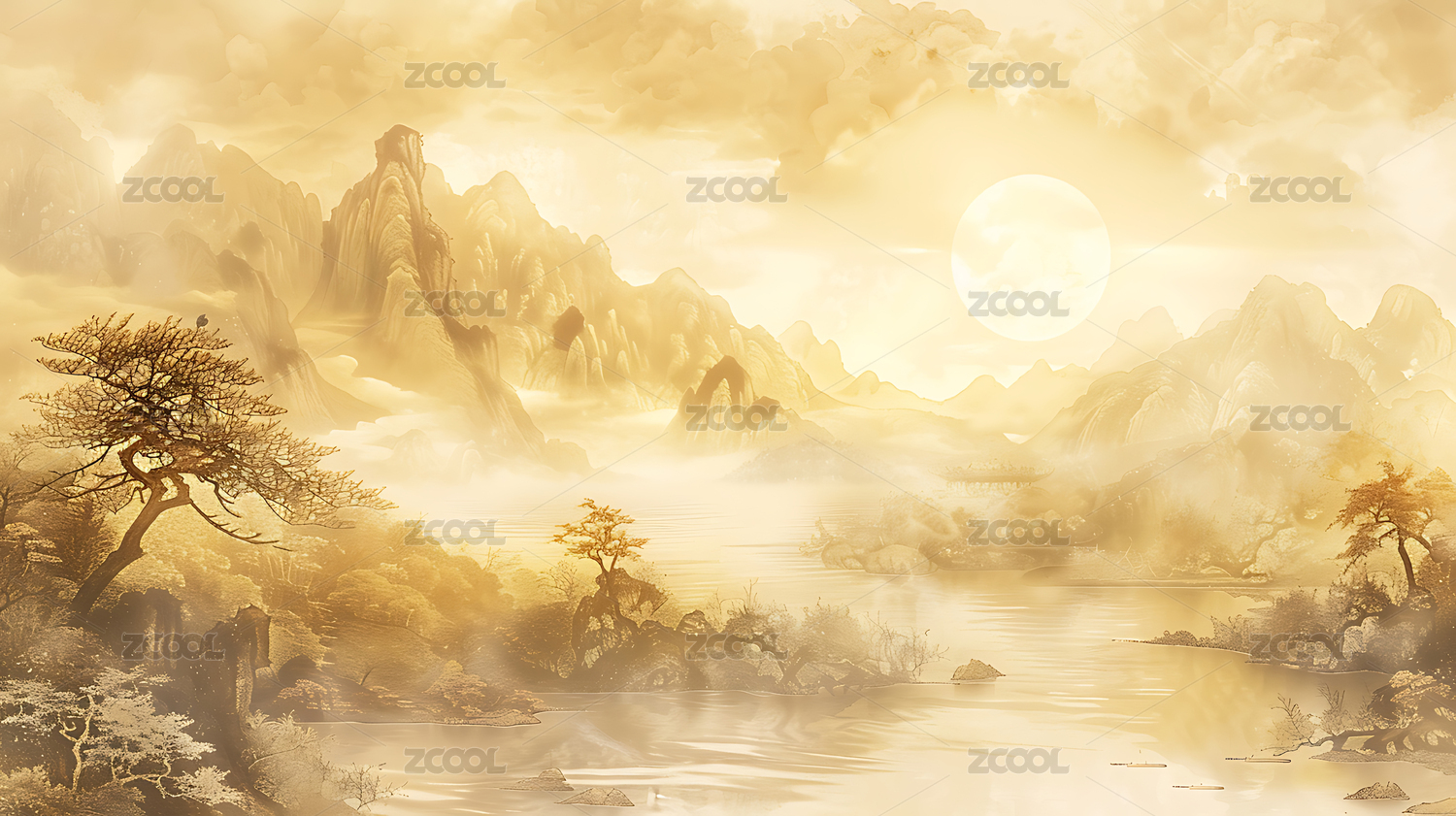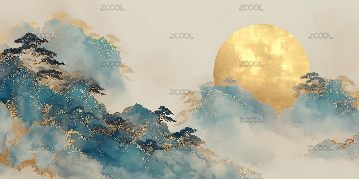 意境,艺术,树木,山峰,山水画,中国风,金色,云雾,朦胧,优雅