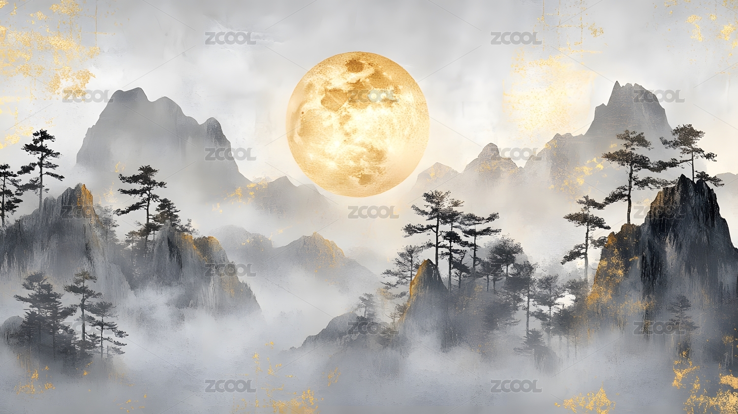 雾中山峦金月树林意境唯美