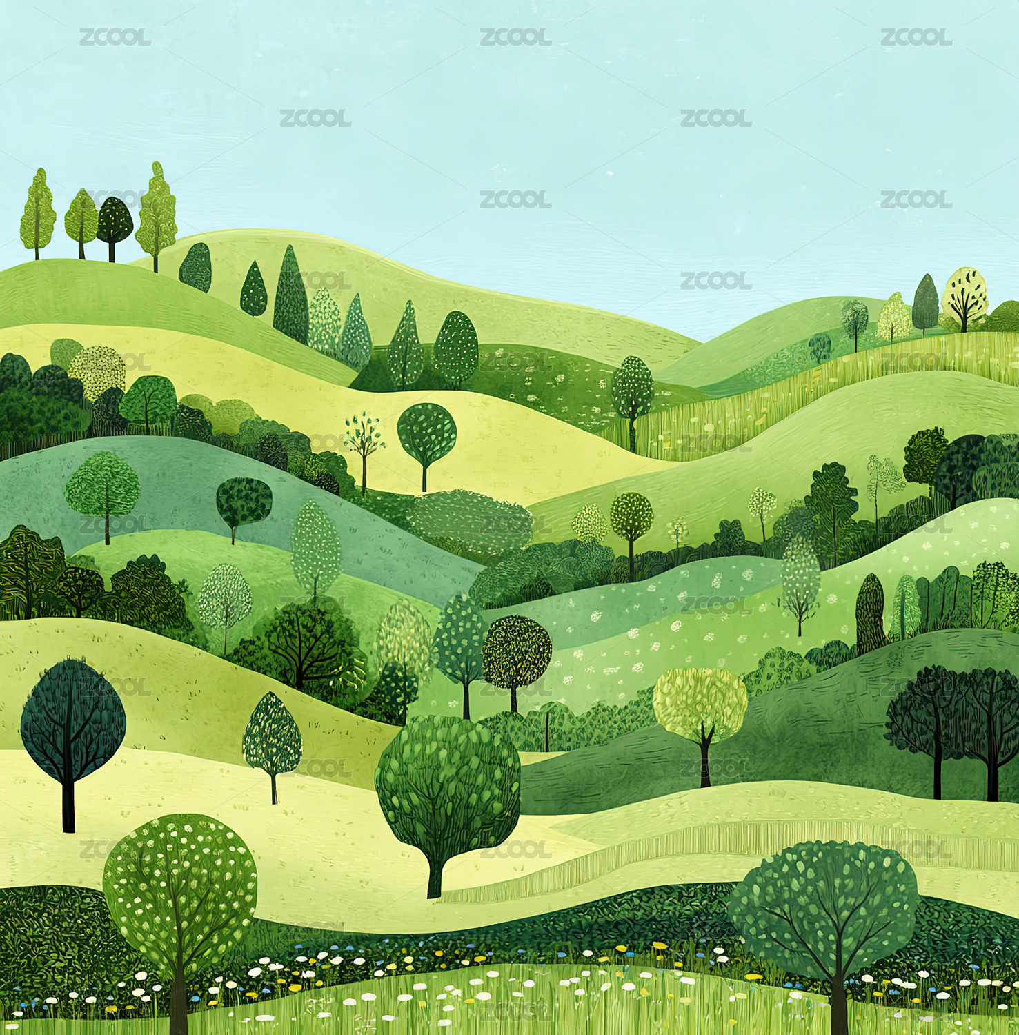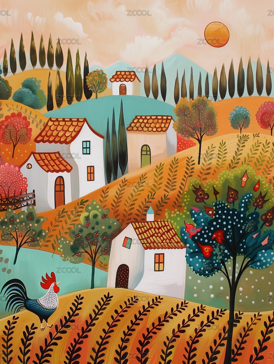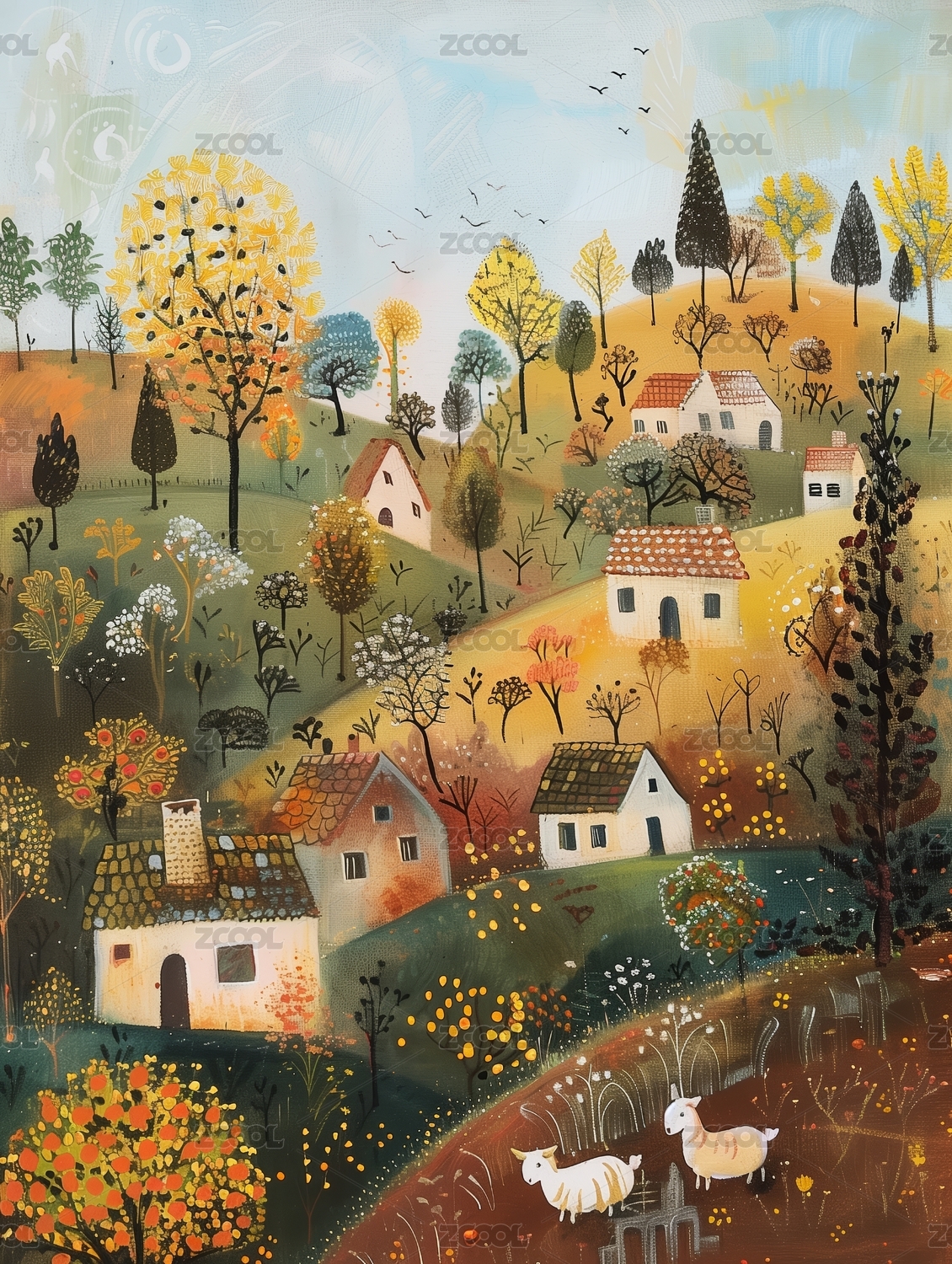 山,田野,田园,乡村,树,油画,水彩画,动物,羊,狗