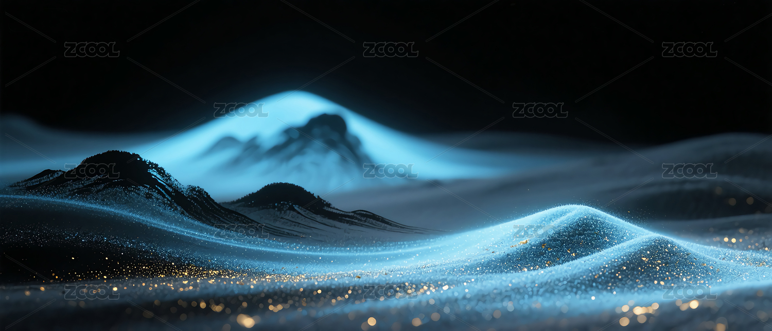 蓝色弥散光影与水墨山水背景