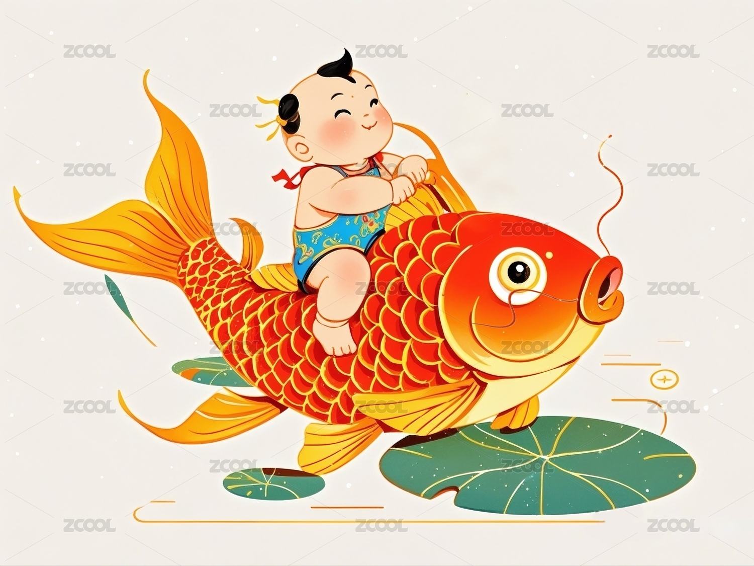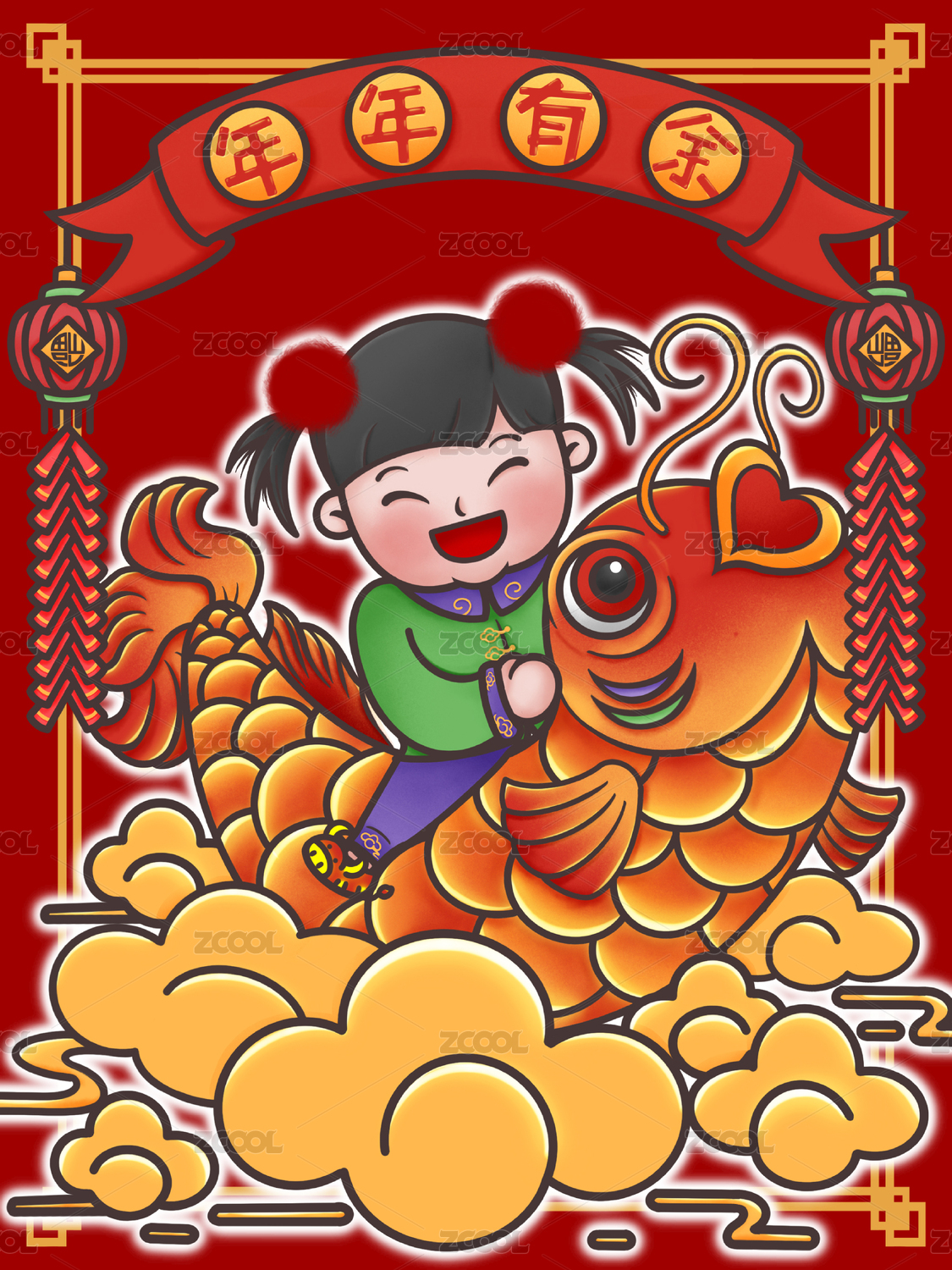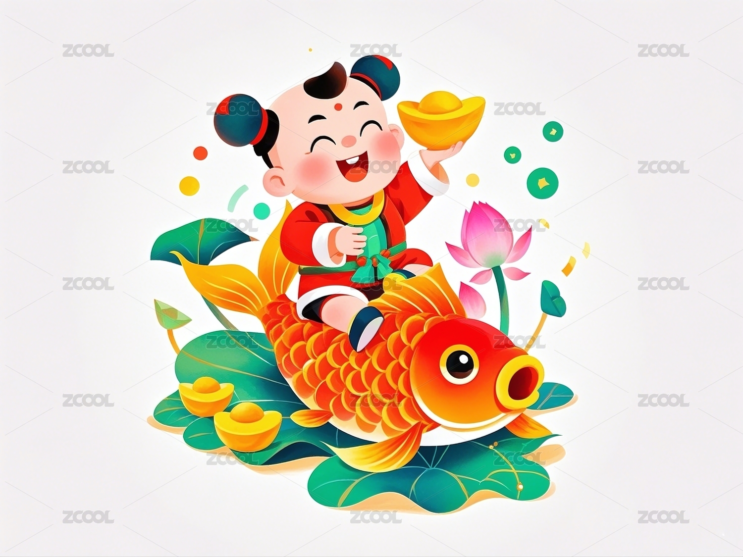 国潮喜庆新年春节骑锦鲤戴兔帽的福娃元素