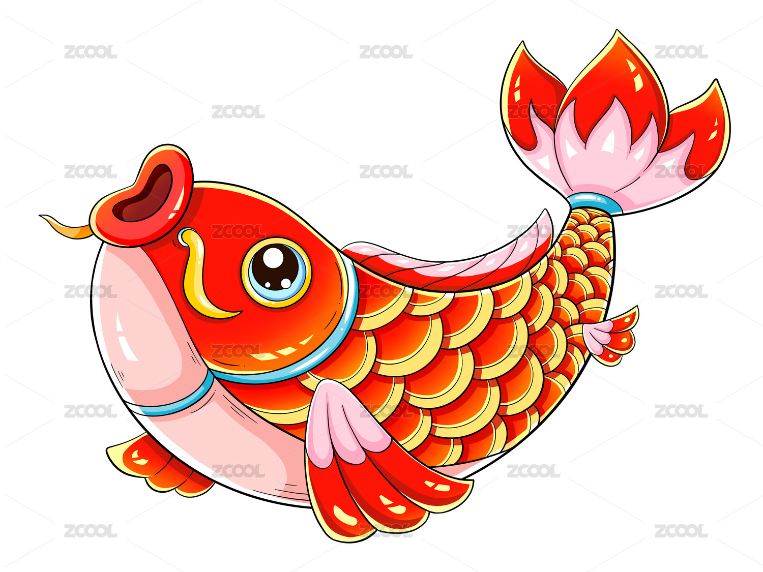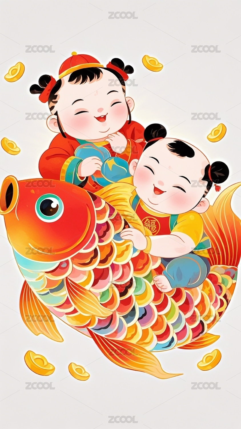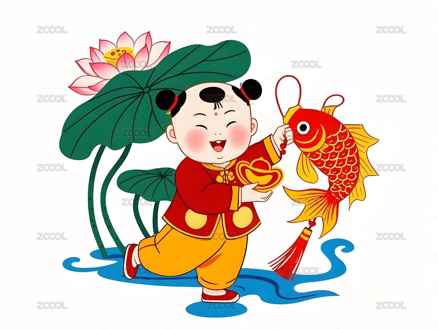 国潮喜庆新年春节骑锦鲤戴兔帽的福娃元素