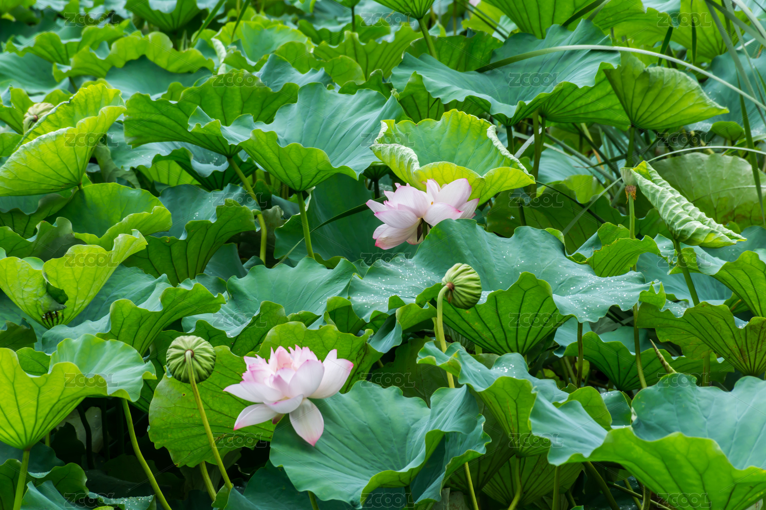 荷塘里美丽盛开的荷花花苞与大片荷叶背景素