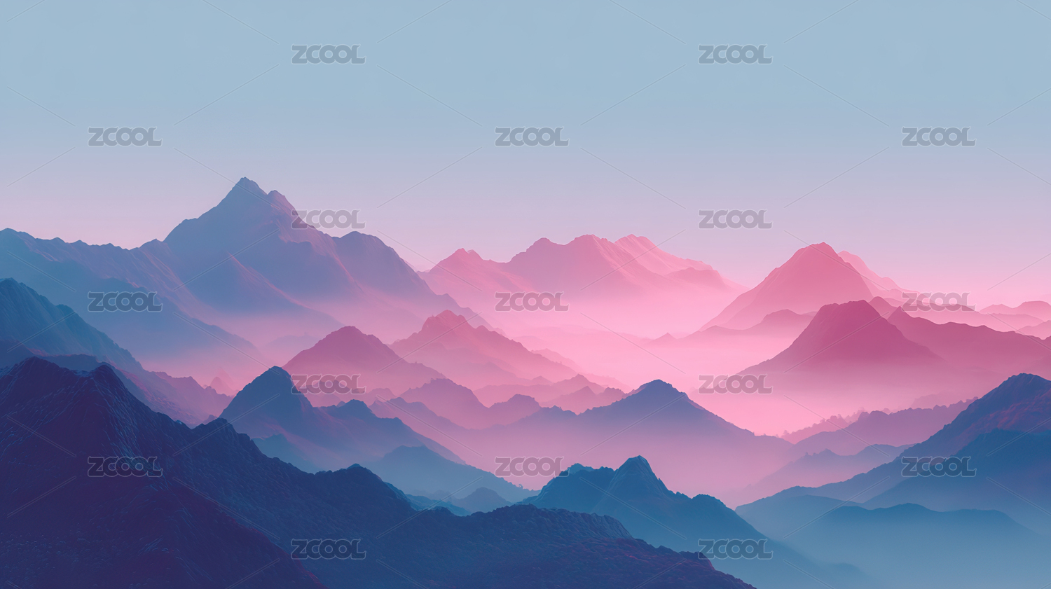 粉紫渐变天空下群山层叠呈现梦幻清新的插画