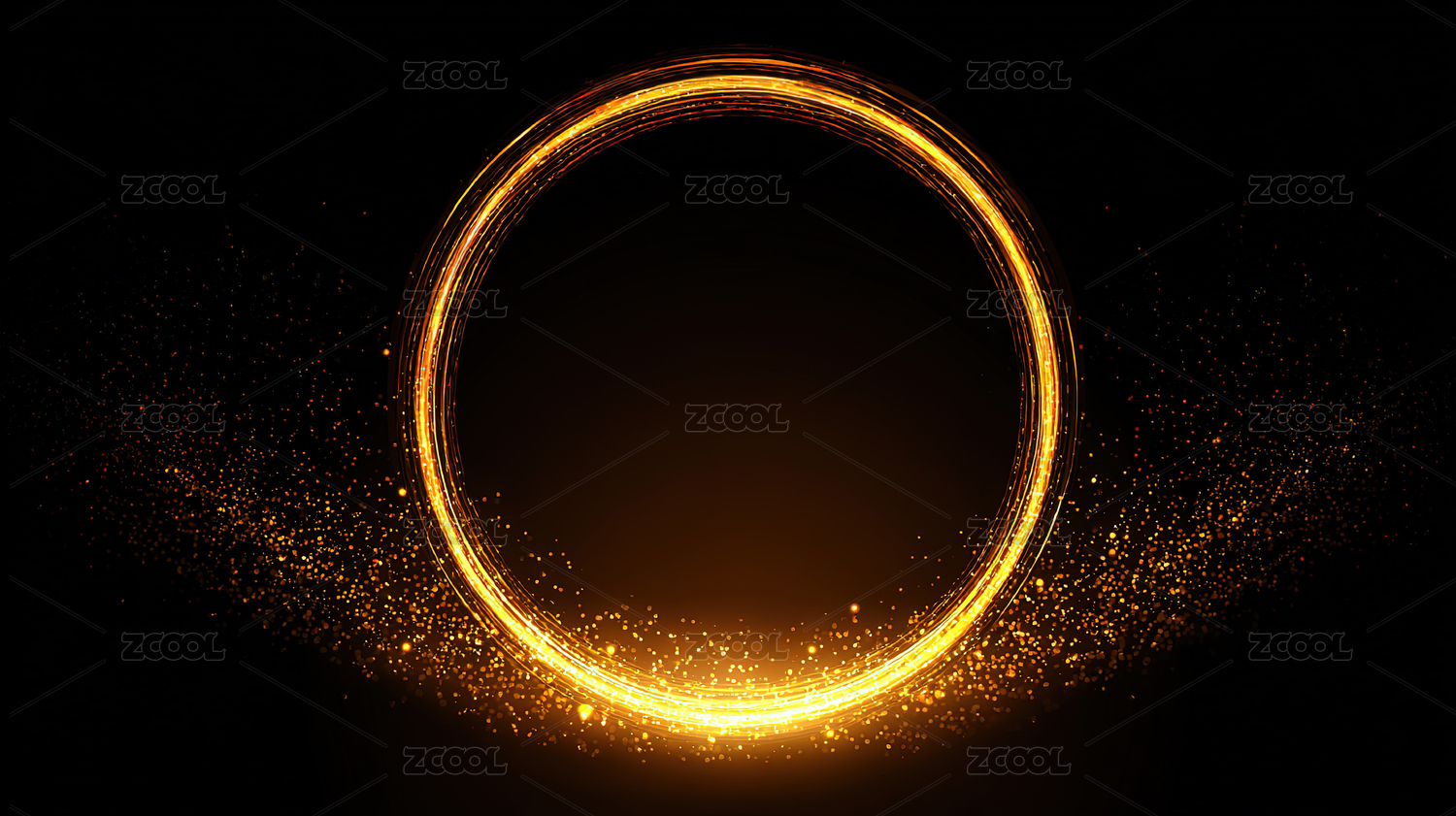 黑色背景上闪耀的金色圆环与闪亮光芒