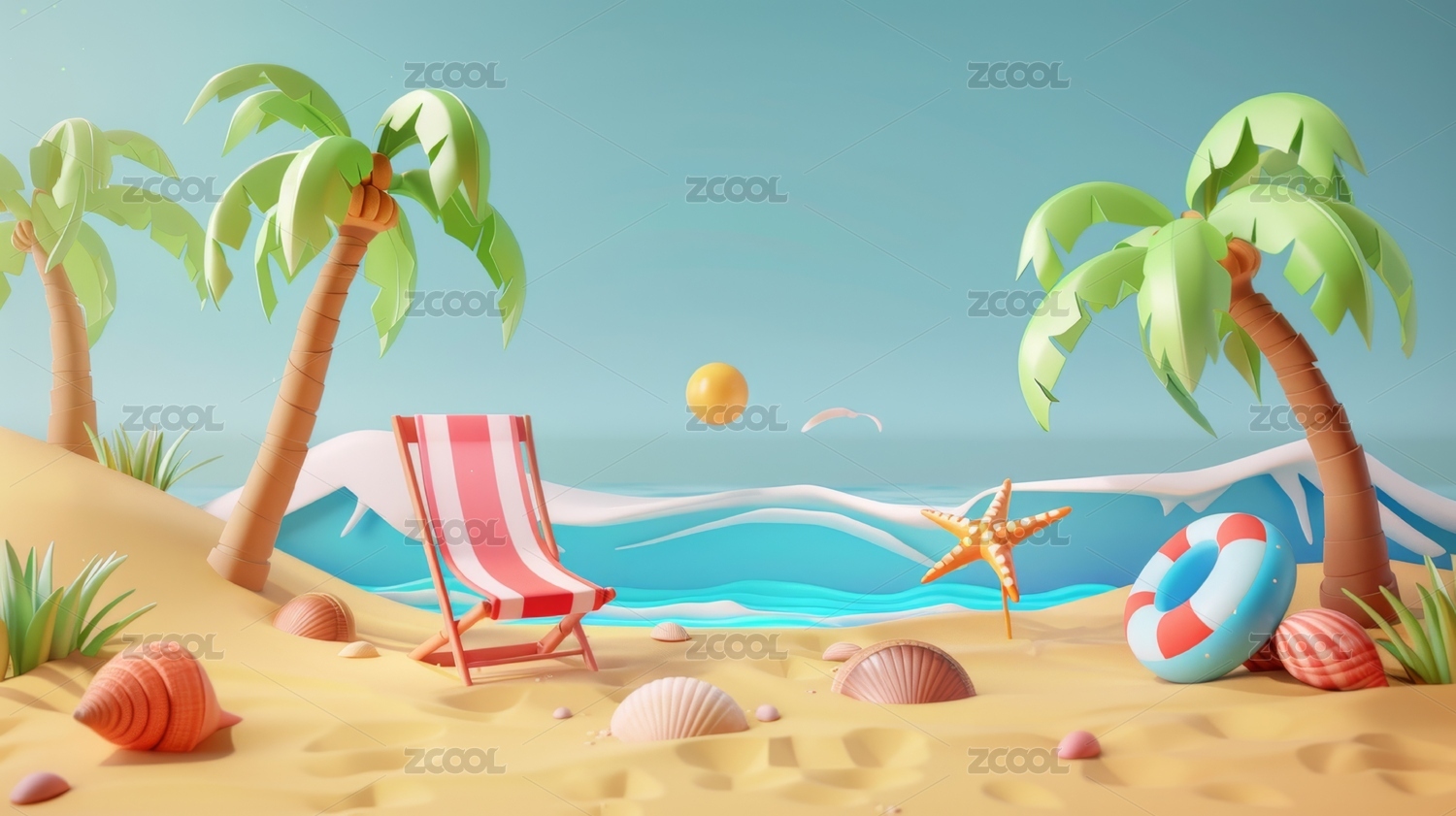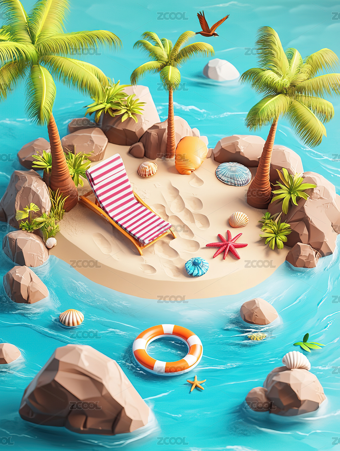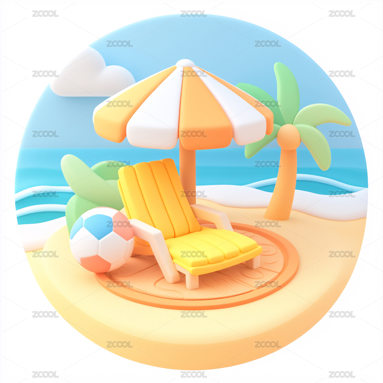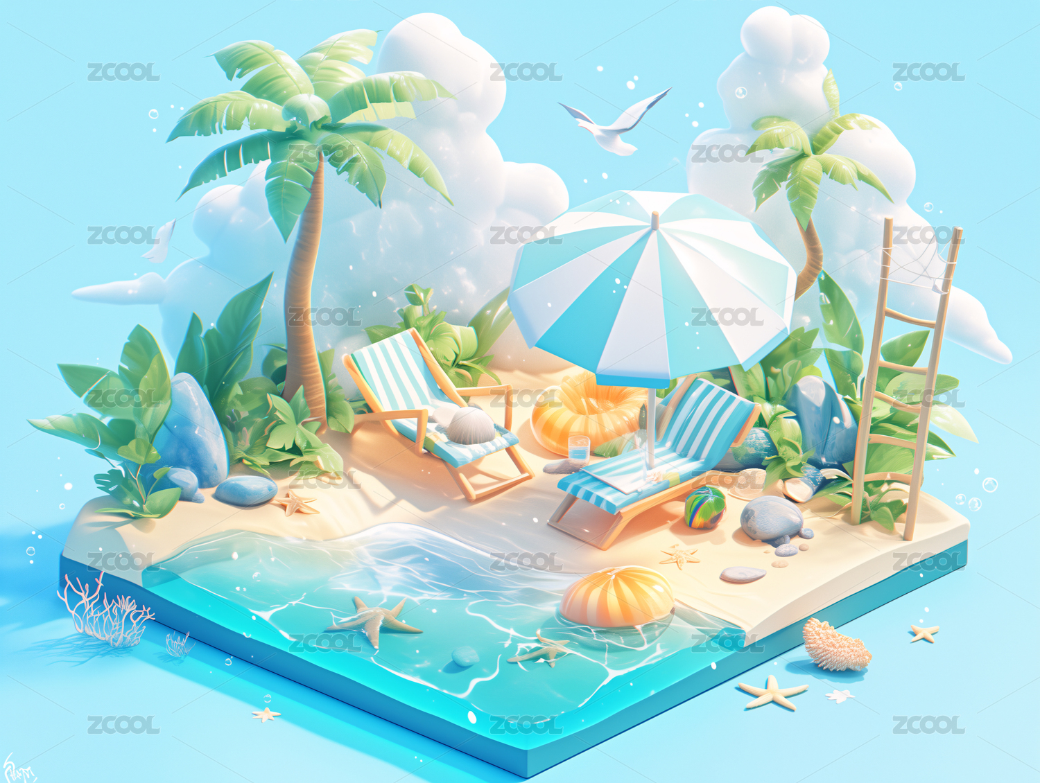 夏日海边沙滩度假出游夏季海滩清新3D插画