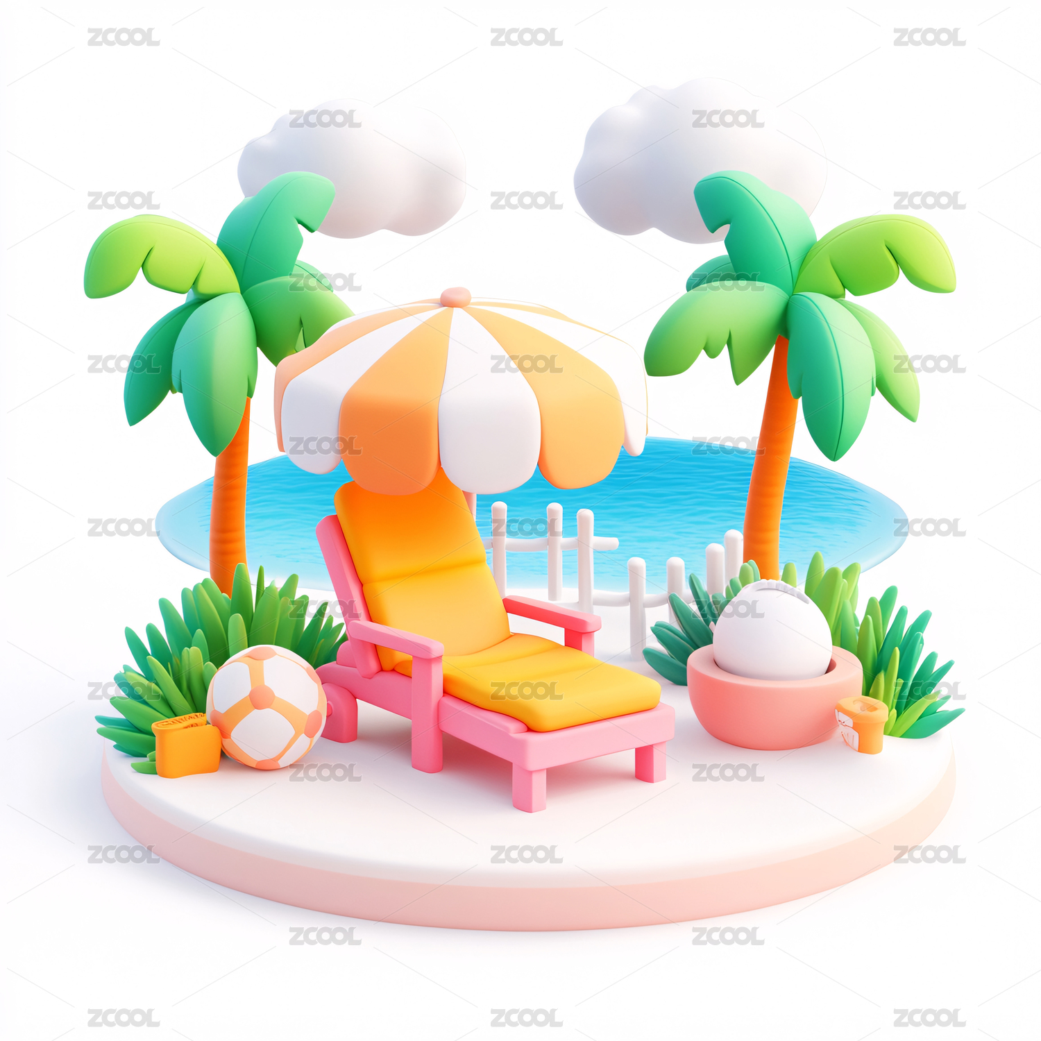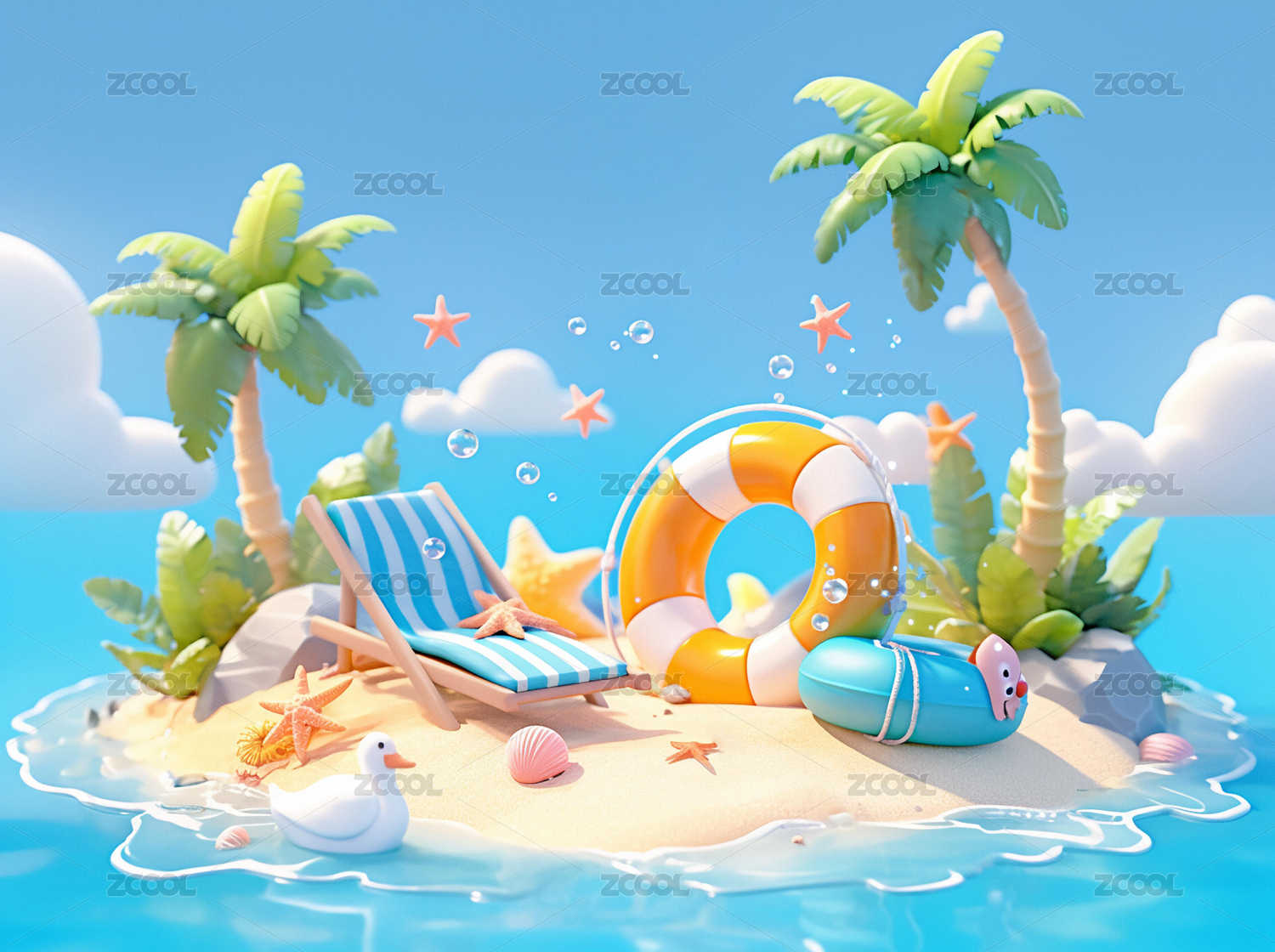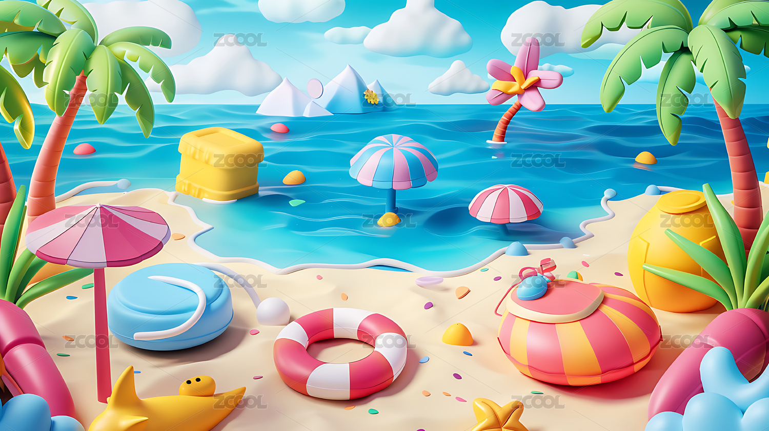夏日海边沙滩度假出游夏季海滩清新3D插画