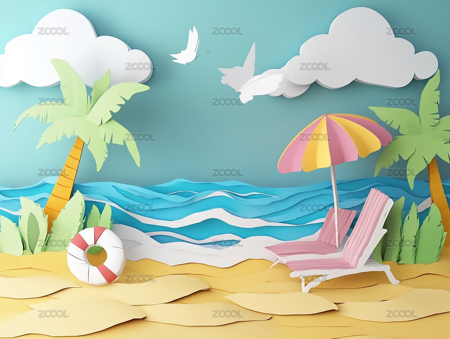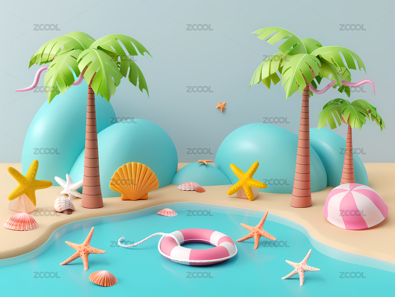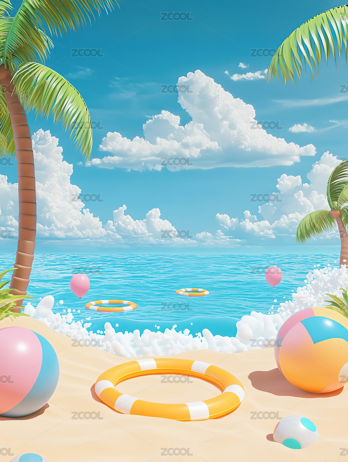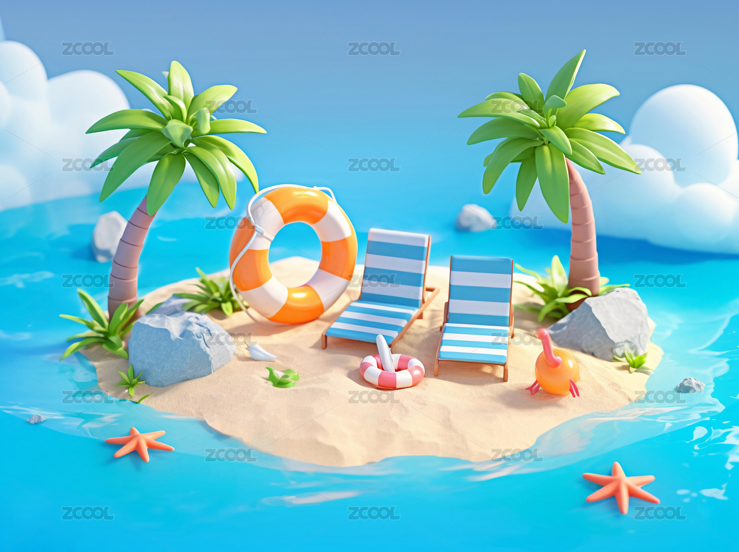 夏日海边沙滩度假出游夏季海滩清新3D插画