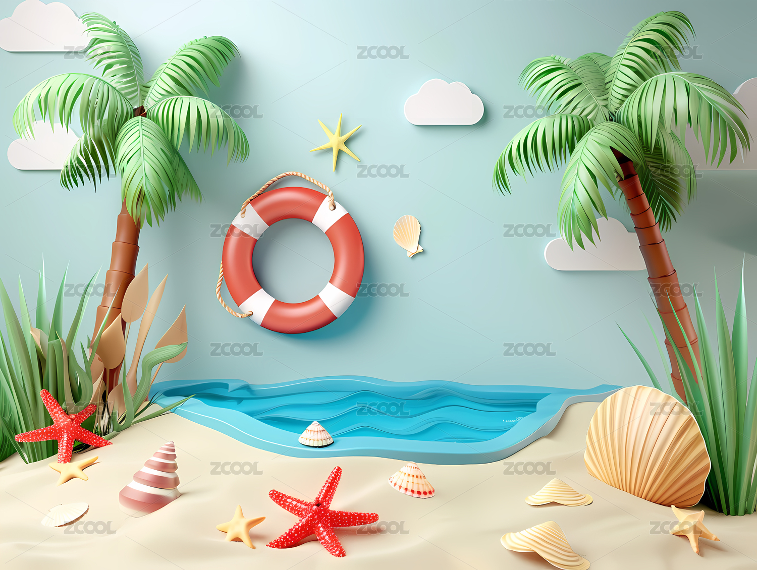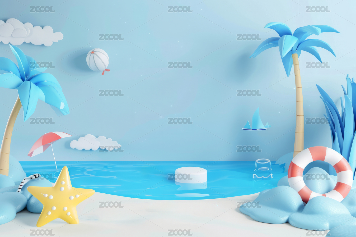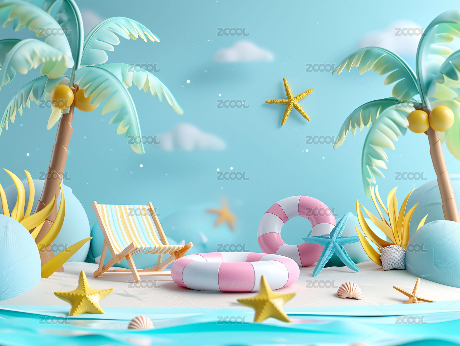 夏日度假概念沙滩上的游泳圈遮阳伞3D背景