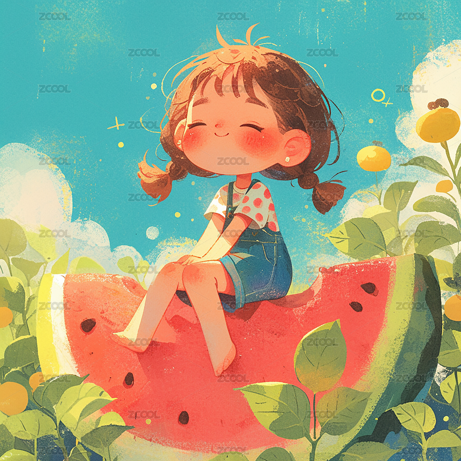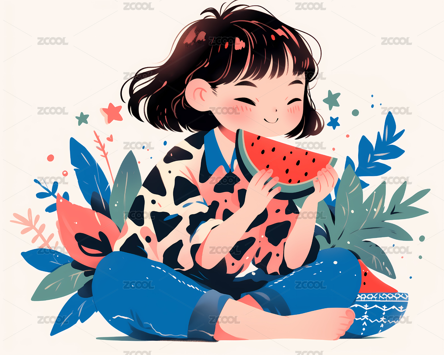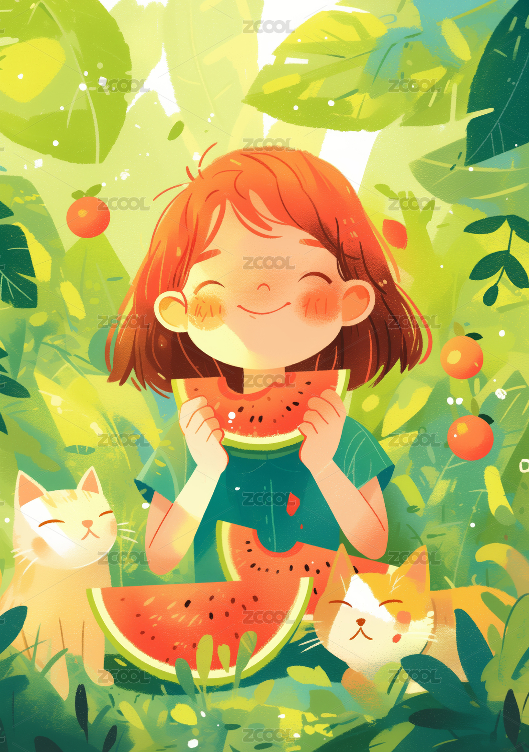 一个可爱的小女孩吃西瓜绿叶夏季插画