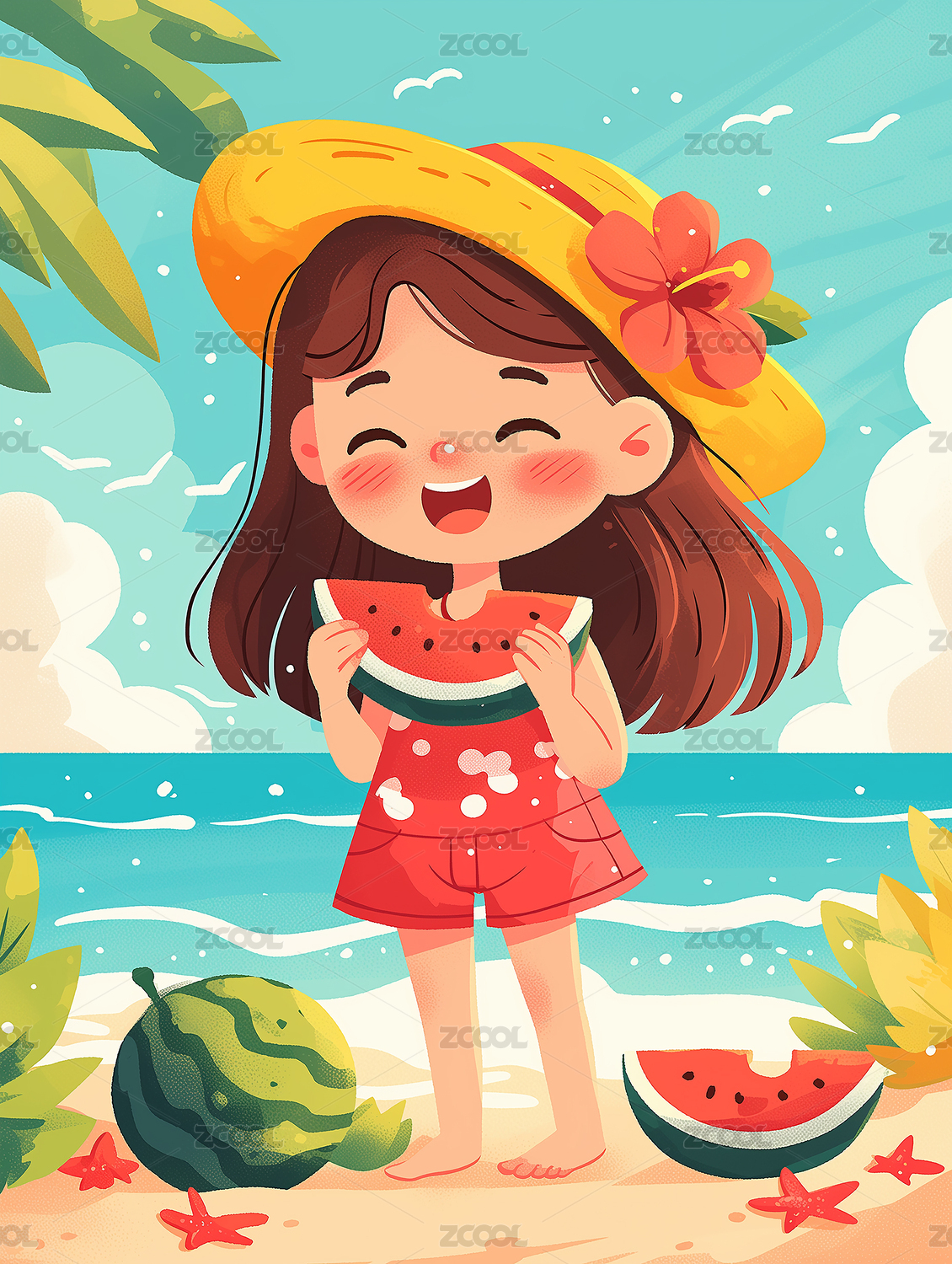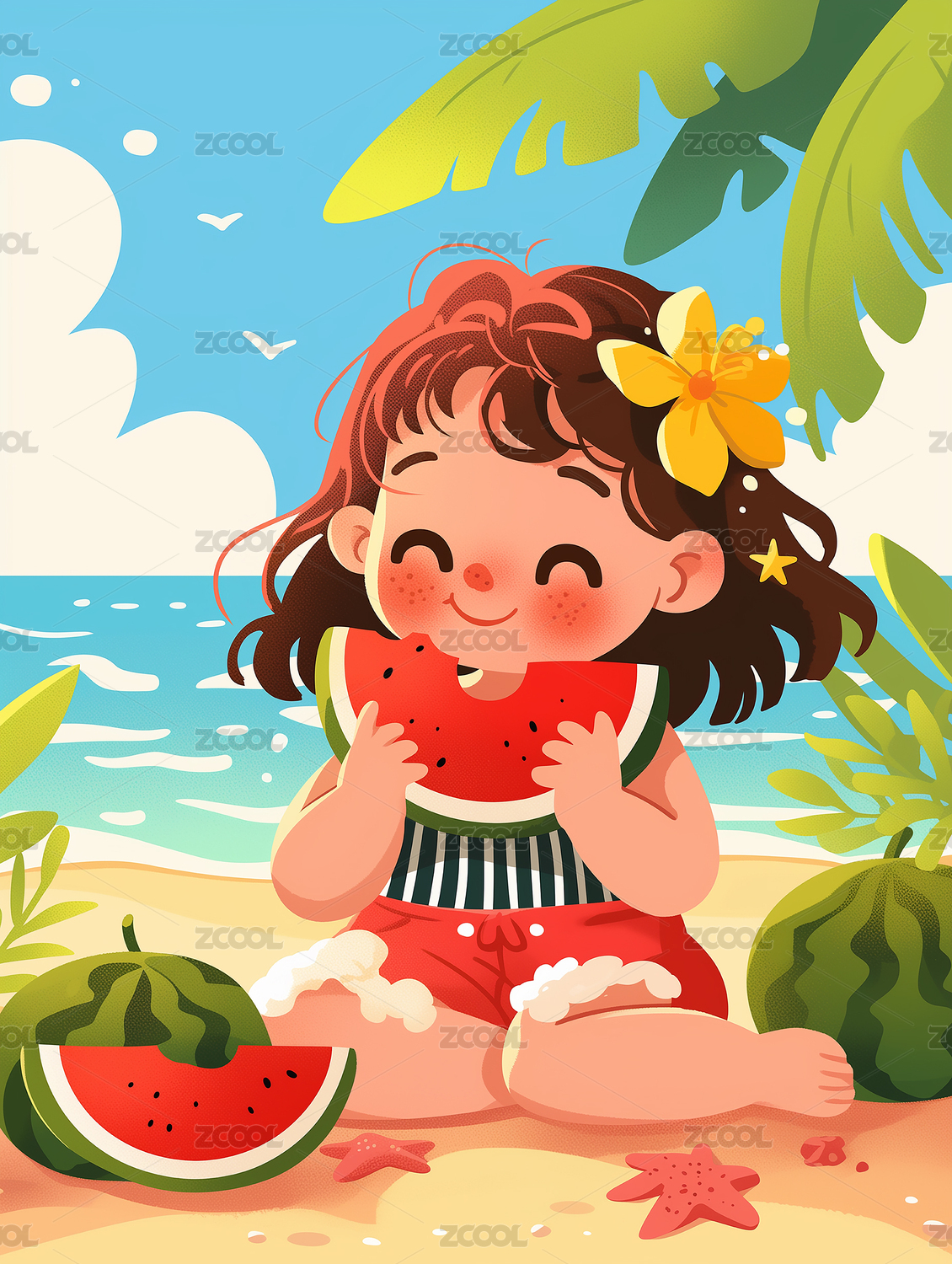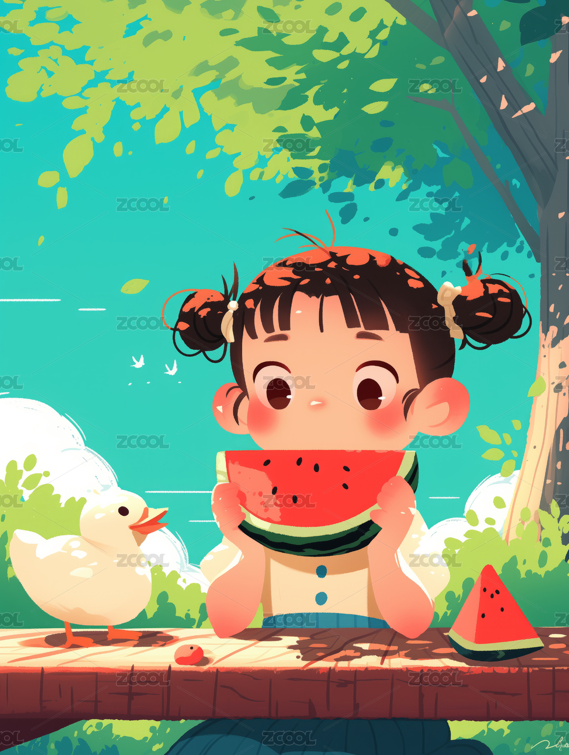 一个可爱的小女孩吃西瓜绿叶夏季插画