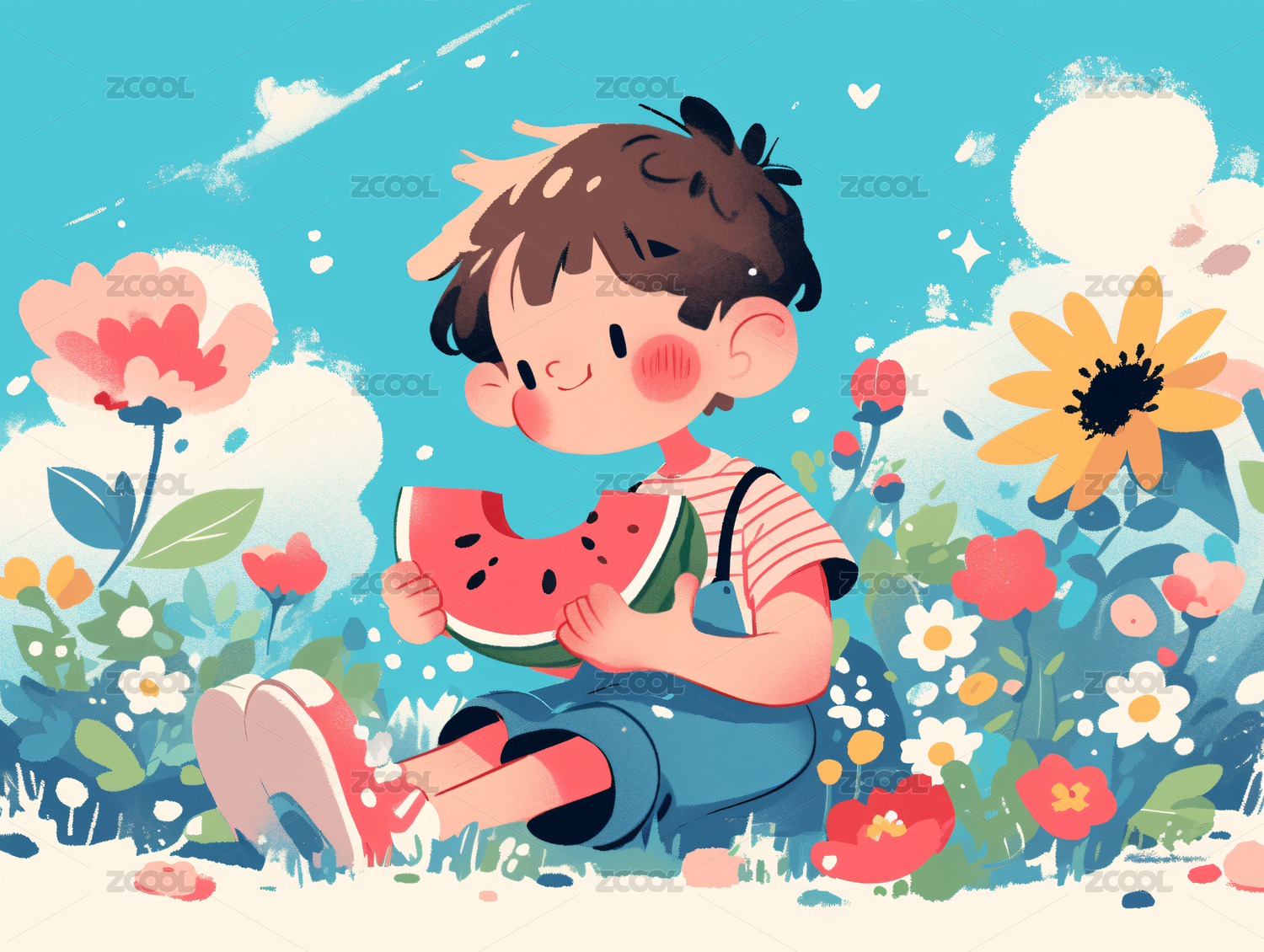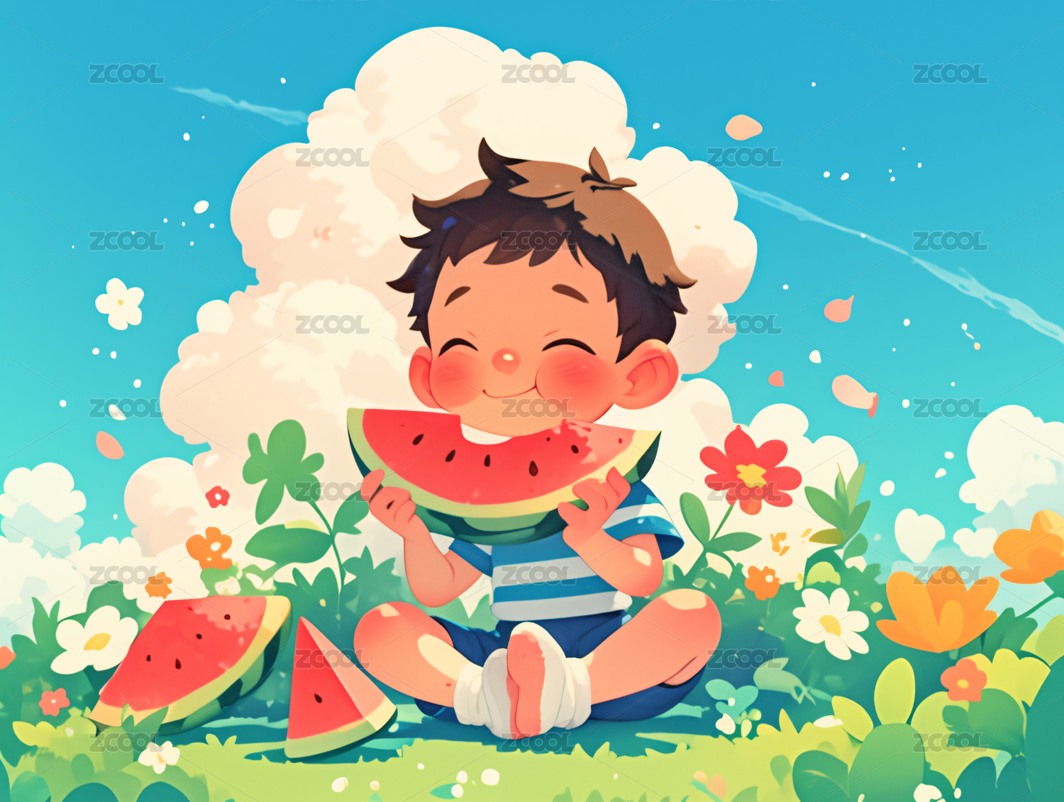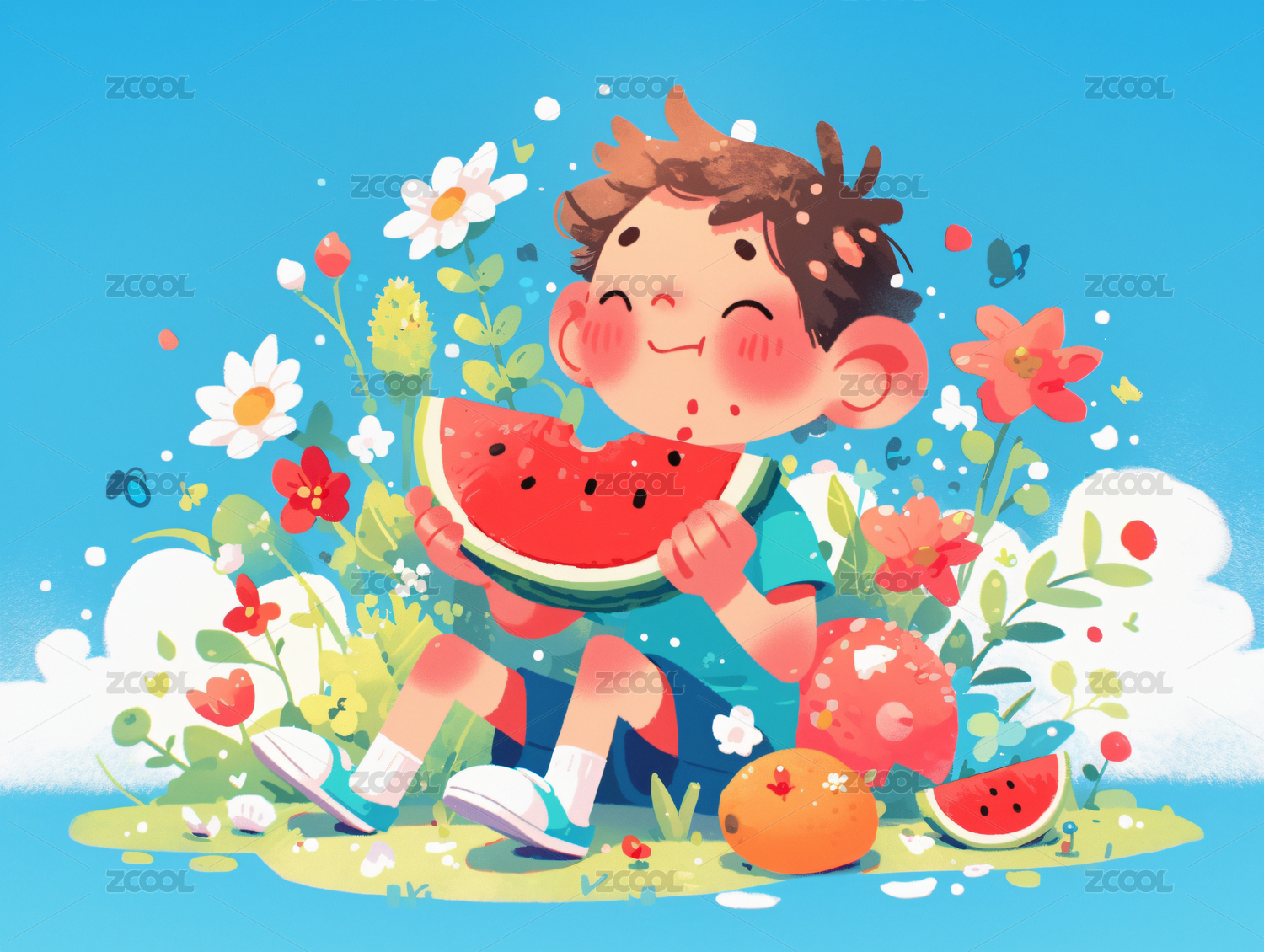 夏天吃西瓜的可爱儿童孩子卡通插画