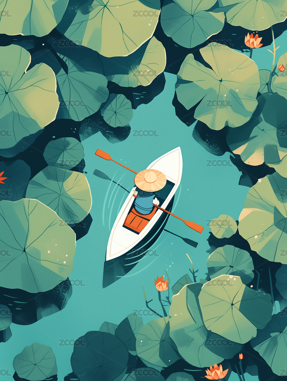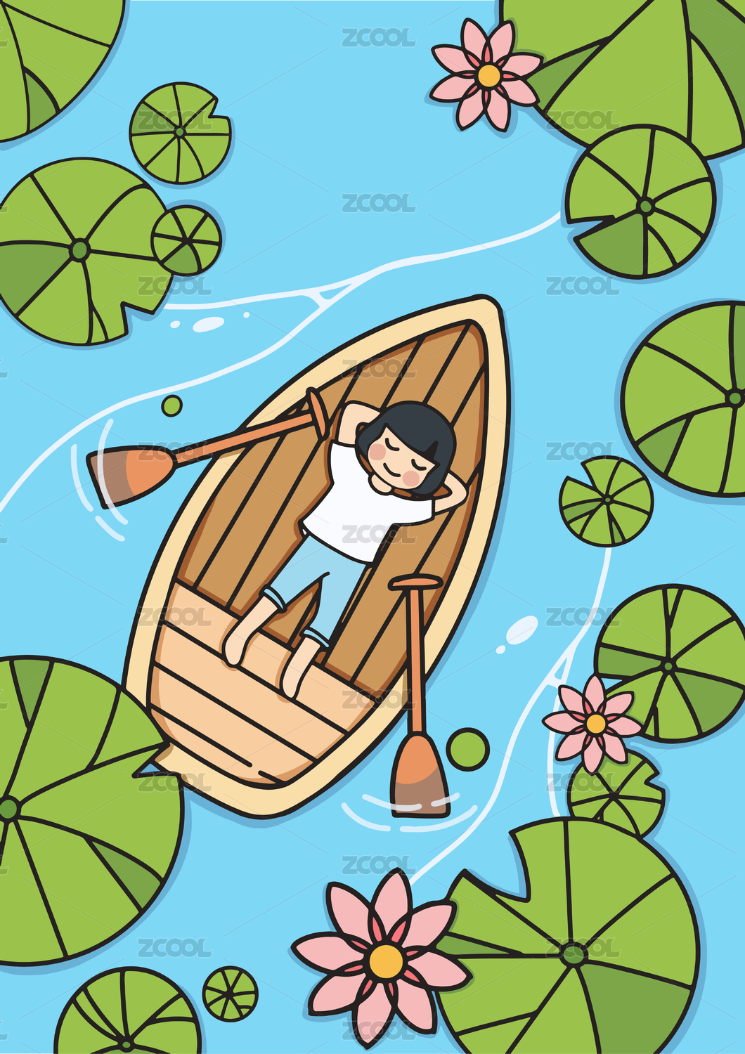女孩乘坐西瓜船在湖里玩耍 大暑插画