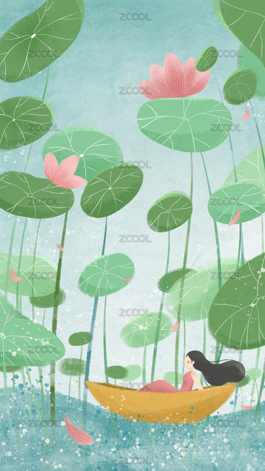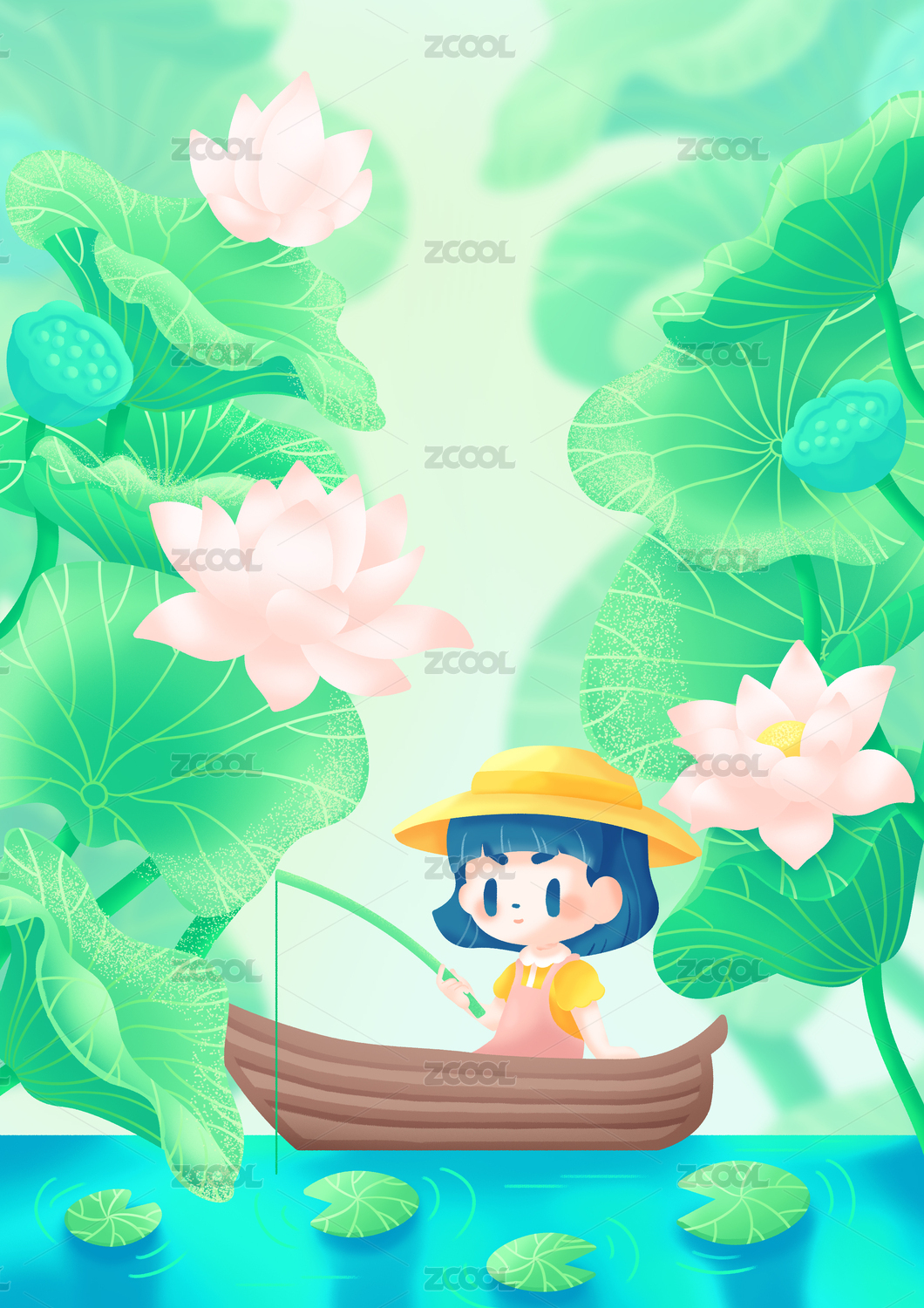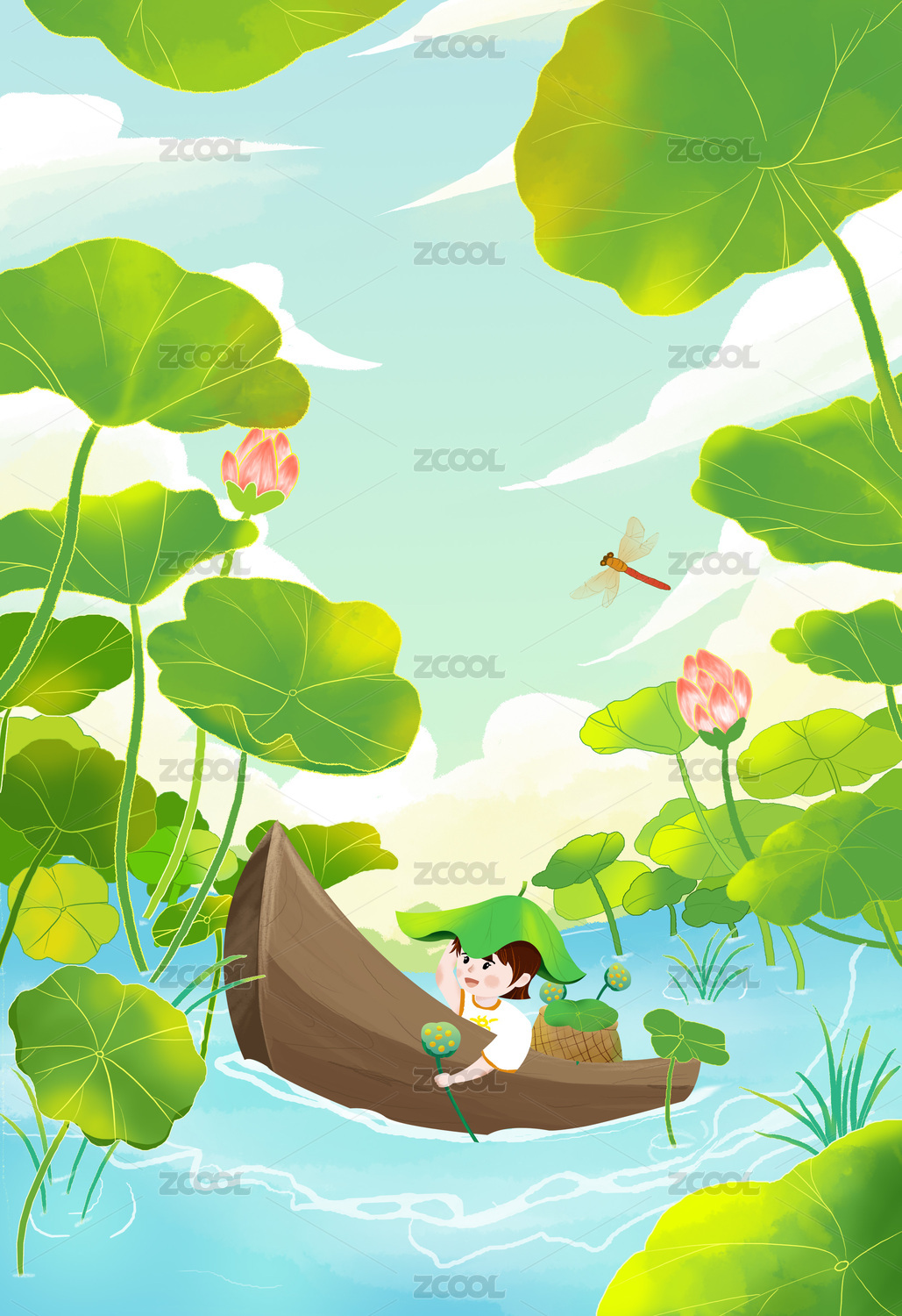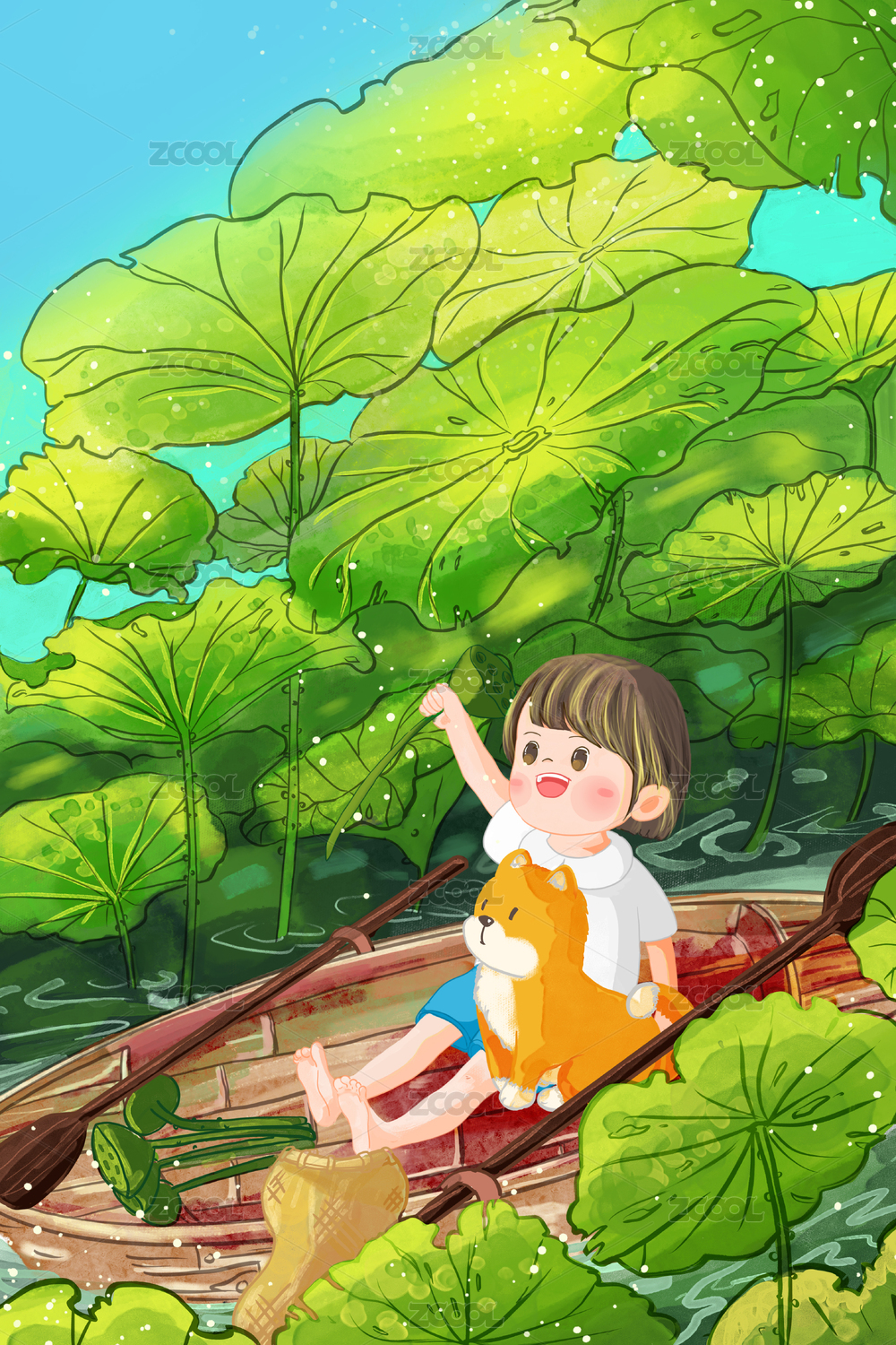 二十四节气小暑夏天荷塘童年回忆手绘插画