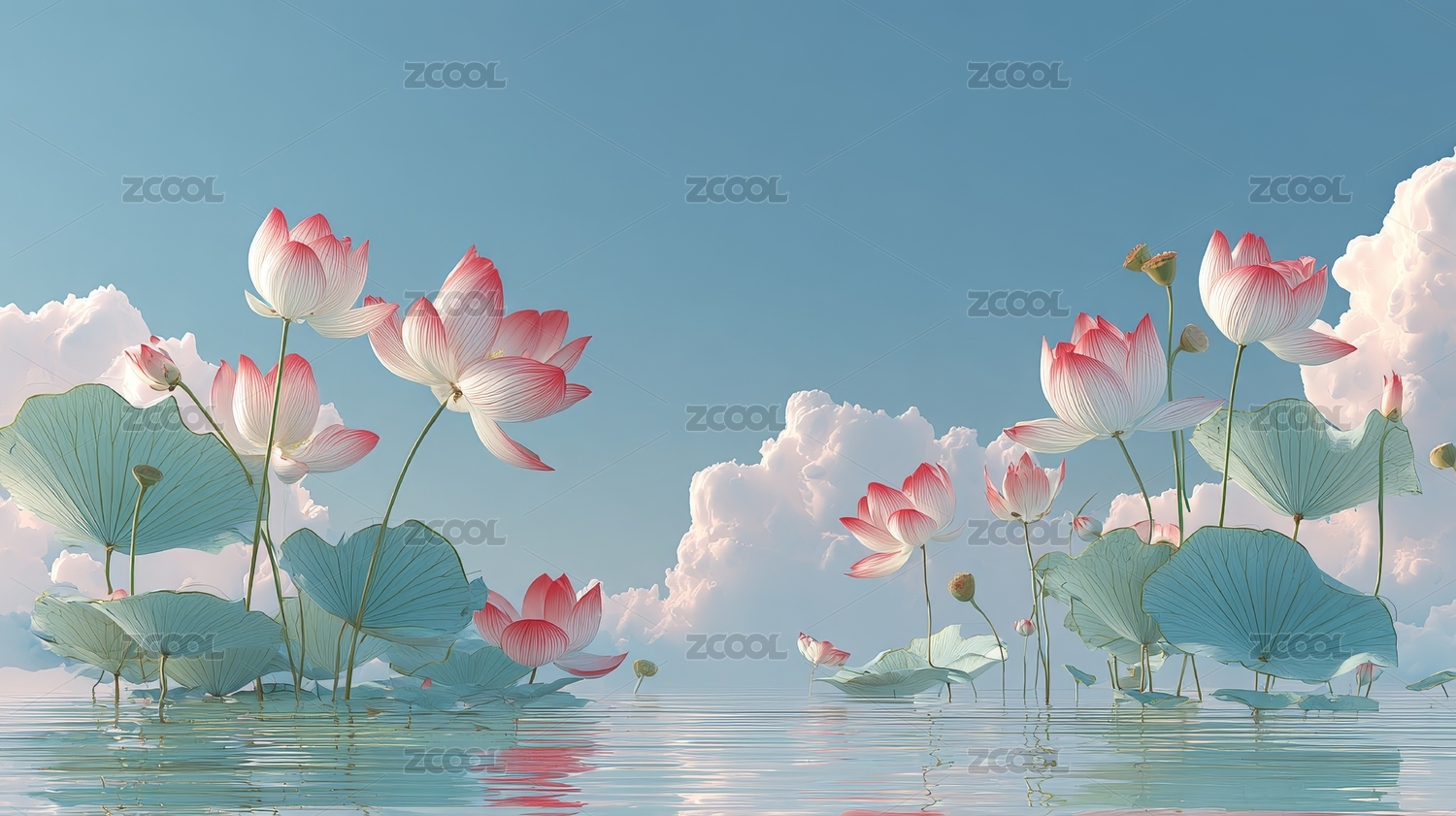 蓝天白云下平静水面上的粉色荷花
