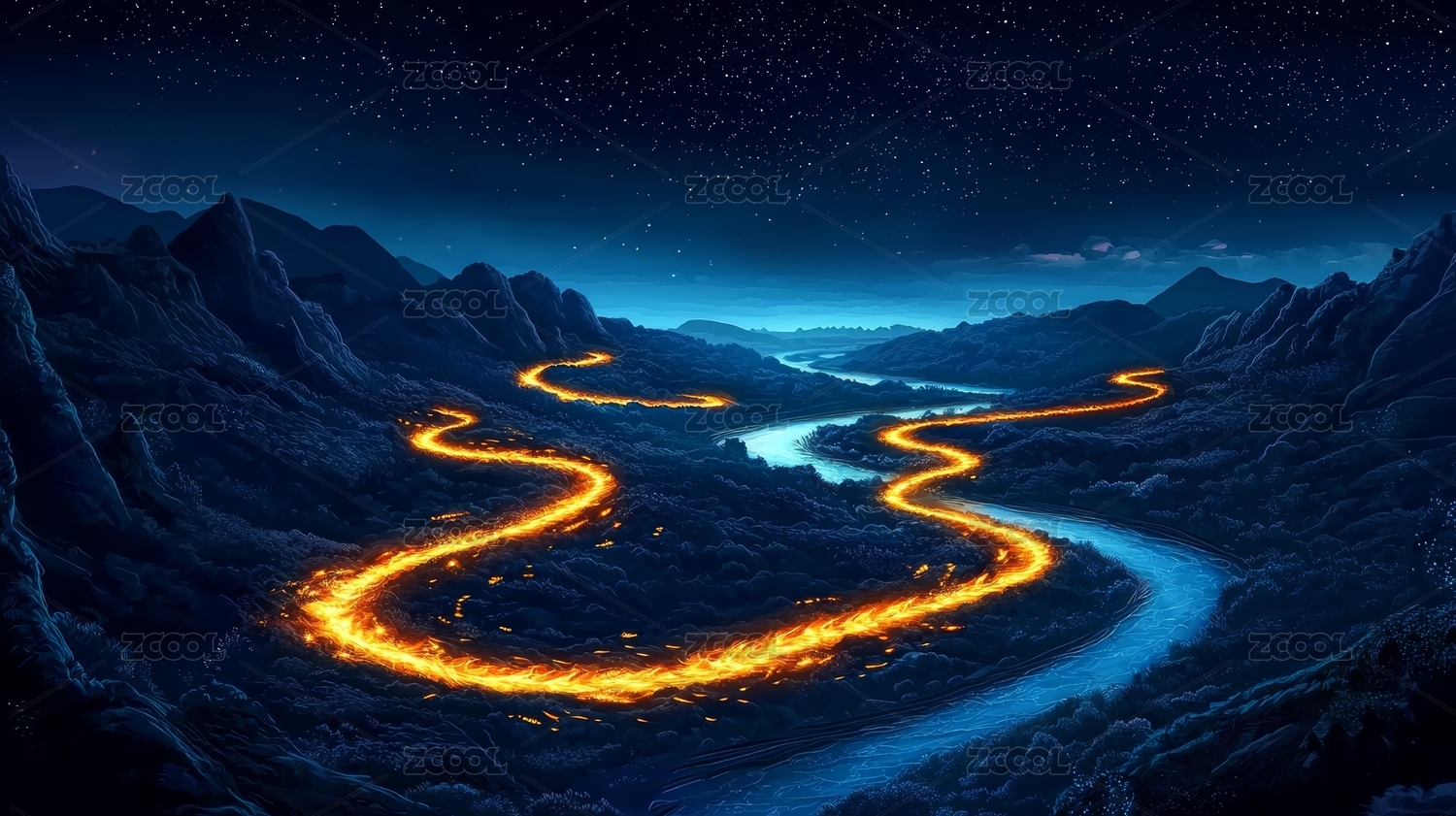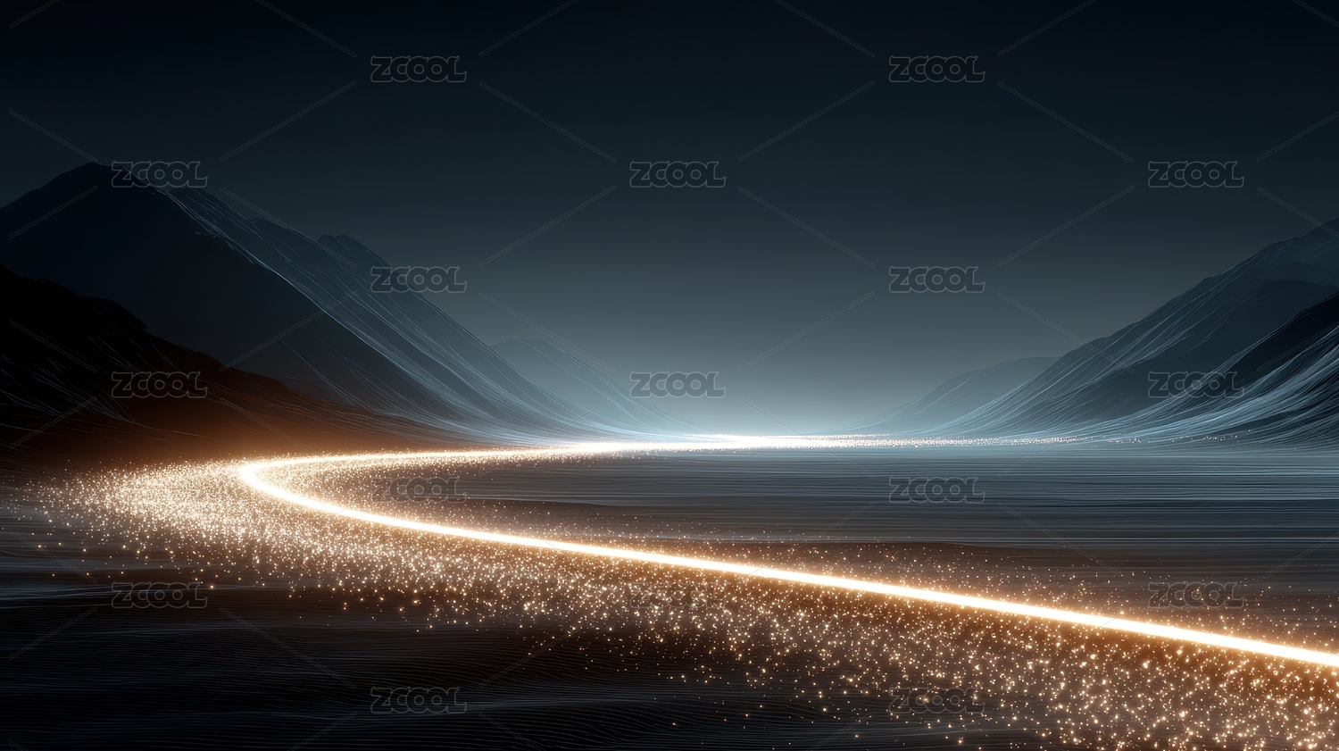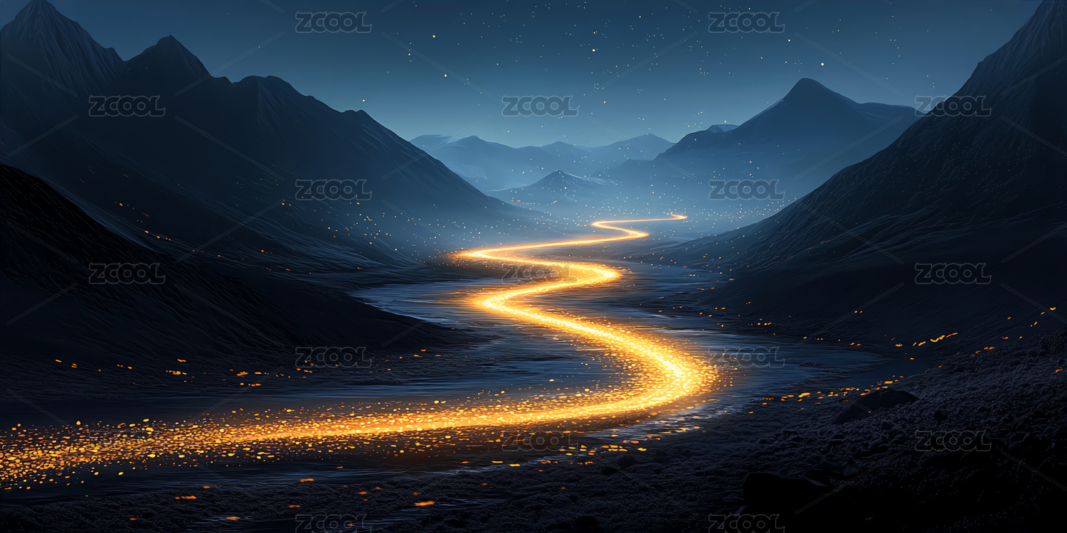 金色,河流,背景,山谷,高山,夜空,弯曲,蜿蜒,光轨,粒子